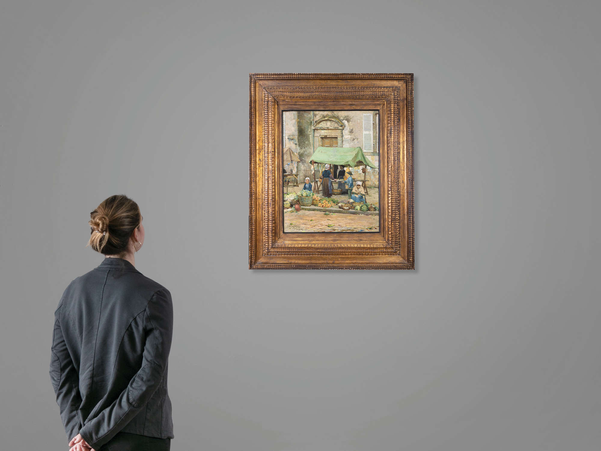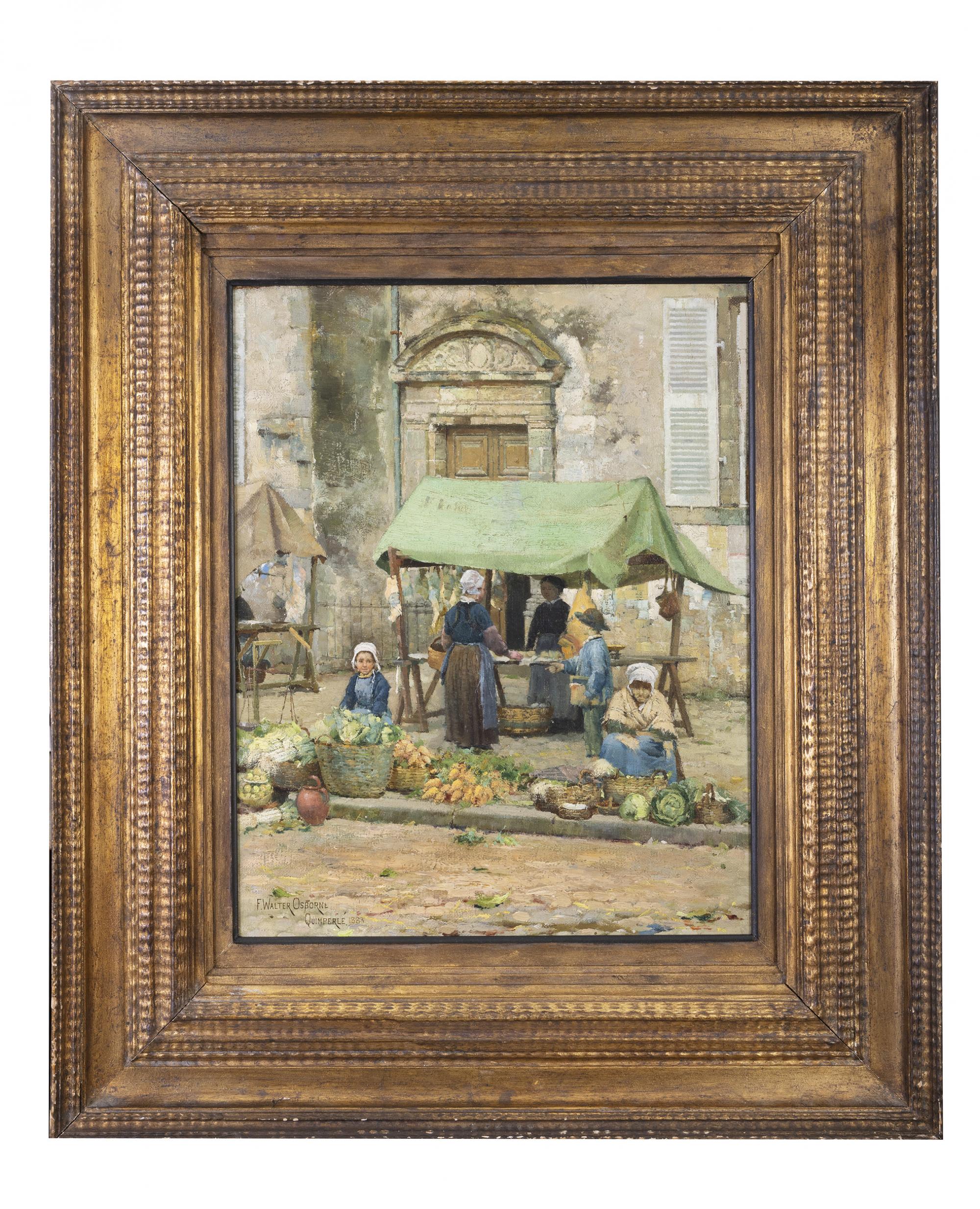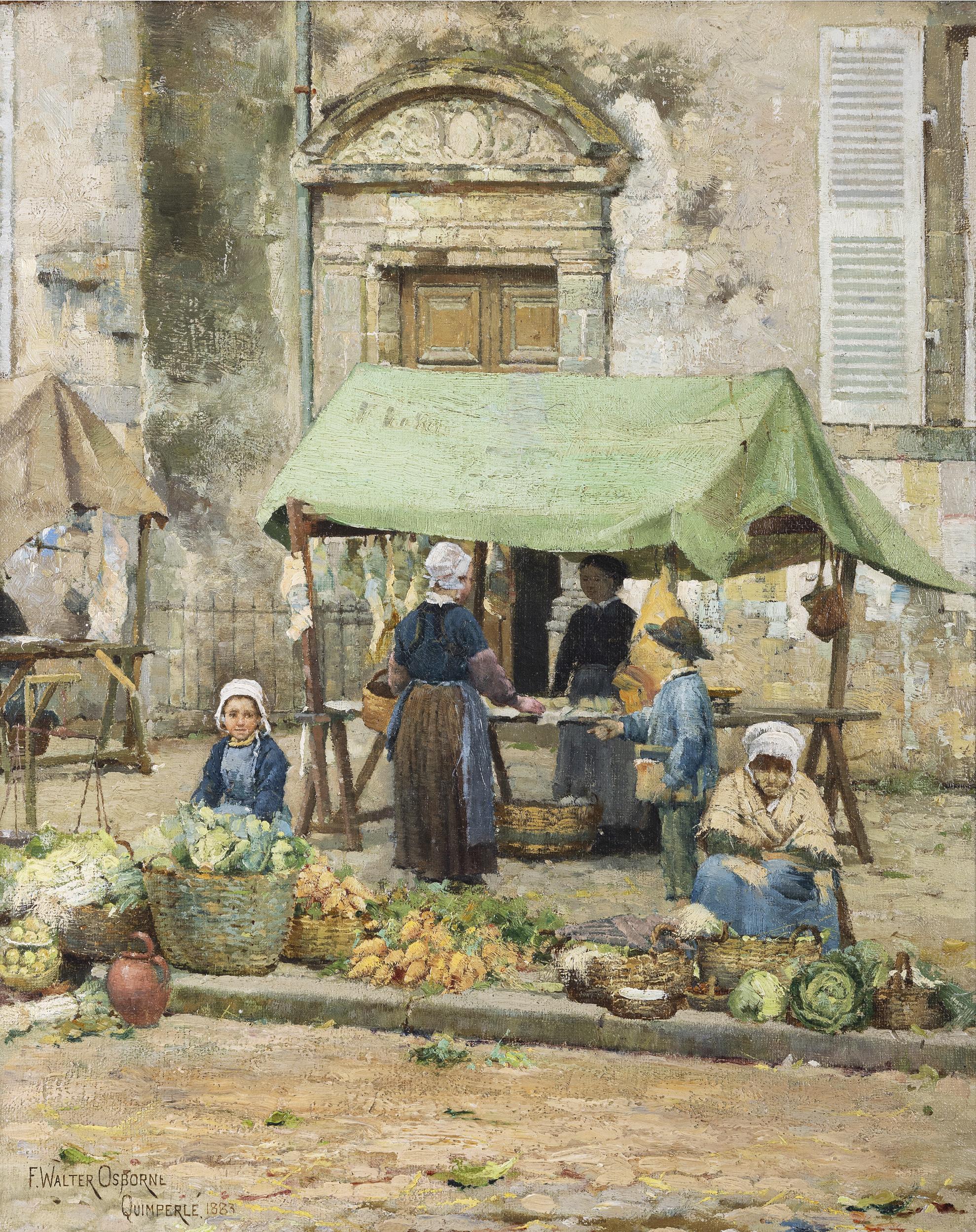 Early Morning in the Markets, Quimperlé is an attractive Continental street scene such as Walter Osborne loved to paint. It shows several Breton figures at a small market, with a colourful display of vegetables, in Quimperlé on a sunny day. After completing his studies in Antwerp in 1883 Osborne headed south west to Brittany to paint ‘en plein air’. He worked in Dinan, Pont Aven and at Quimperlé, often together with fellow former students from Ireland and England. Early Morning in the Markets, Quimperlé, set in the lower part of Quimperlé, is a companion piece to Osborne’s best-known Breton painting Apple Gathering, Quimperlé, 1883, (NGI), set in the upper town, both pictures featuring a church, and both being inscribed ‘Quimperlé’.