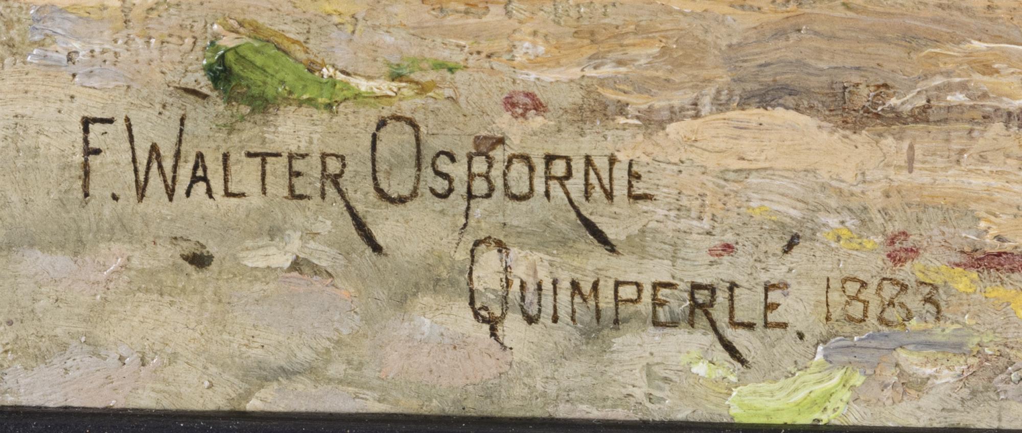 Osborne rarely identified the location of his pictures, so the fact that he inscribed the name of ‘Quimperlé’ on both Early Morning in the Markets, Quimperlé and Apple Gathering indicates the importance which he attached to these paintings. Early Morning in the Markets, Quimperlé was exhibited at the RHA in 1884 and has remained in the same Co Dublin family collection since, or almost since, the artist’s lifetime.