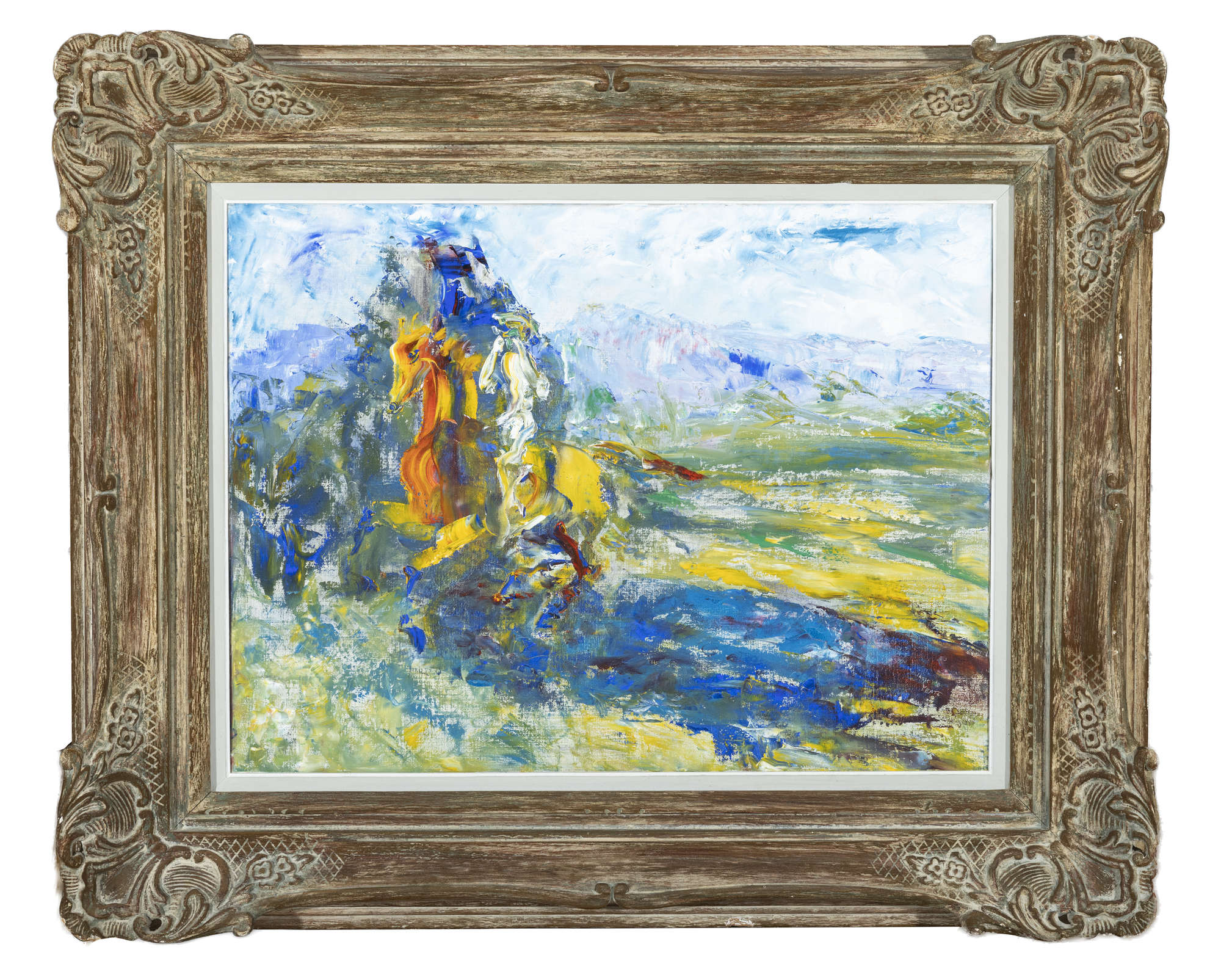 In Tir na nÓg (1936, Private Collection) Yeats depicts a young boy engrossed in a book while surrounded by the tiny figures of the land of youth which he has been reading about. In several other late works Yeats concentrates on figures reading, unaware of the world around them. These include A Giant Reading, (1942, Private Collection), Man Reading (1945, Private Collection) and The City (1944, Private Collection) where a man stands engrossed in his newspaper. Yeats sets the rider and horse in a vast open landscape. A strong opaque palette is applied in a manner that conveys the energy and vitality of nature with swirling clouds and the brisk movement of the horse in the empty terrain. Behind the horse and rider is a huge outcrop of rock which casts a deep blue shadow below them. To the right an expanse of pale mauve and purple mountains closes off the horizon creating a tremendous sense of vast, uninhabited space. In contrast to the delicate hues of the peaks, the bright orange and yellow of the horse with its noble head and flying mane and tail create a dramatic contrast. These powerful colours are augmented by the intense blue of the horse’s hooves and the surrounding landscape. The eyes of the animal are carved out of two strokes of thick impasto paint which along with the blue tip of its nose suggests the sensuous awareness of the beast to nature and the world around it. By contrast, the white form of the rider, his face masked by his book, seems an incongruous element in this scenario. The work could be seen as a riposte to Yeats’s Singing Horseman (1949, National Gallery of Ireland) where the crooning rider opens himself to the wild landscape. In He Reads a Book, the glorious figure of the horse dominates the composition, becoming a symbol of freedom and the intuitive intelligence of the animal kingdom.