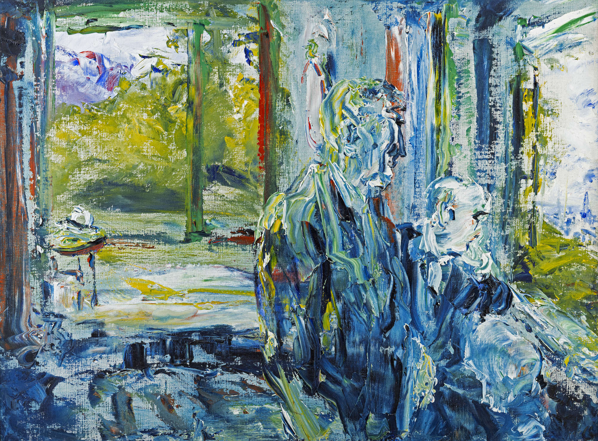 The agitated handling of paint that determines the fluctuating and dynamic surface of the painting is contrasted by the balanced geometrical division of the composition. The rectangular shape of the window opening is echoed by that of the open doorway leading into the loggia and the garden beyond. Strong vertical elements such as the door jambs and the beam of the loggia create a strong sense of structure and provide an almost theatrical setting for the poignant moment between the two figures in the foreground as they gaze out at another view. The dominant blue and white of the palette is indicative of shadow and is contrasted by patches of intense red and yellow and by the luscious green of the foliage outside. The modelling of the two figures in thick impasto is extremely sensitively handled and ably conveys the intimacy and tenderness of this memory of a shared moment between two different generations.