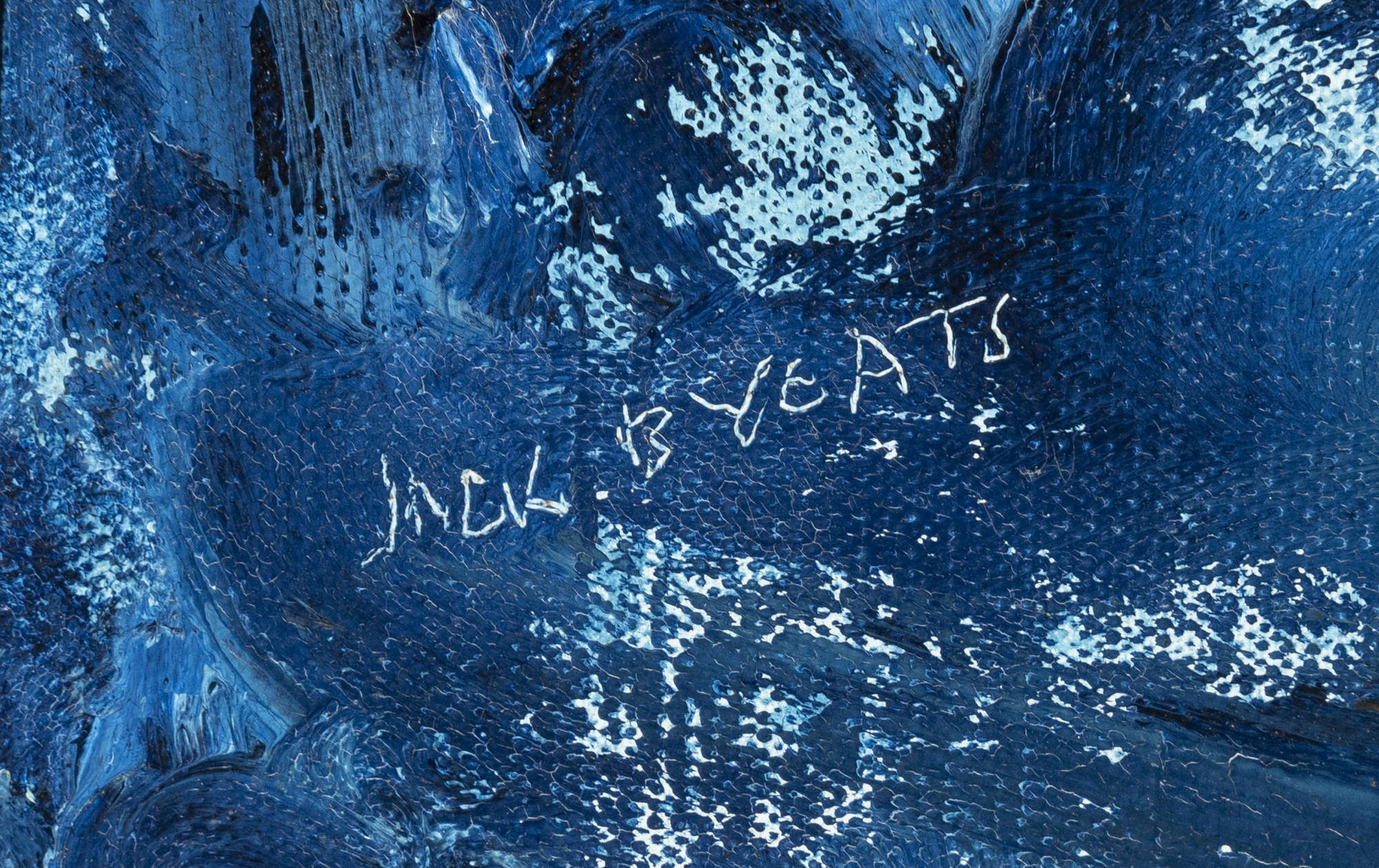 The subject may relate to Sligo which was the location for several paintings by Yeats which use interiors and windows as their core device. These include A Room in Sligo (1935, Private Collection) which shows a view of the mall through a large window. Evening Light (1943, Private Collection) also uses a large window on the right with figures in an old fashioned interior. Evening in Sligo (1937, Private Collection) recalls a formal dinner with an outstanding landscape visible through the window. The Window with a View of the Town may also be derived from a memory from Yeats’s childhood in that county where he spent a great deal of time with his grandfather. The use of doorways and openings off the main space is also a frequent ploy found in Yeats’s pictures of interiors. One of the earliest is A Dancer (Rosses Point Sligo) (1921, Private Collection) which while a more modest abode than the one in this painting, also shows a doorway opening onto a hallway on the left and extending into other spaces. This manner of framing the composition into a series of spatial elements derives partly from the work of such Post-Impressionist artists as Paul Cézanne. Yeats’s development of it in his work relates to his fascination with the creation of temporary performance spaces in theatre and the circus and from his desire to draw attention to the similar artificiality of space created within a painting.