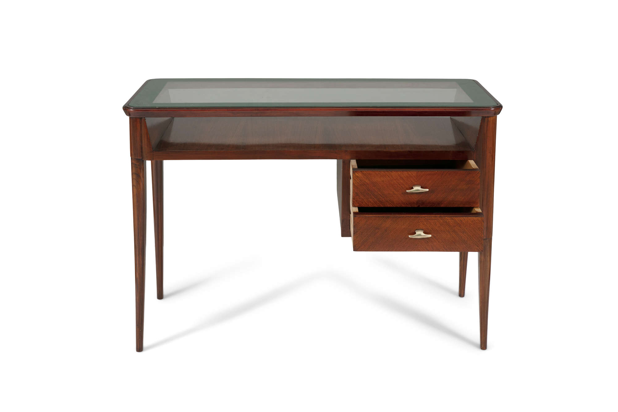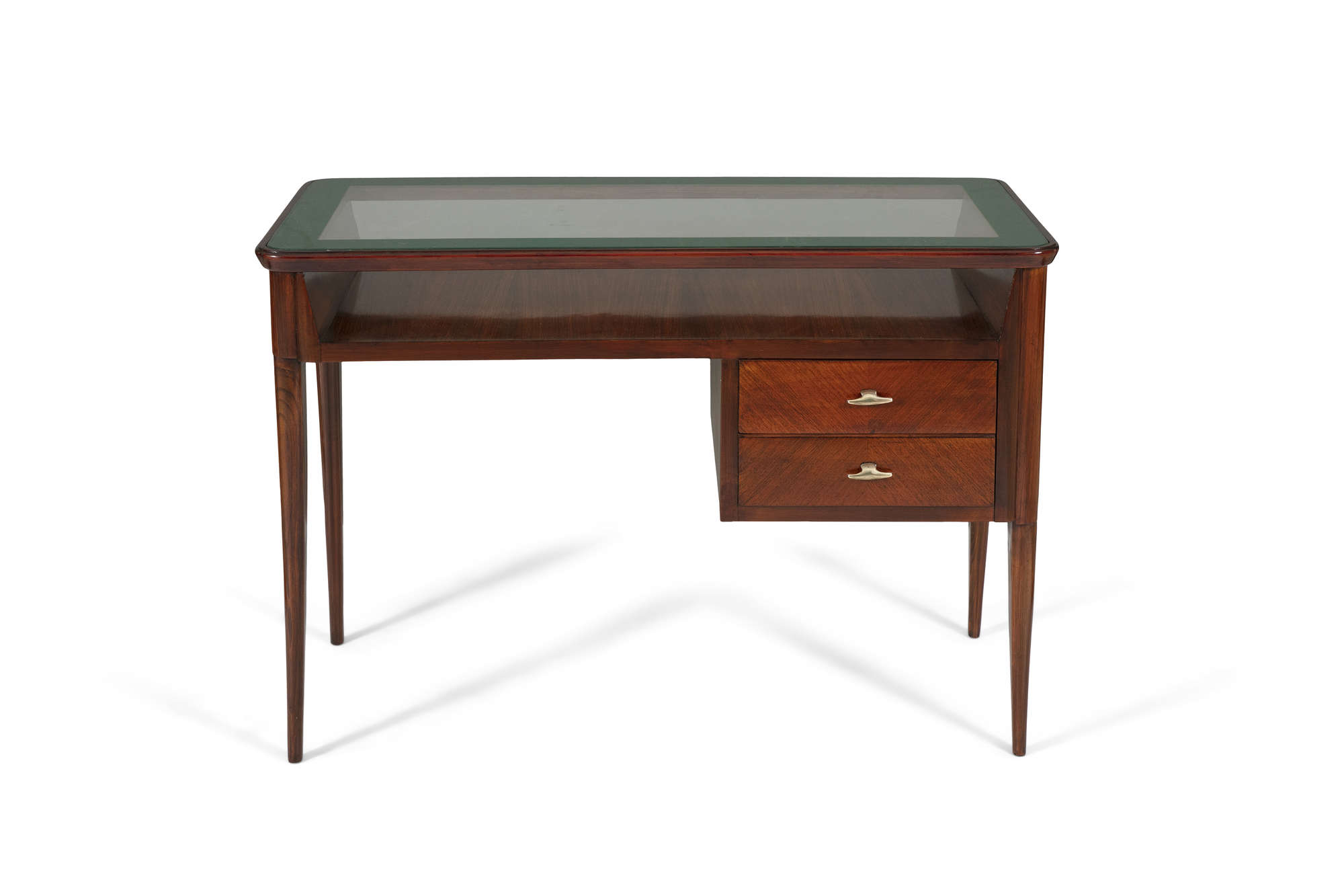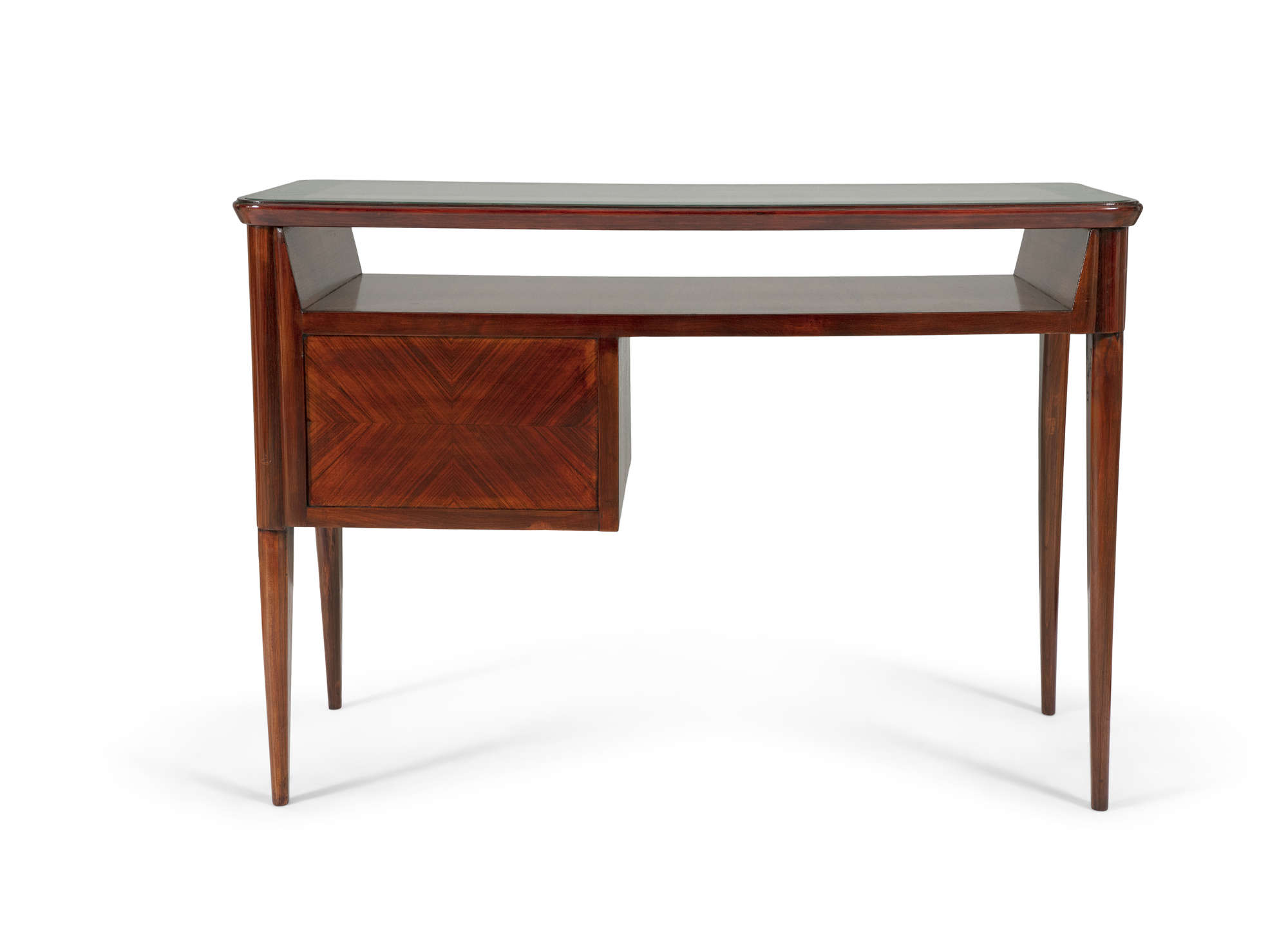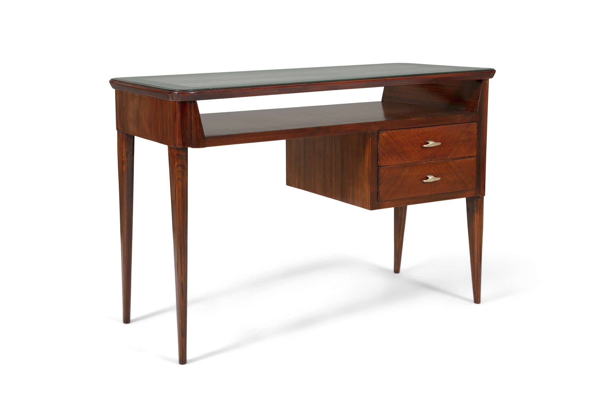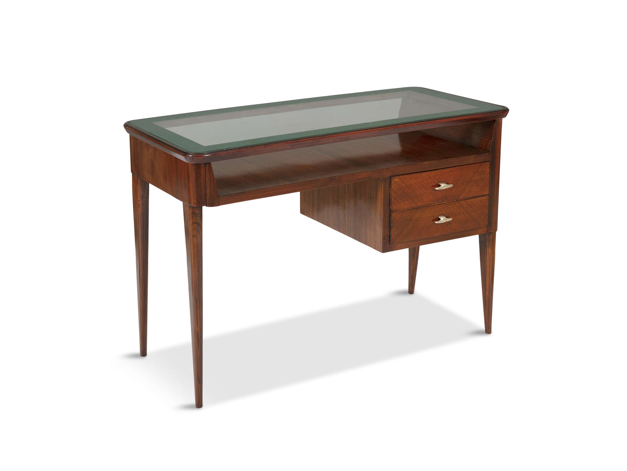 A small rosewood desk, with a glass top and two drawers, on four tapered legs, Italy c.1960. 49 x 97 x 69cm(h)