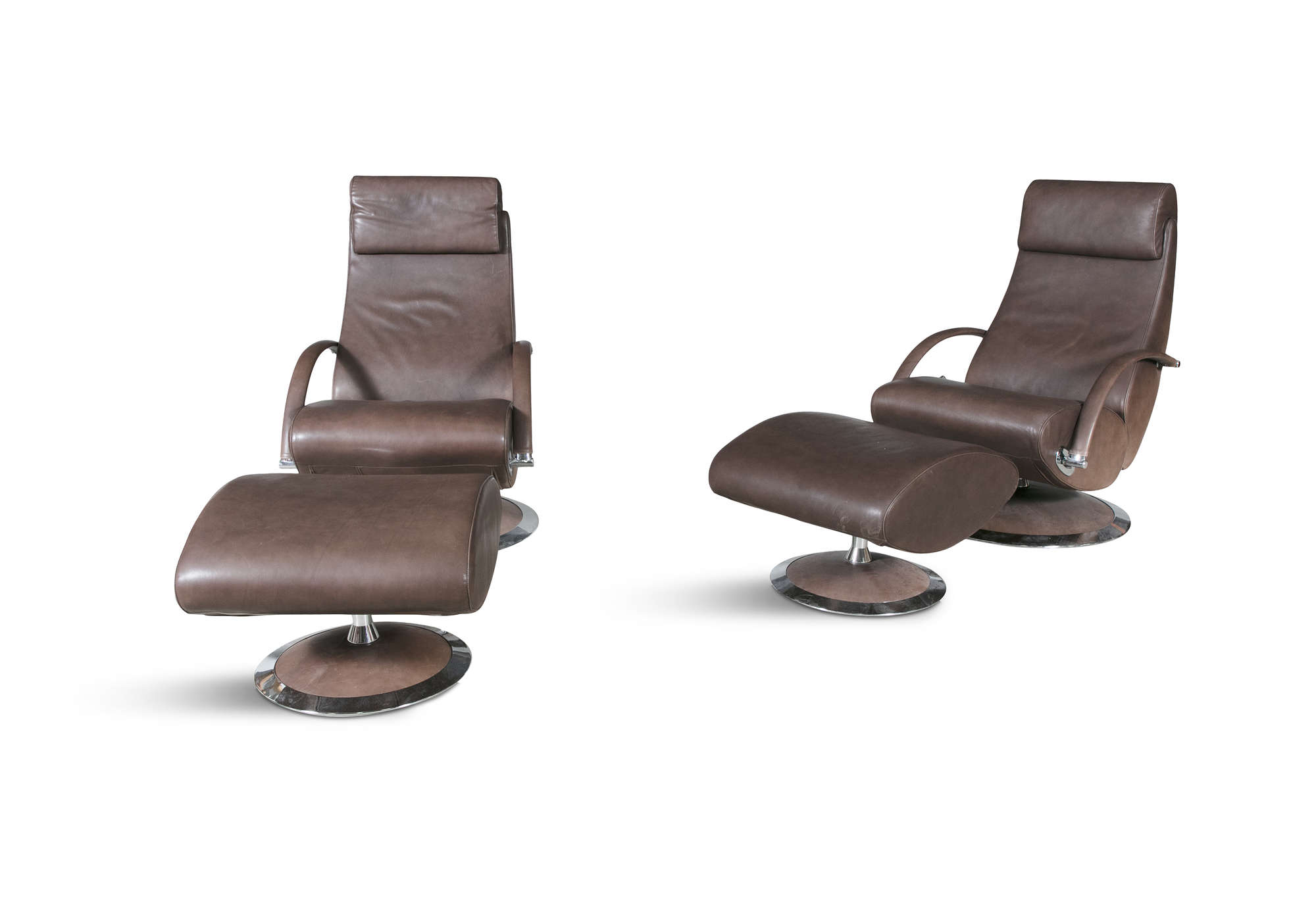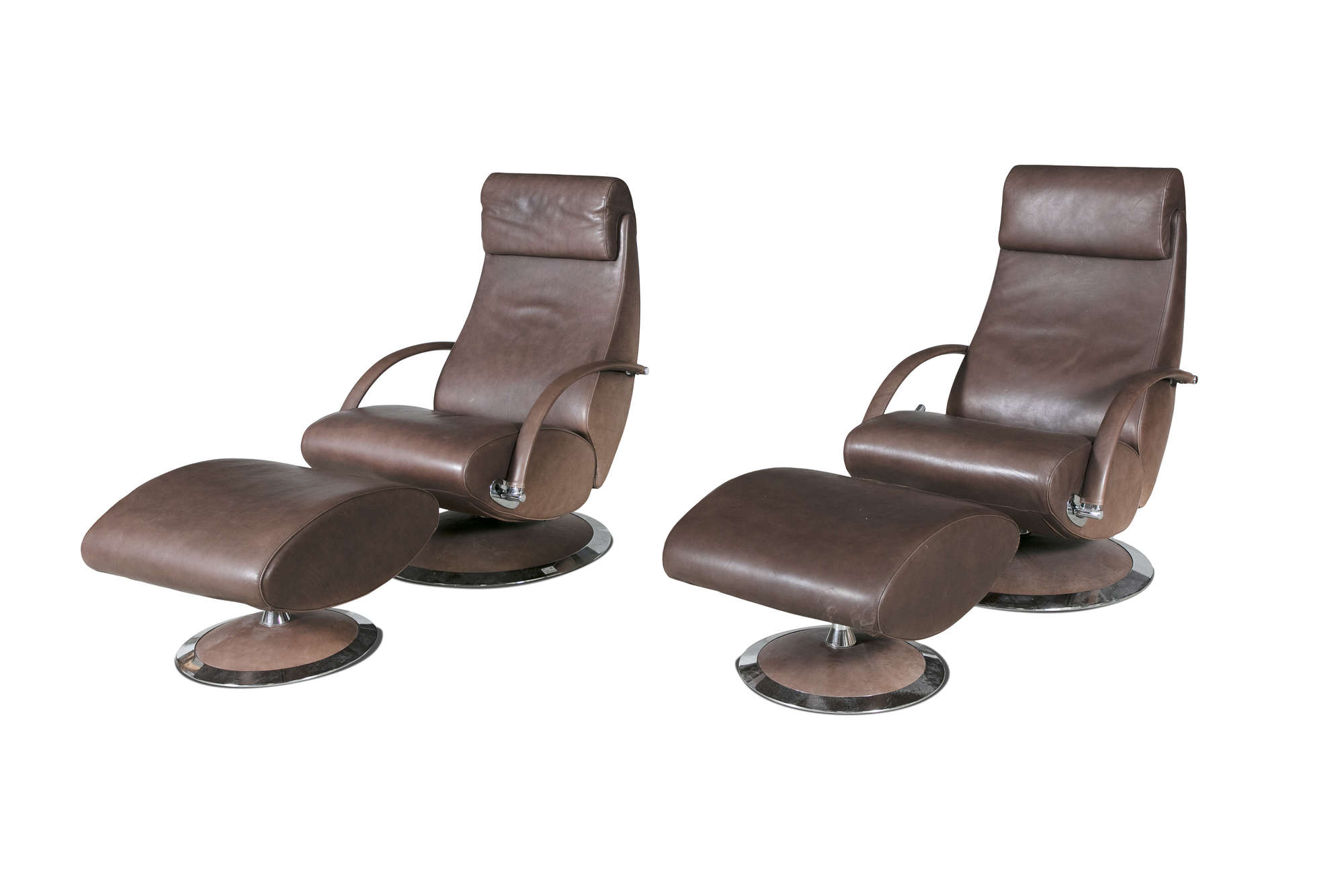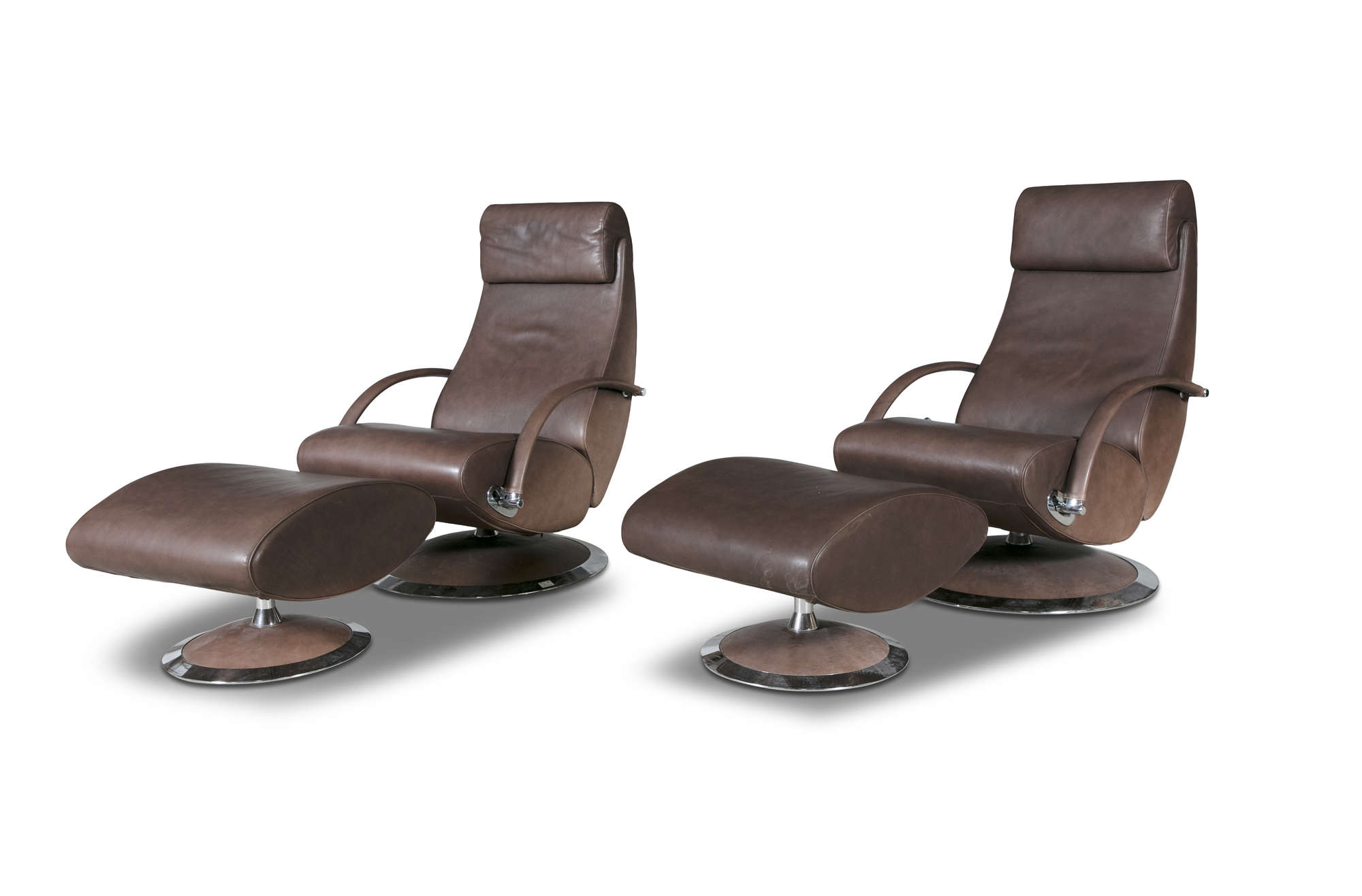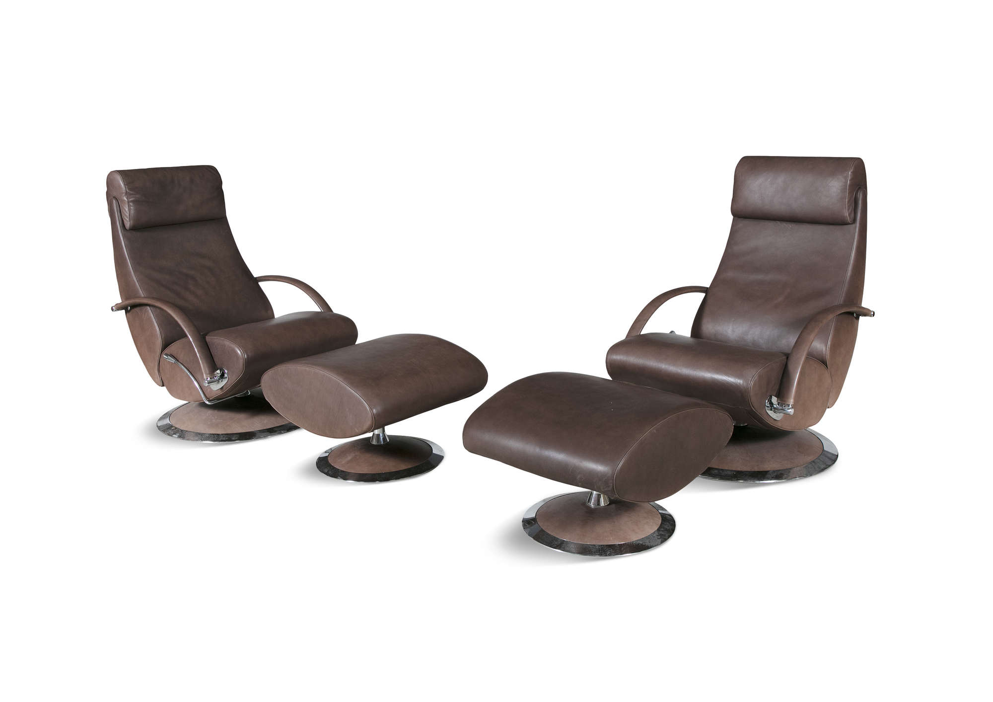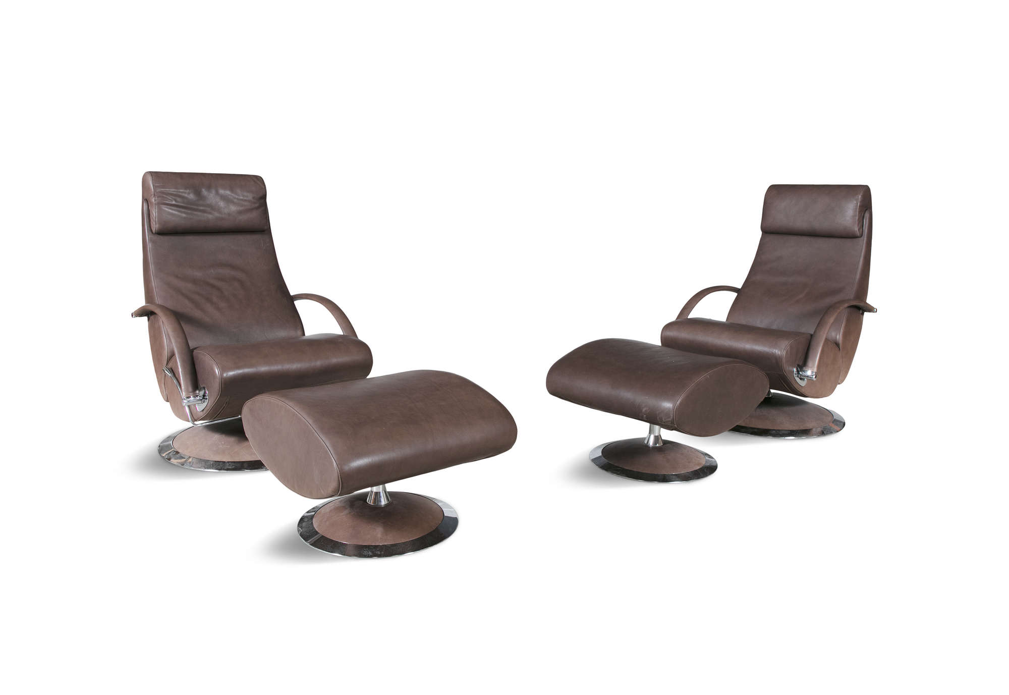 A pair of leather reclining armchairs by Molinari, with matching footstools. 67 x 90 x 100cm(h)