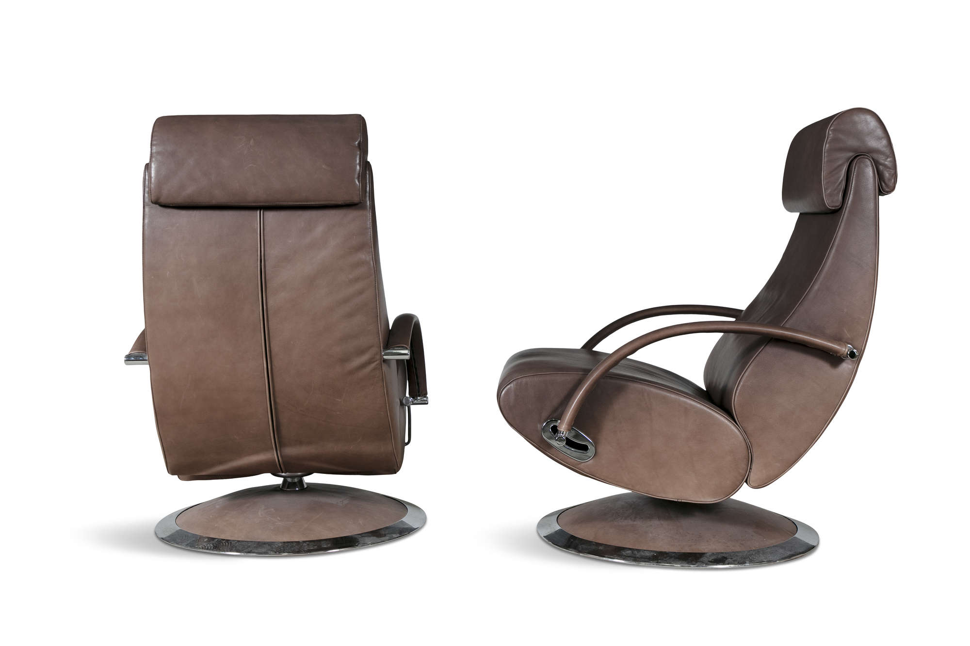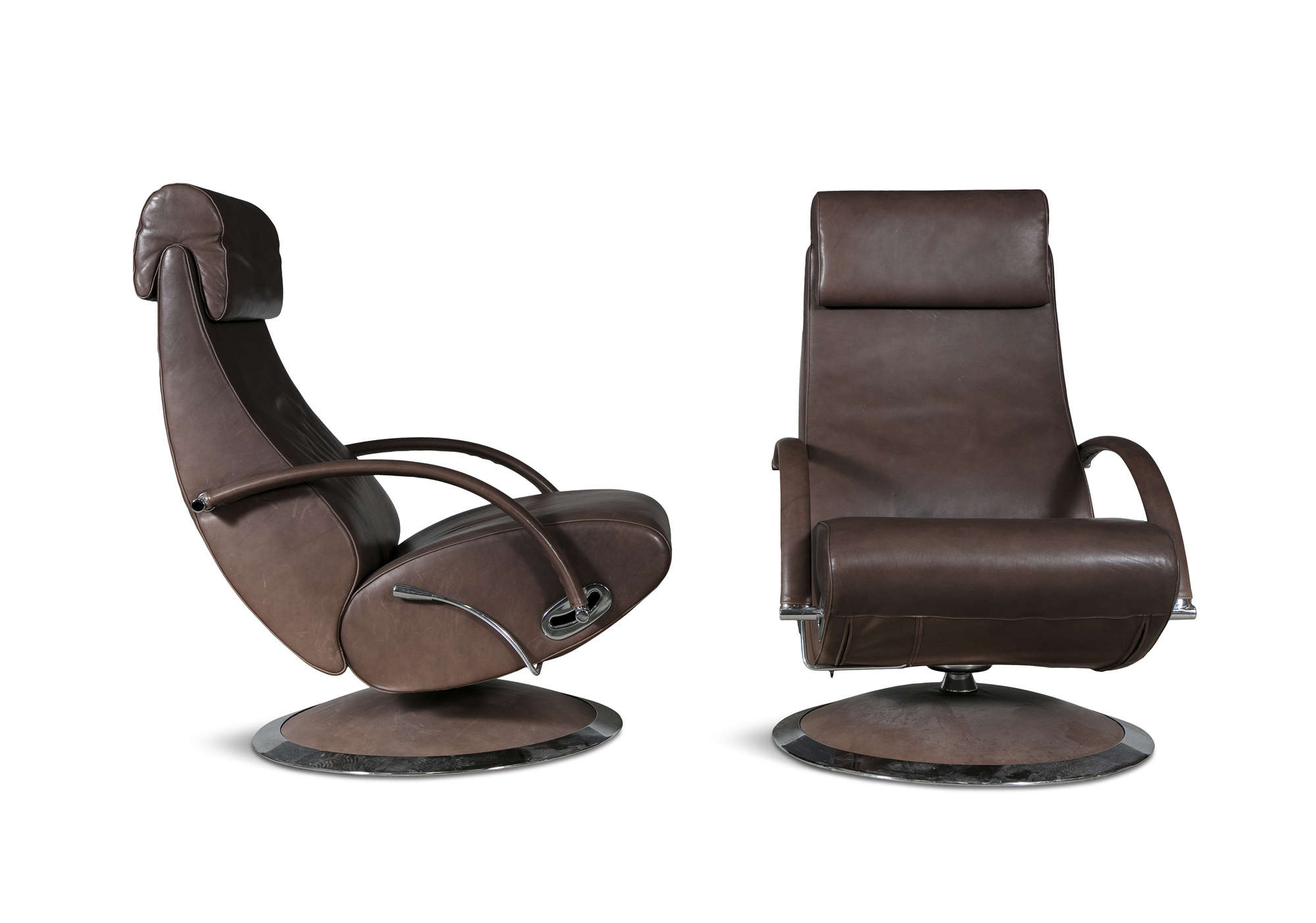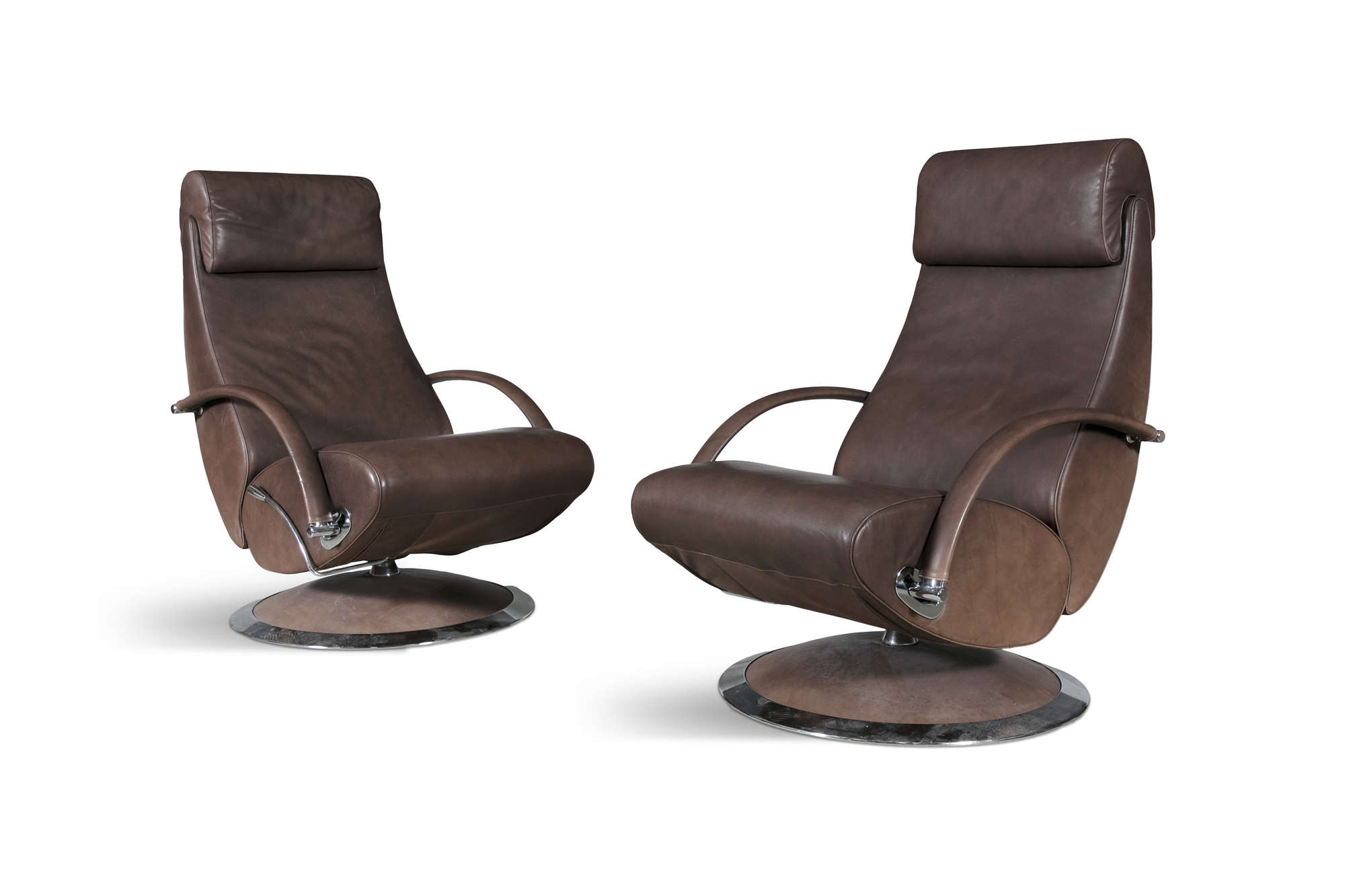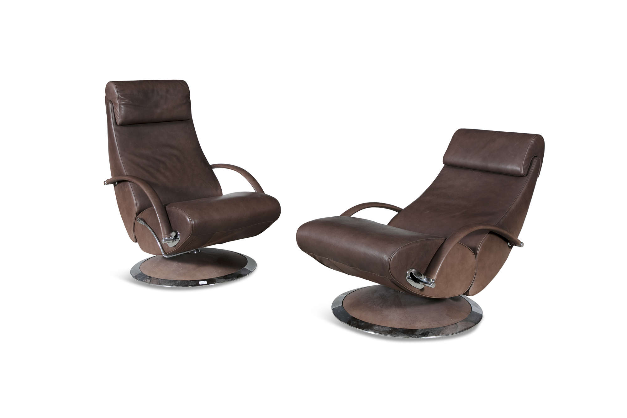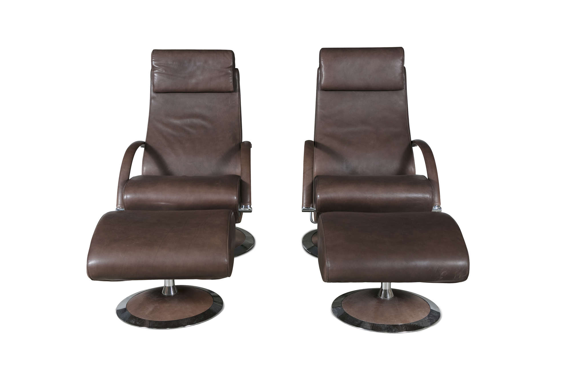 A pair of leather reclining armchairs by Molinari, with matching footstools. 67 x 90 x 100cm(h)