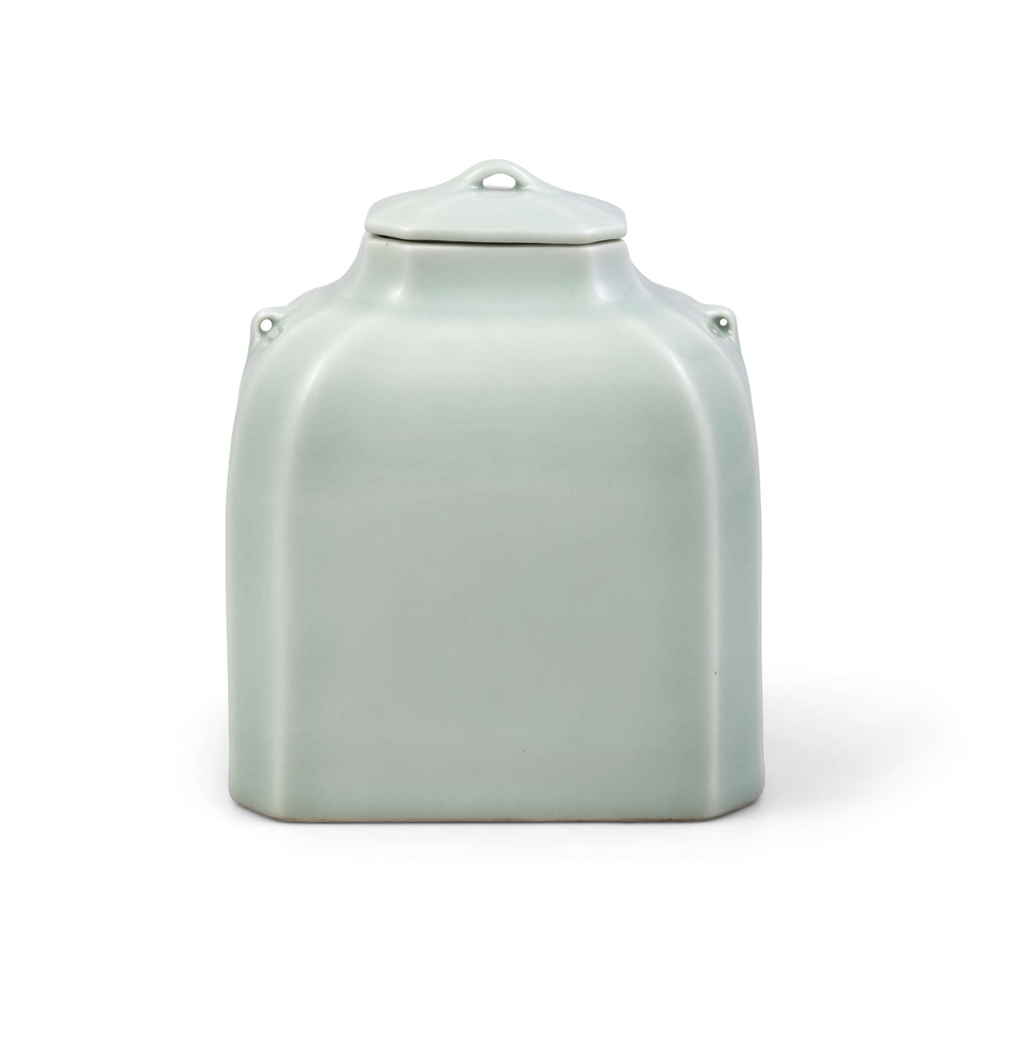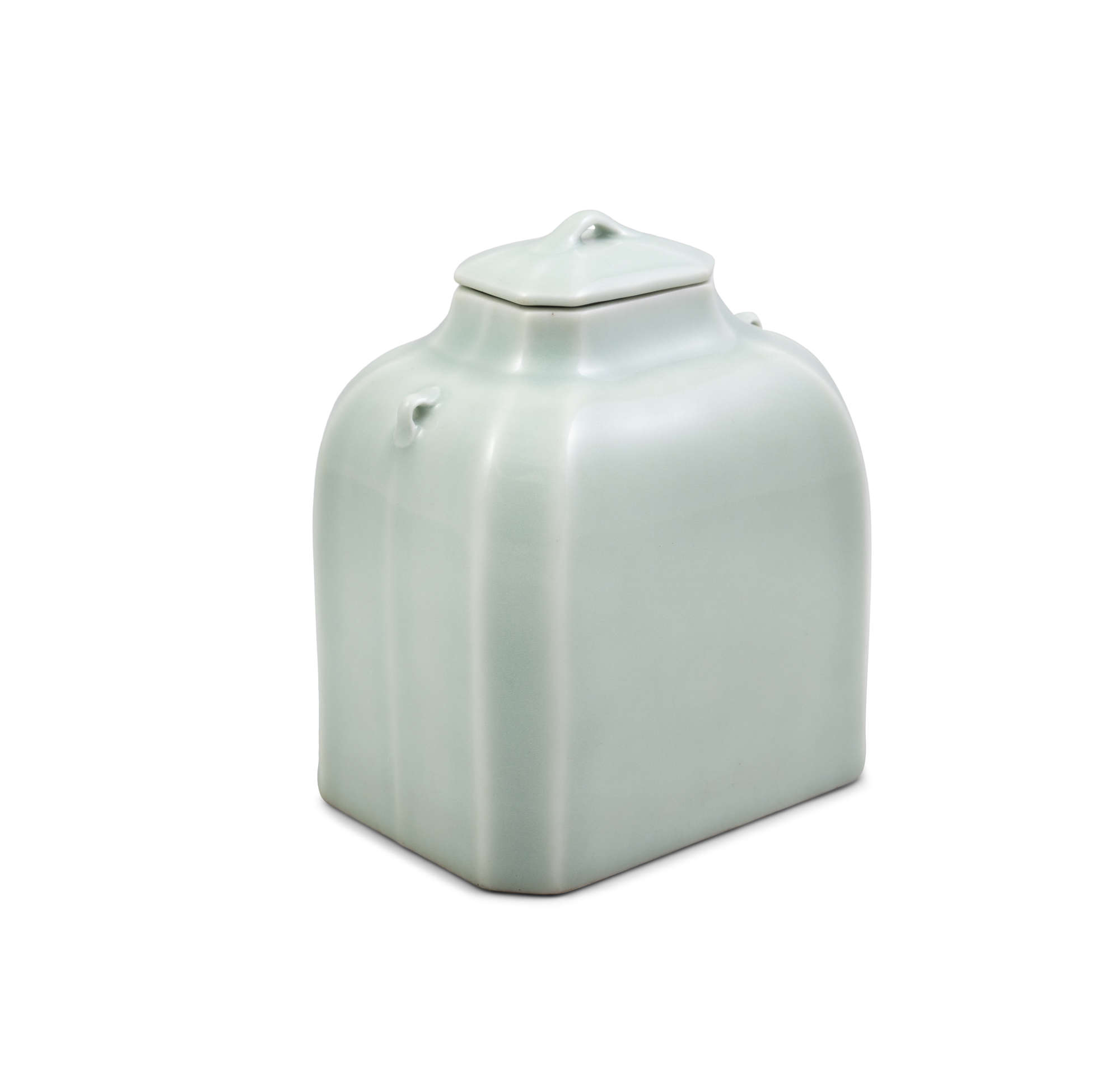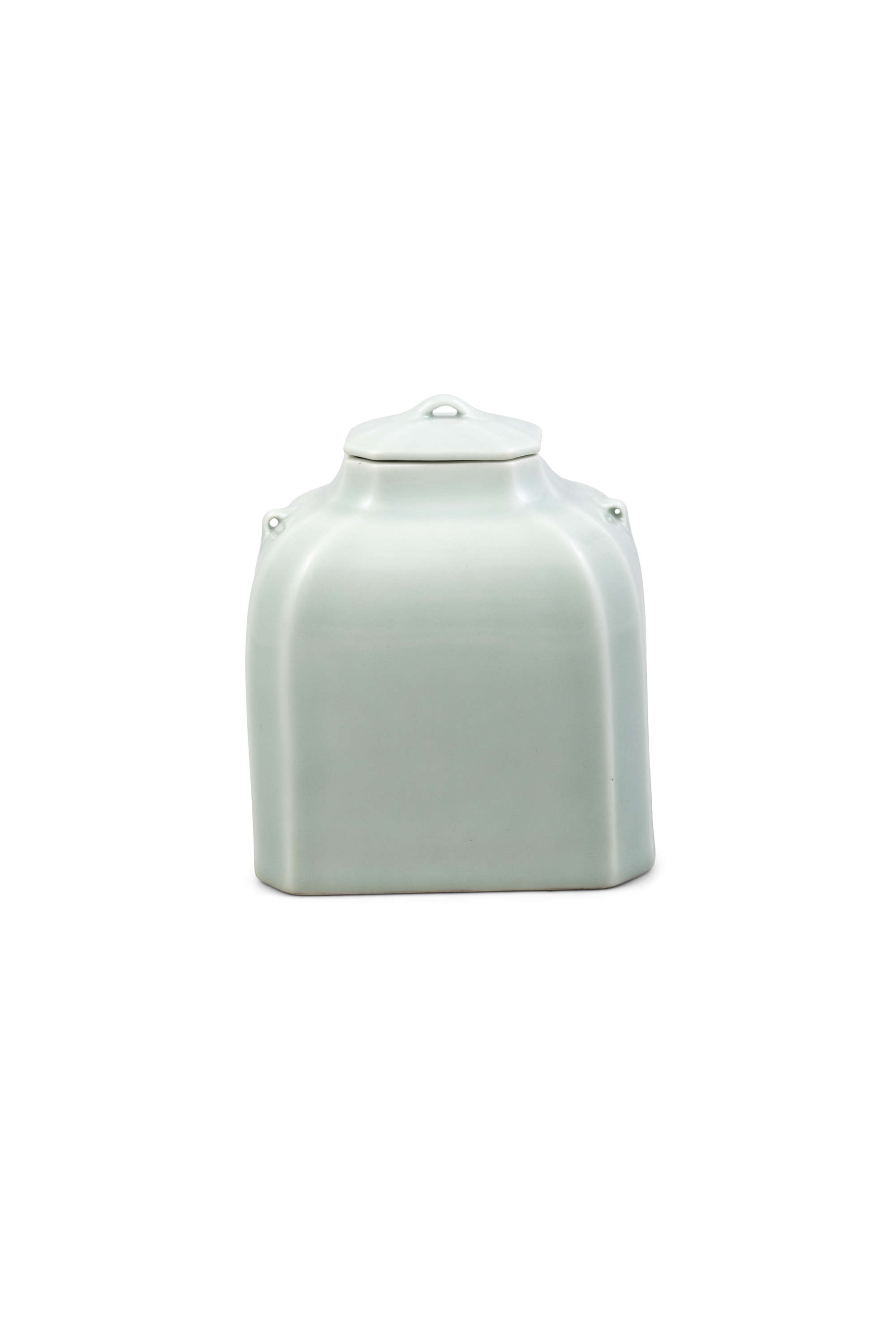 Covered overall with a soft celadon glaze, the jar features a quadrangular section with canted corners, a tapered neck, a pair of slender lug handles on the sloping shoulder, and a quadrangular cover with a slightly raised small handle and slanted edges surrounding the flat top.
