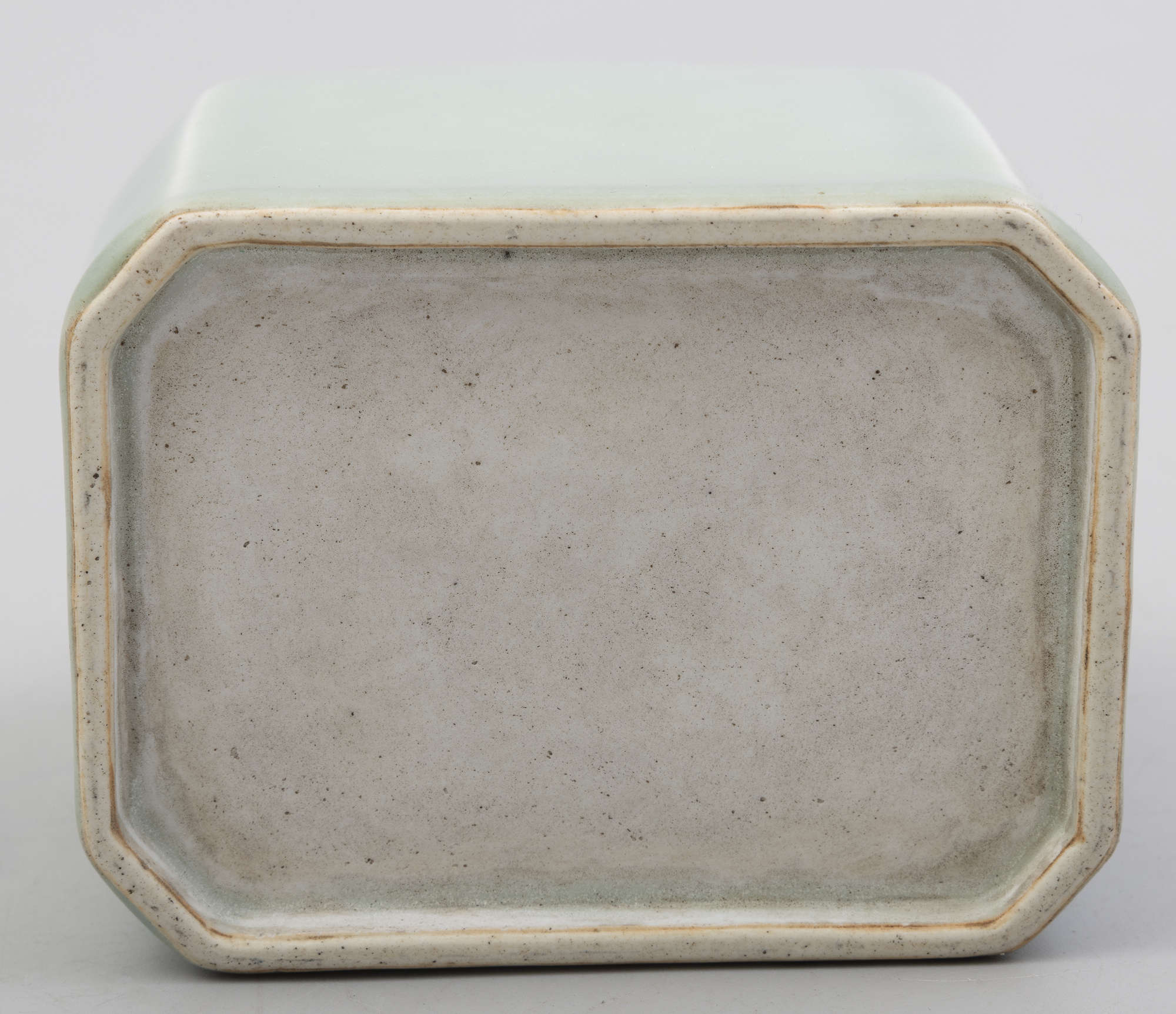 Covered overall with a soft celadon glaze, the jar features a quadrangular section with canted...