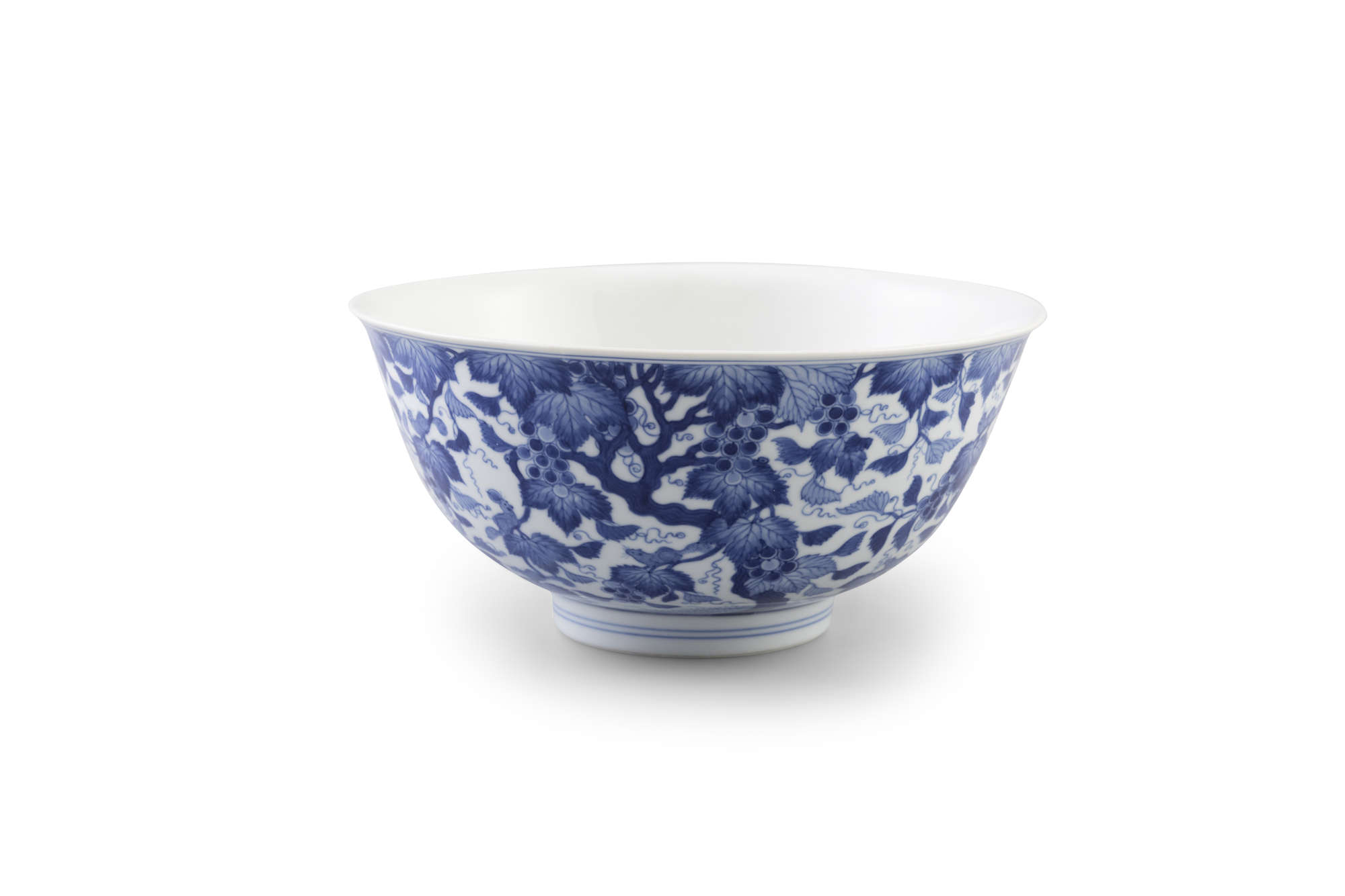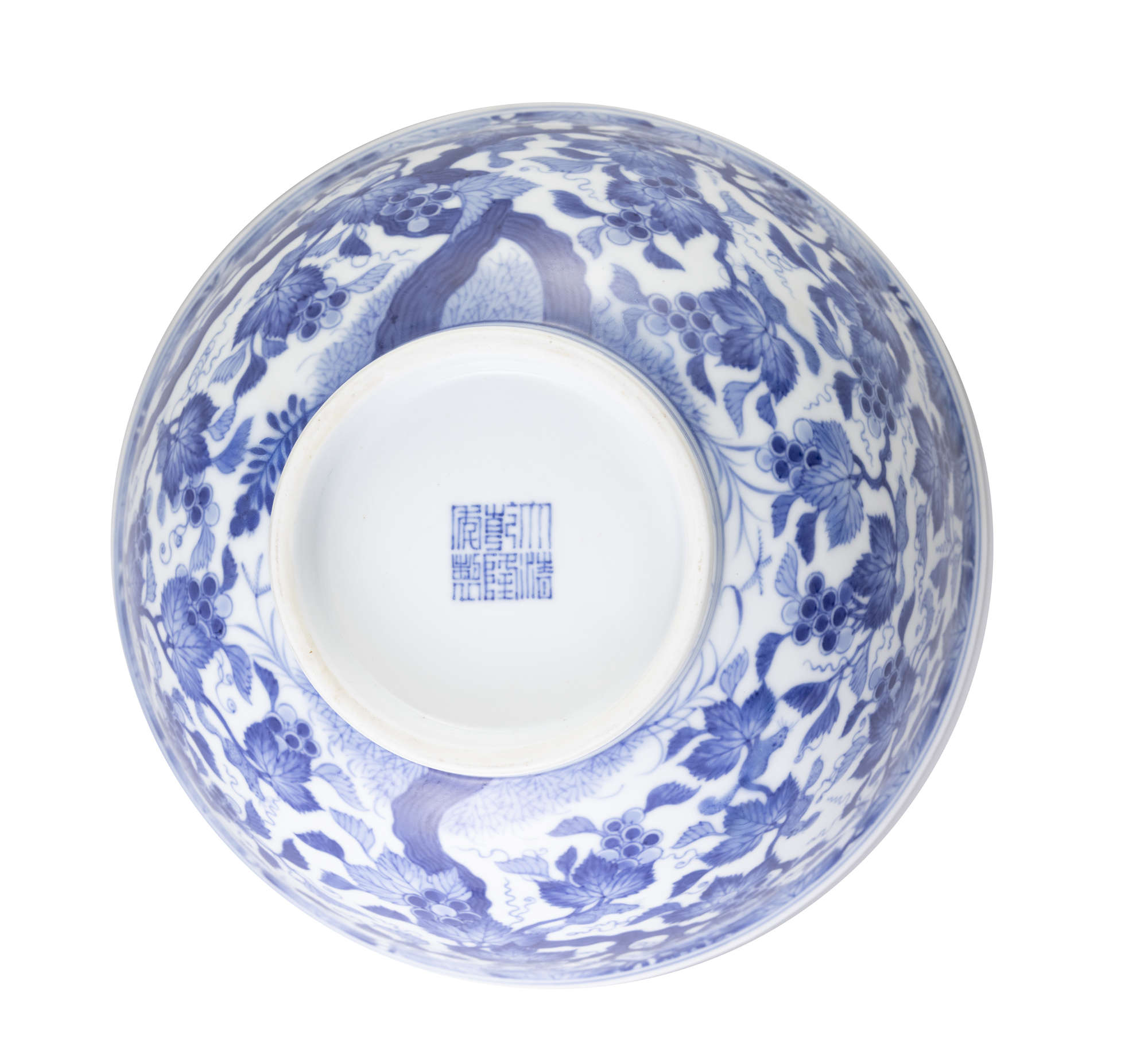 A LARGE BLUE AND WHITE ‘SQUIRREL AND GRAPES’ BOWL, WITH QIANLONG SIX-CHARACTER SEAL MARK AND PERIOD