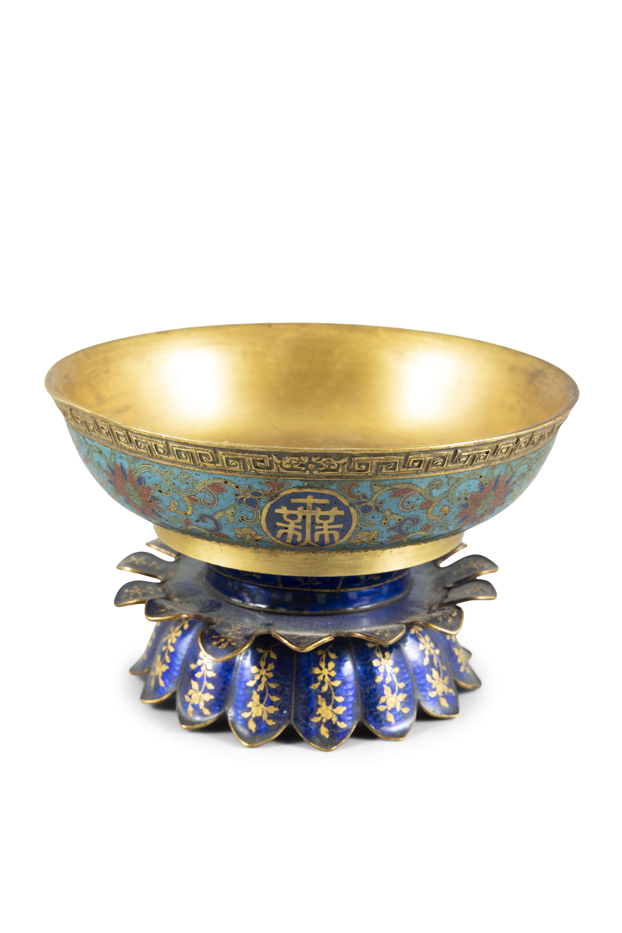 A PAIR OF GILT-BRONZE AND CLOISONNÉ ENAMEL 'WAN SHOU WU JIANG' BOWLS WITH BLUE ANG GILDING ENAMEL PAINTED FLOWER SHAPED STANDS