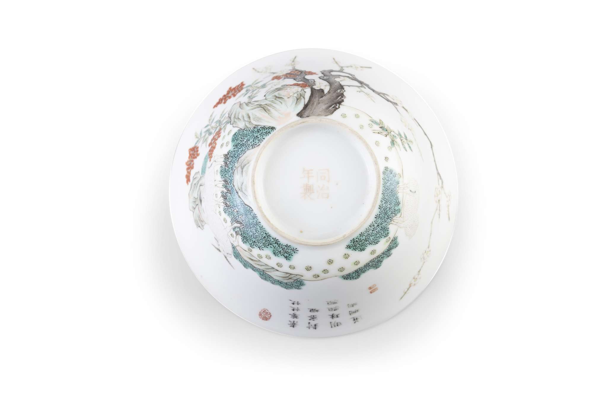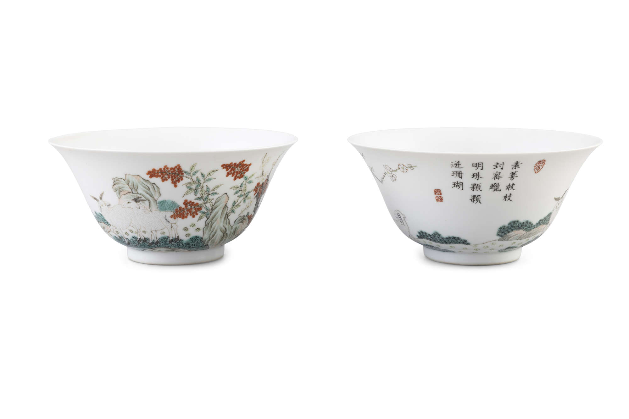 A PAIR OF FAMILLE-ROSE 'THREE RAMS' BOWLS, MARK AND PERIOD OF TONGZHI
