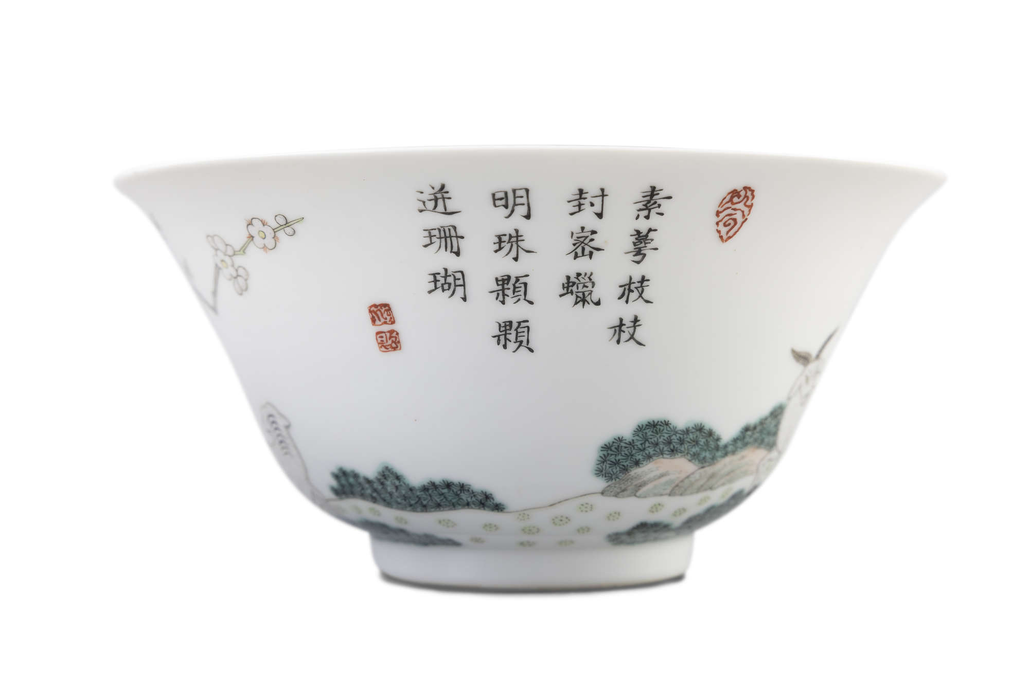 清同治 粉彩三羊開泰詩文撇口碗一對