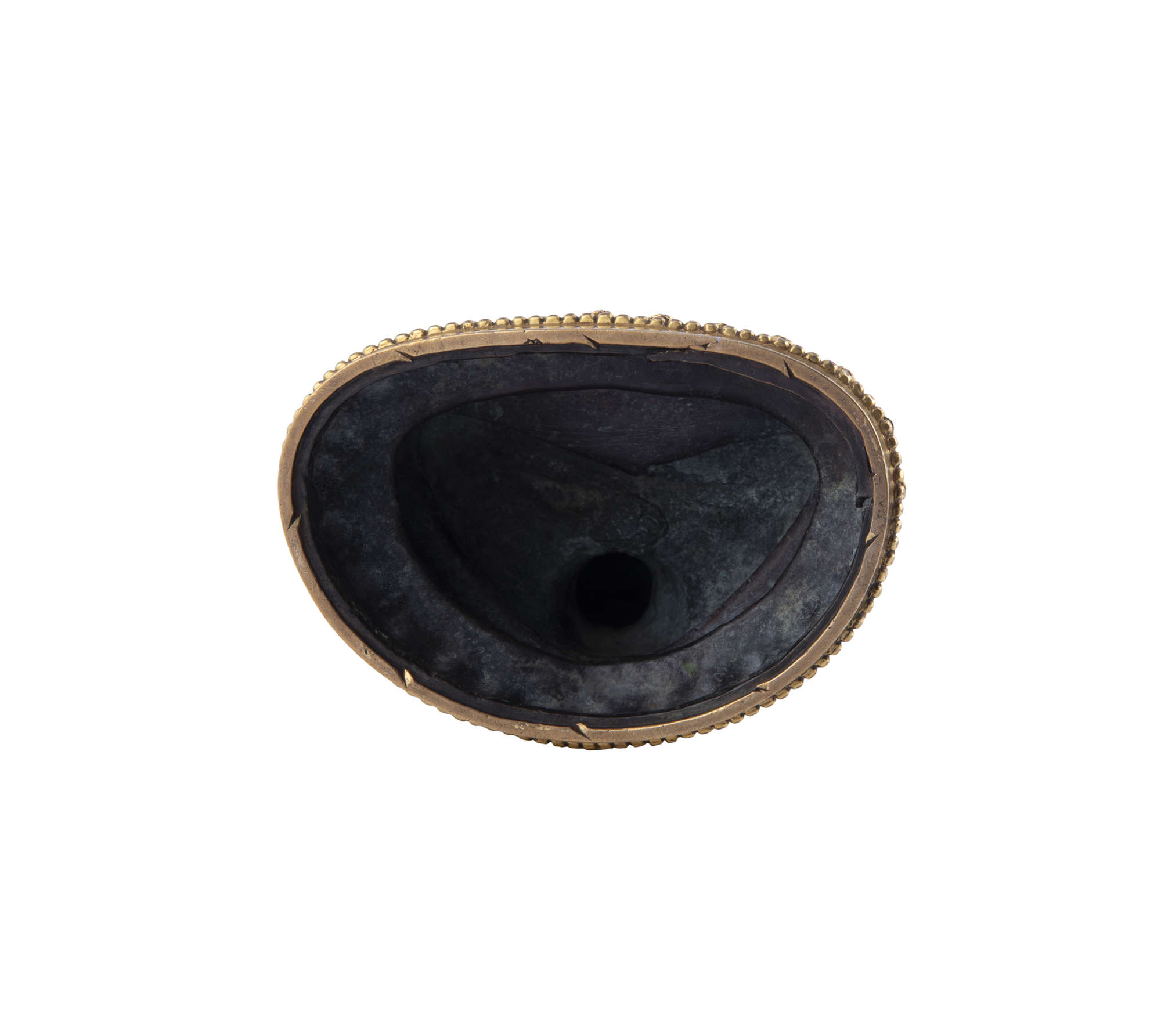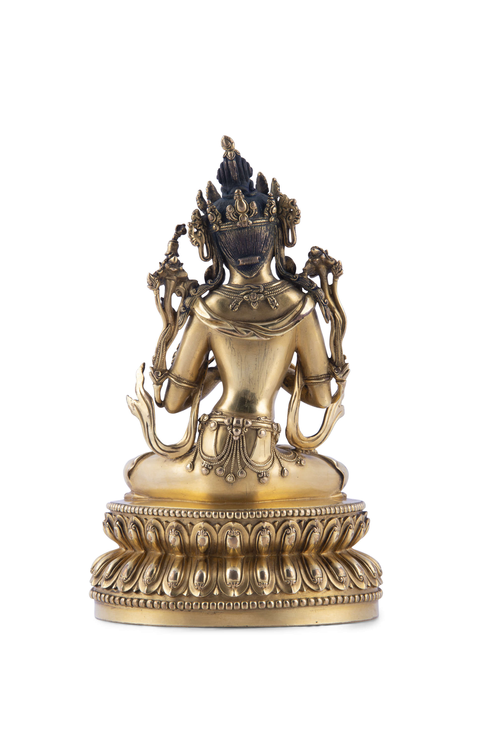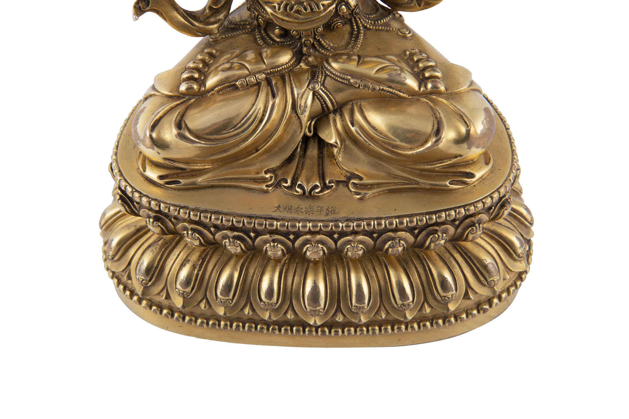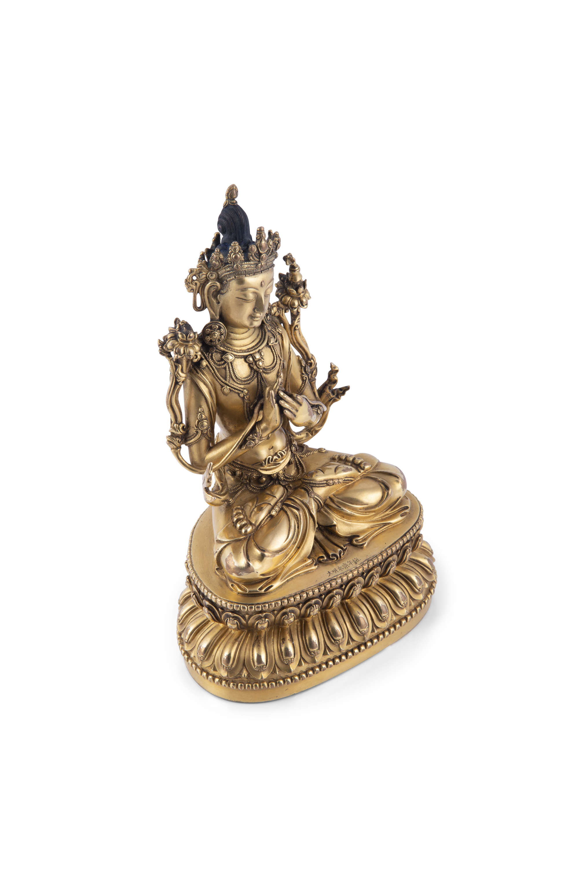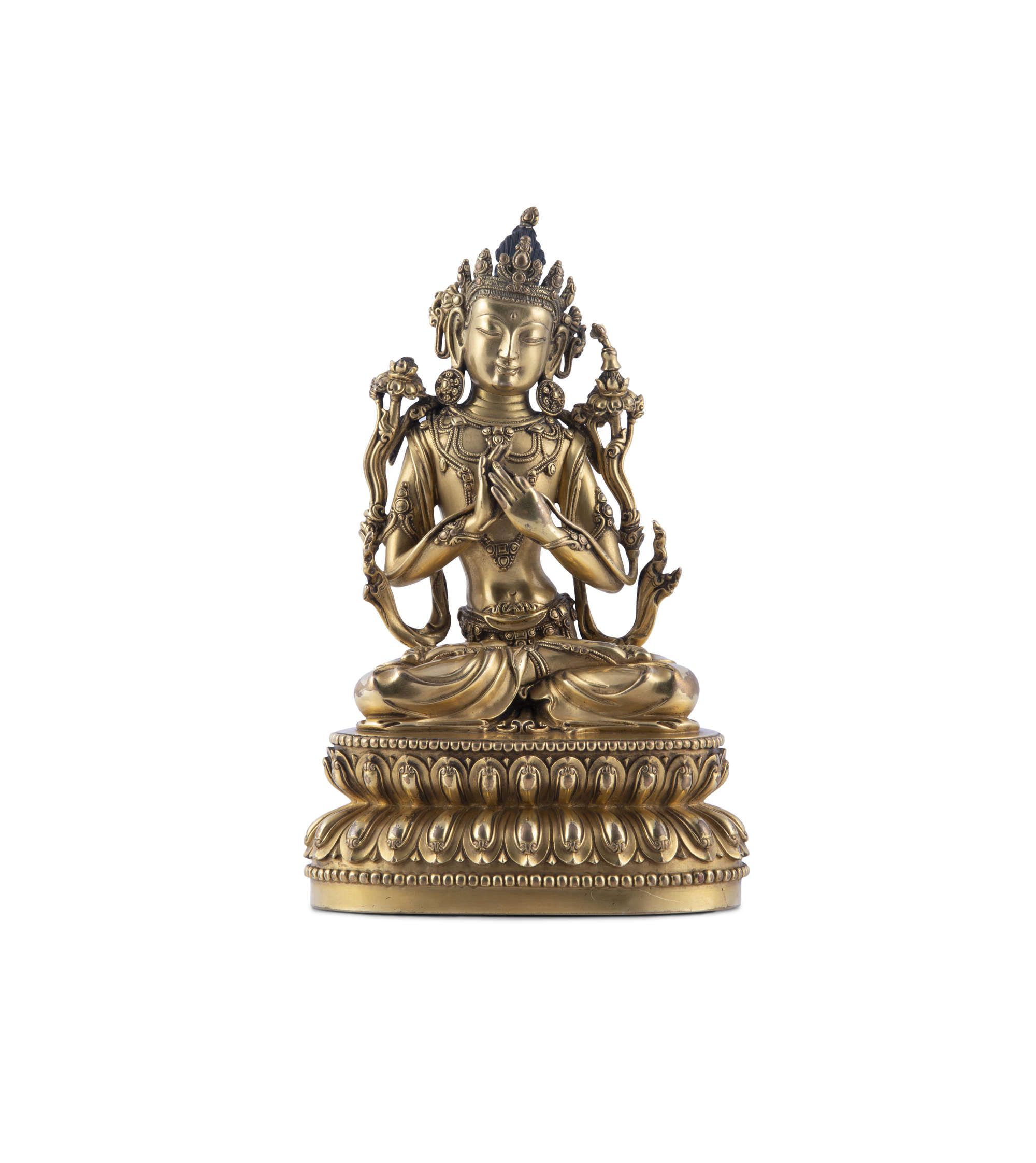 The finely cast and richly gilt bodhisattva is depicted cross-legged in vajraparyankasana, with hands in dharmachakra mudra position for teaching. Adorned in a long flowing robe draped around the arms and legs, with a well-defined waist and broad shoulders, the aristocratic face displays a downward benevolent gaze and smile. The hair is coiled up in a chignon, with lotus flower stems curled between his thumbs and forefingers. A Ghanta (an auspicious bell, welcoming divinity and dispelling evil) rests on the lotus flower head on his left shoulder. The bodhisattva's jewellery comprises a magnificent crown, an elaborate tripartite necklace, wheel-shaped earrings attached to elongated earlobes, armbands, a jewelled girdle, anklets, bracelets, and foot jewellery. The six-character mark ‘Da Ming Yong Le Nian Shi’ is engraved on the upper surface of the waisted lotus pedestal, with the base unsealed.