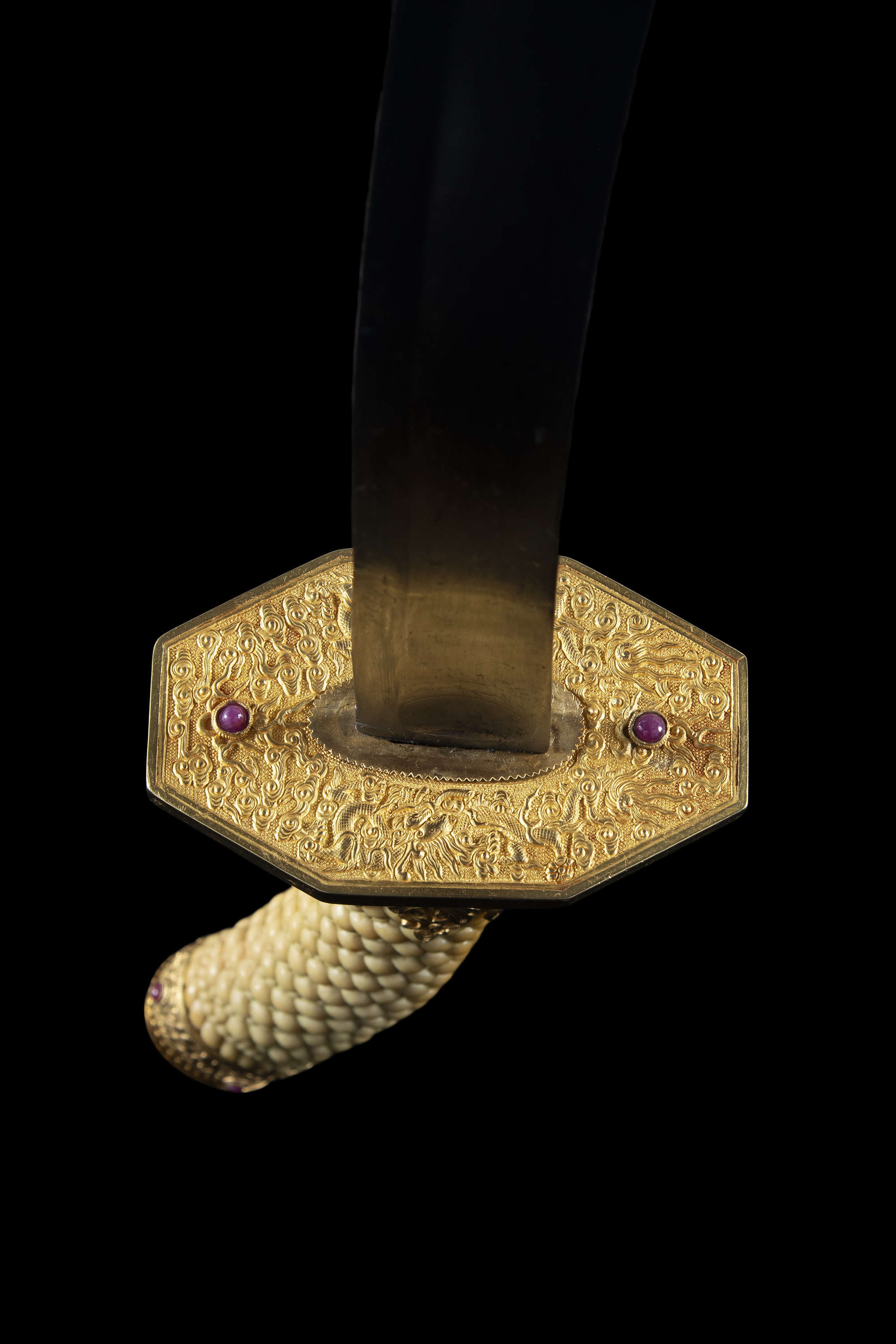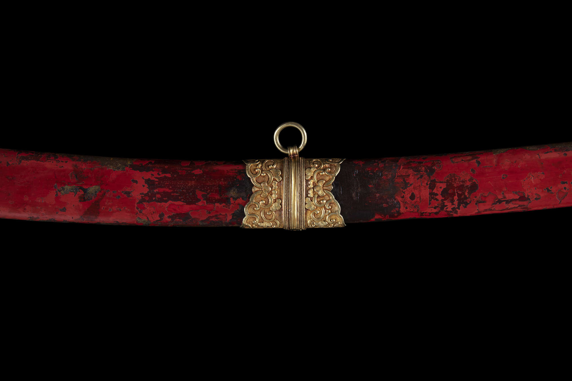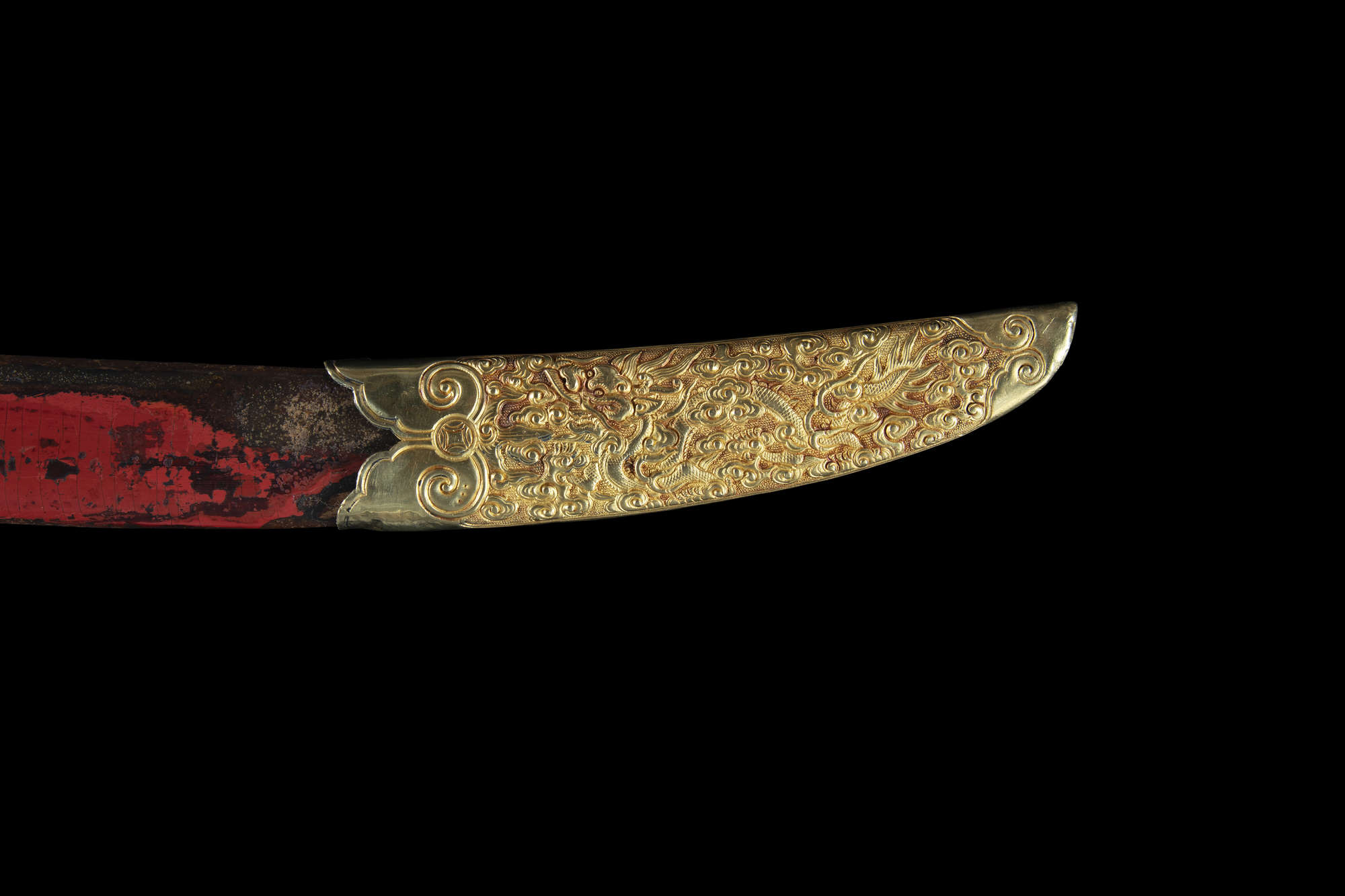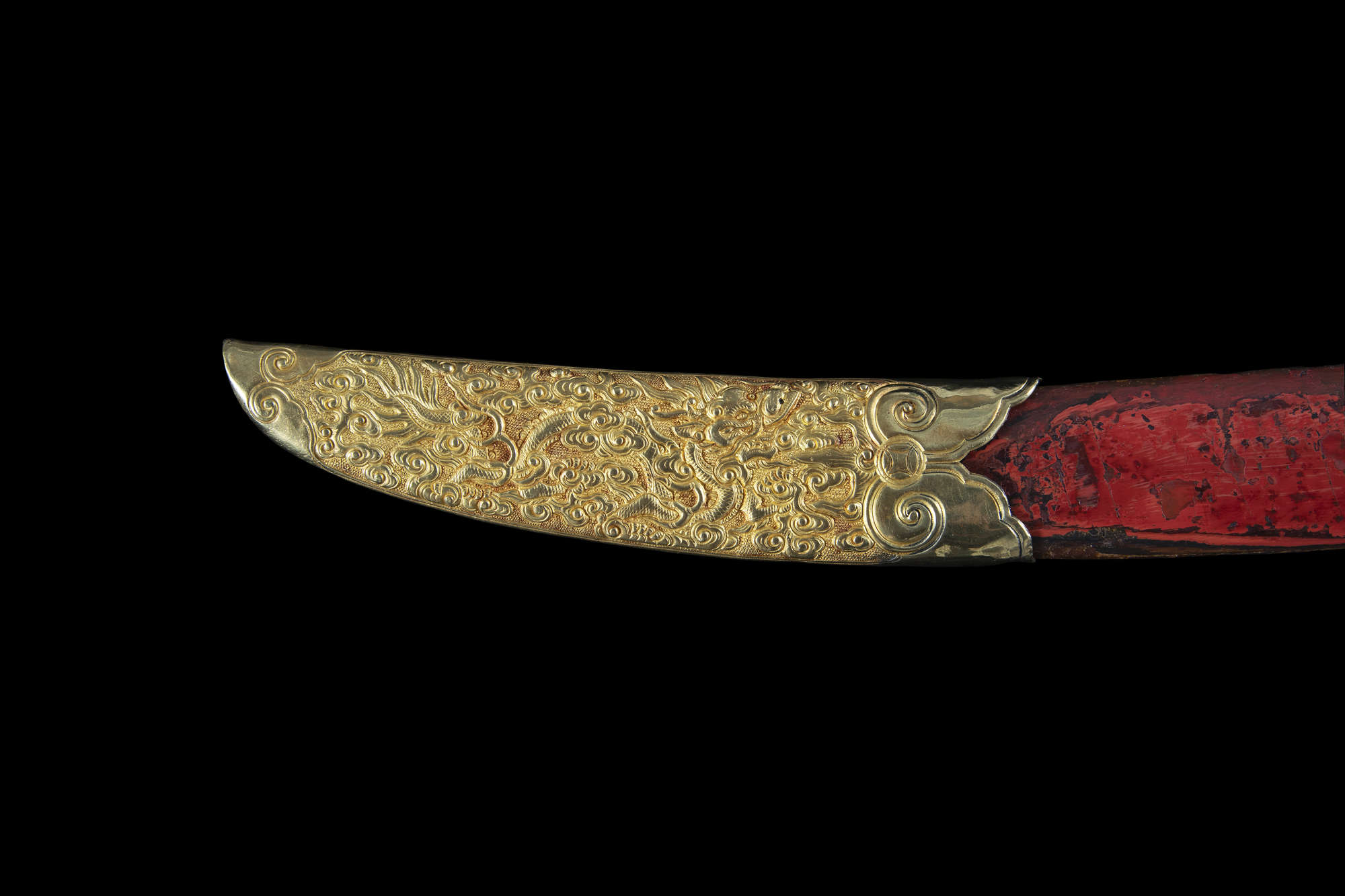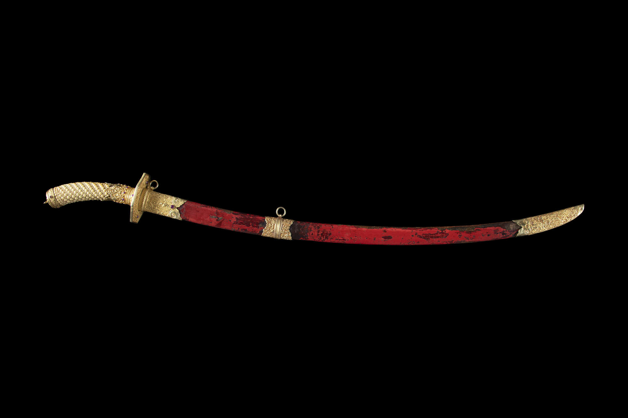 The sword features an elongated S-shape with a spiral-carved ivory grip mimicking a woven rattan handle. The opposite end is connected to a gold repoussé sword guard with two sinuous dragons amidst cloud scrolls, crafted with extreme precision and refinement. The pommel, locket, and chape share similar decorations, while the suspension mount and throat are adorned with blossoms on leafy, scrolling stems. The scabbard is lacquered in red over a wooden core.