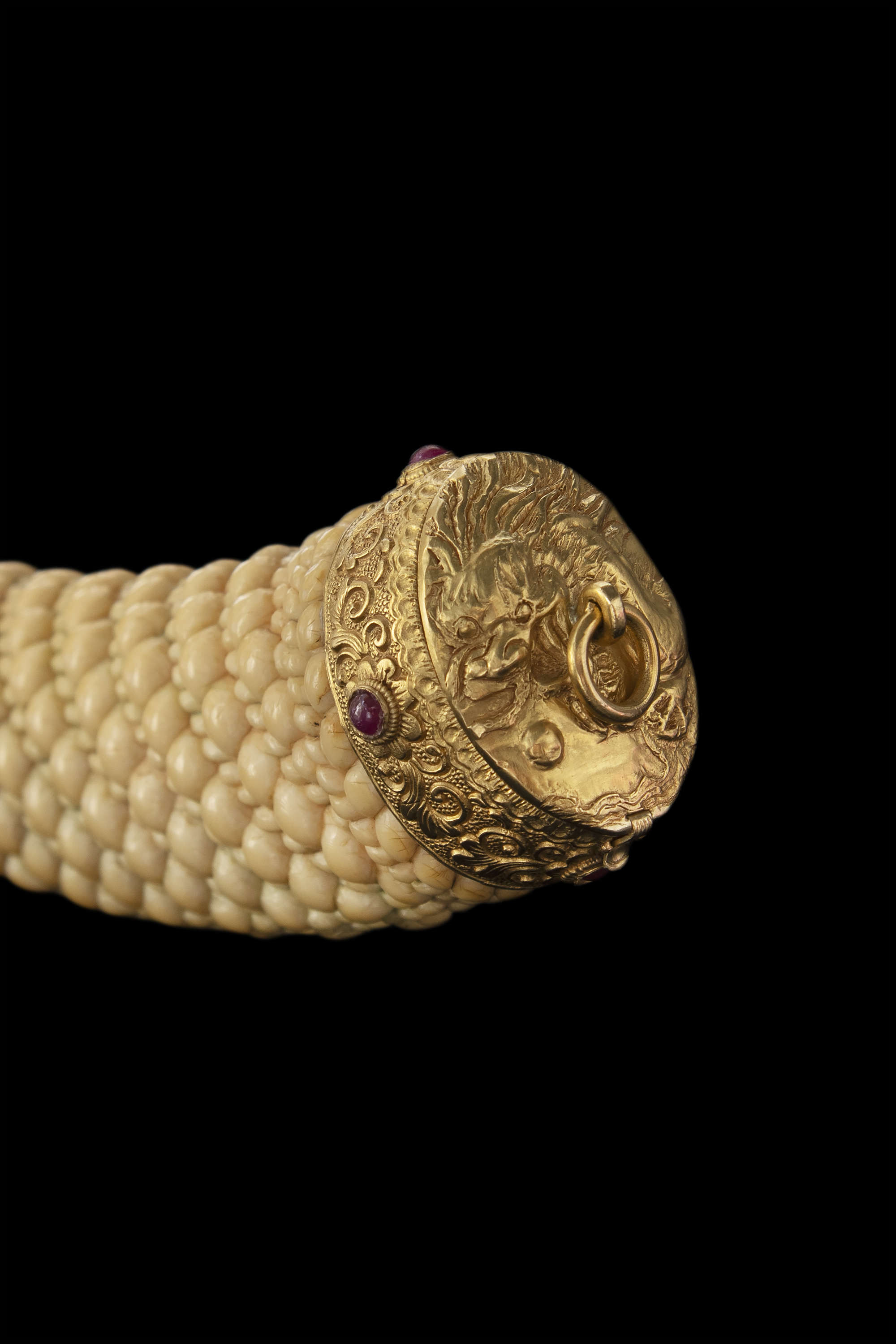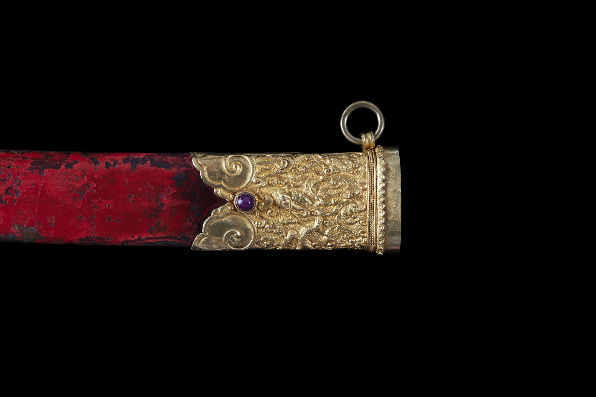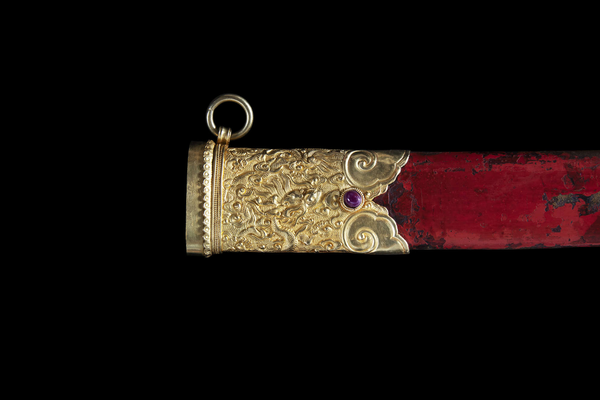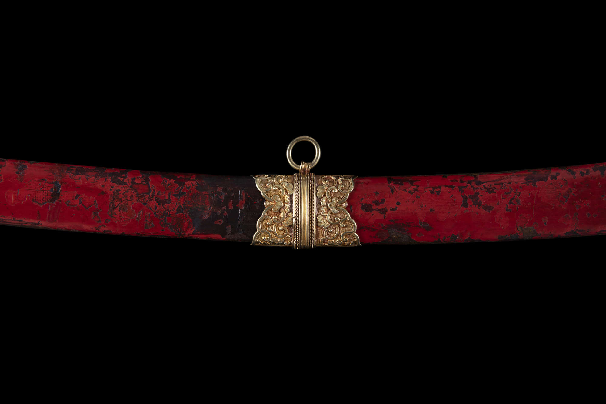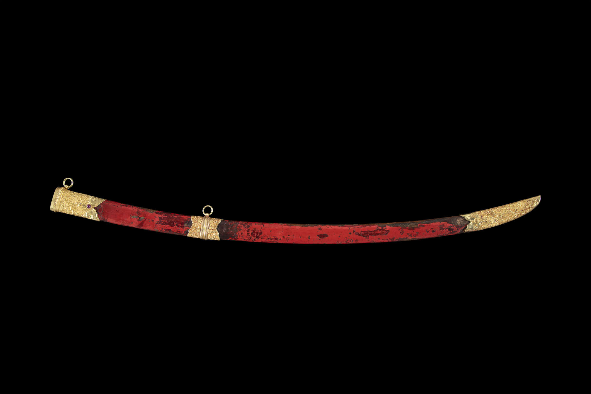 The sword features an elongated S-shape with a spiral-carved ivory grip mimicking a woven rattan handle. The opposite end is connected to a gold repoussé sword guard with two sinuous dragons amidst cloud scrolls, crafted with extreme precision and refinement. The pommel, locket, and chape share similar decorations, while the suspension mount and throat are adorned with blossoms on leafy, scrolling stems. The scabbard is lacquered in red over a wooden core.
