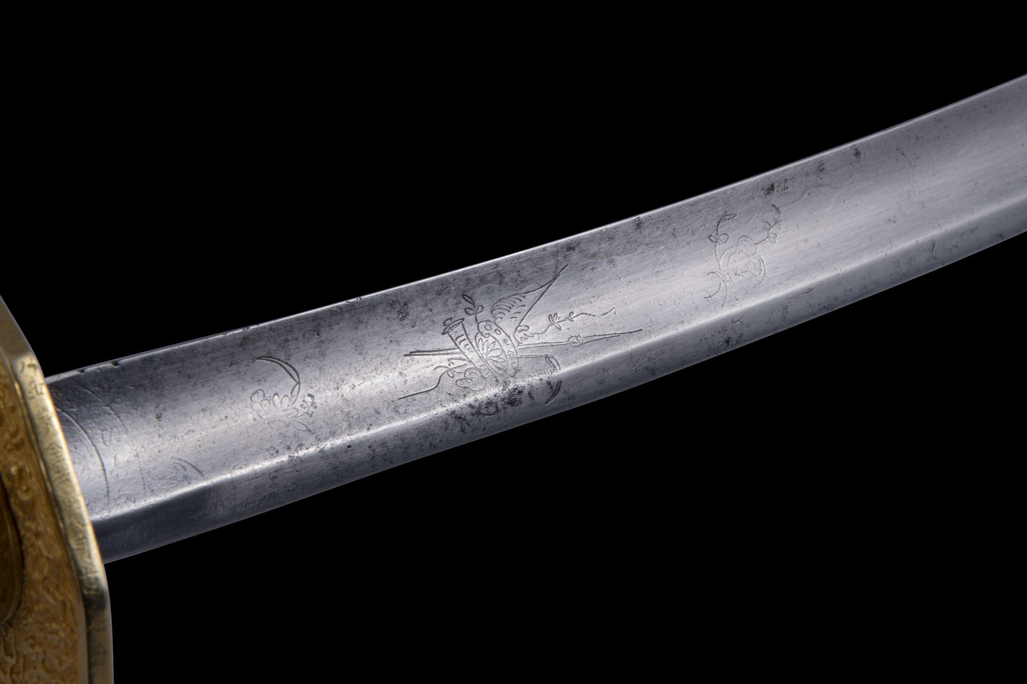 The sword with a steel blade slightly curved with hollow sides and a flat back. Engraved with a trophy of arms and floral decorations. Signed by the manufacturer at the base with "S&K".