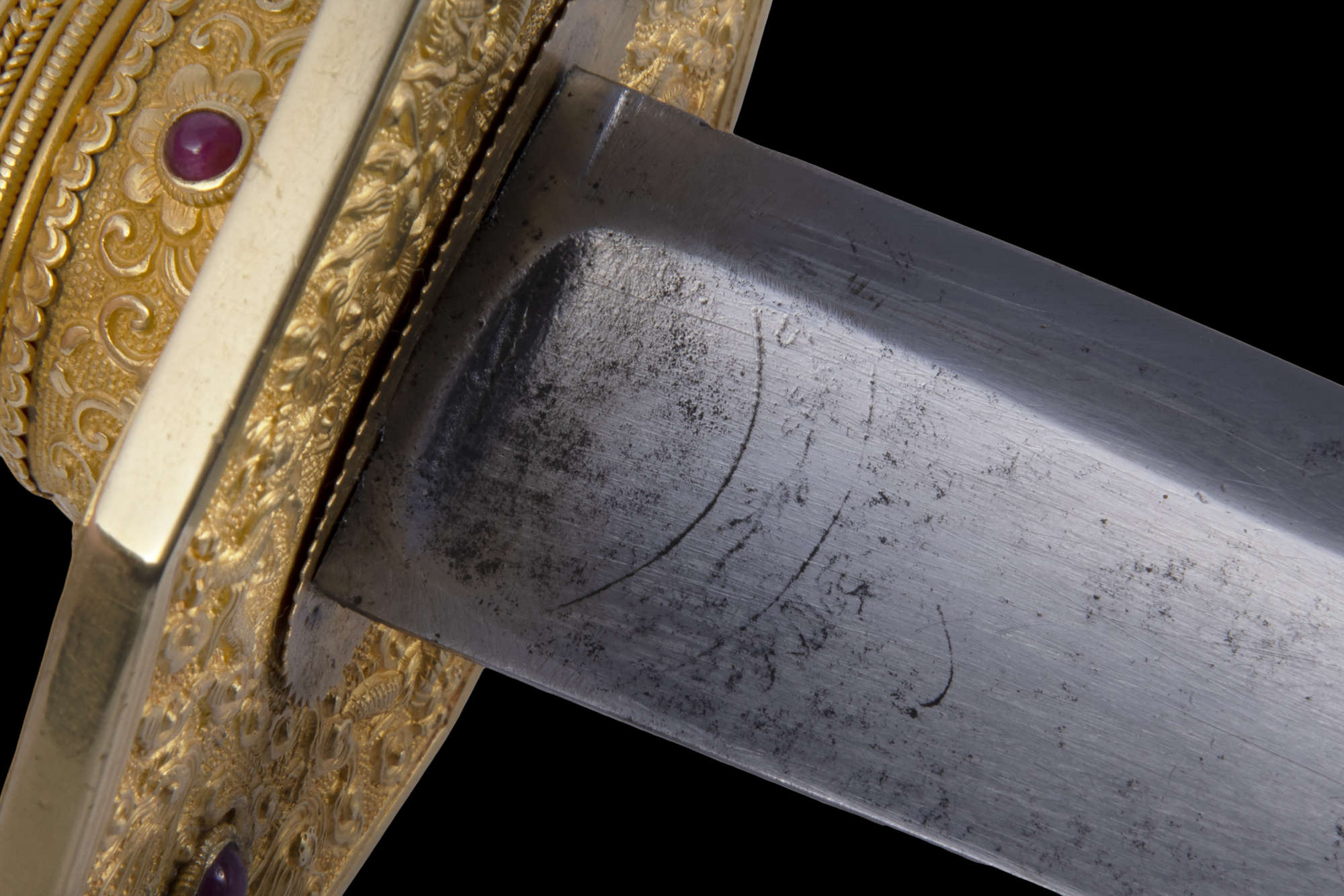 On the octagonal guard’s side engraving in Chinese characters ‘明命贰拾一年奉刻八五黄金共重八兩七寸七分 ‘(possibly be translated to ‘Engraved in the 21st year of Minh Mạng, using 85% pure gold (20 carat), with a total weight of 8 taels, 7 maces, and 7 candareens’). On both sides of the scabbard, specifically in the area close to the guard carved with two inscriptions: “内造 臣 杜?造” (imperially made, your subject, Đỗ Tân made); “二號” (number two).Each stroke of a Chinese character is completed by individual dots.