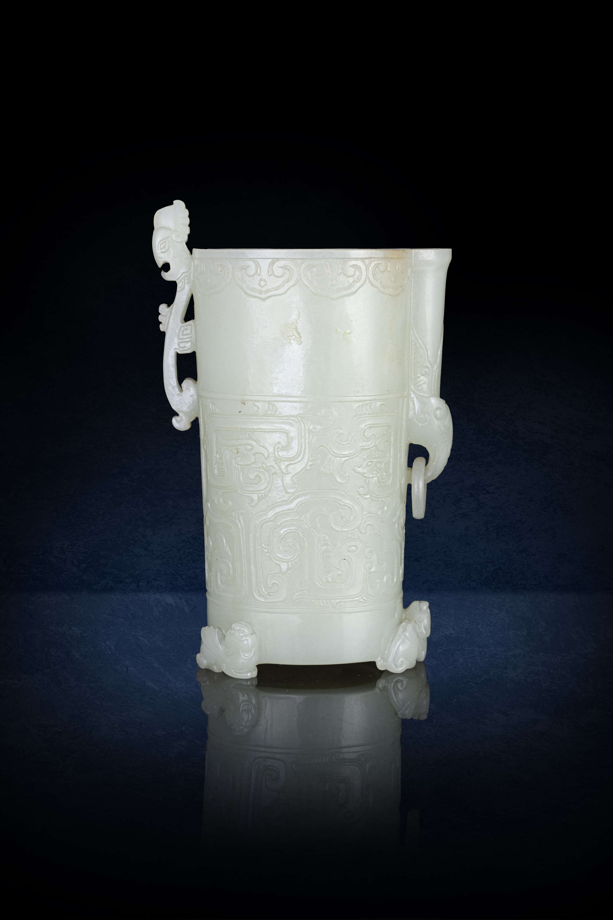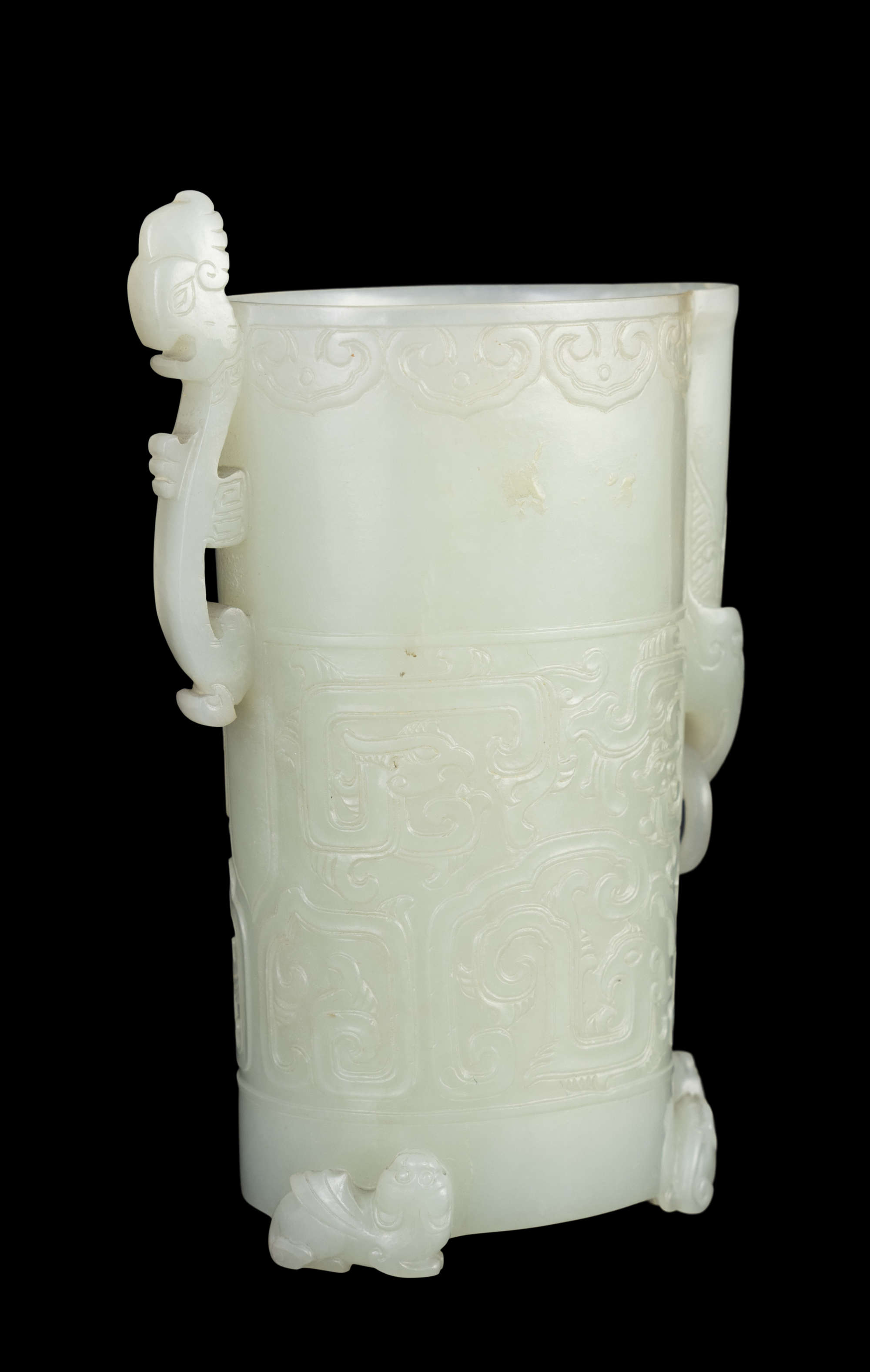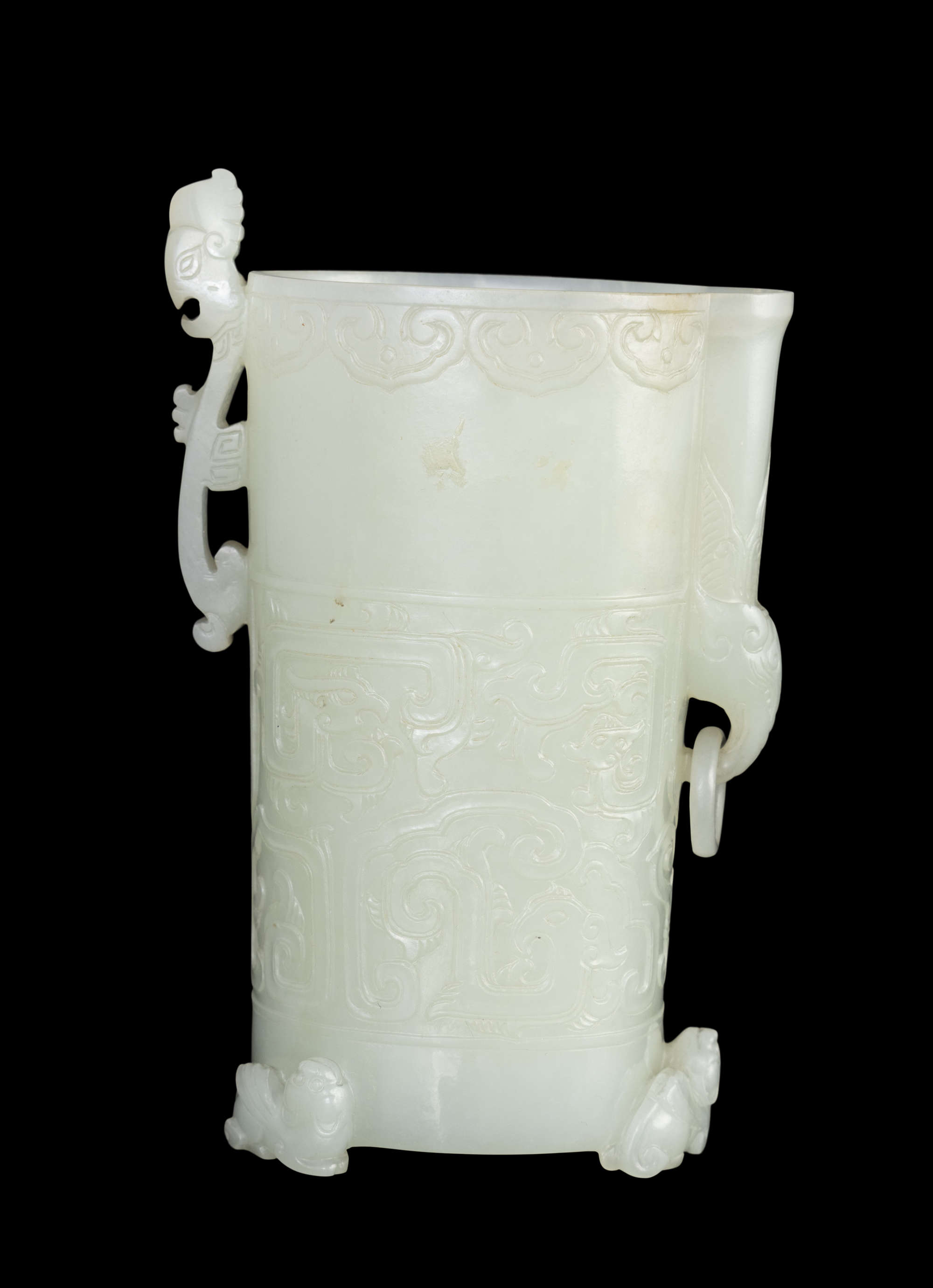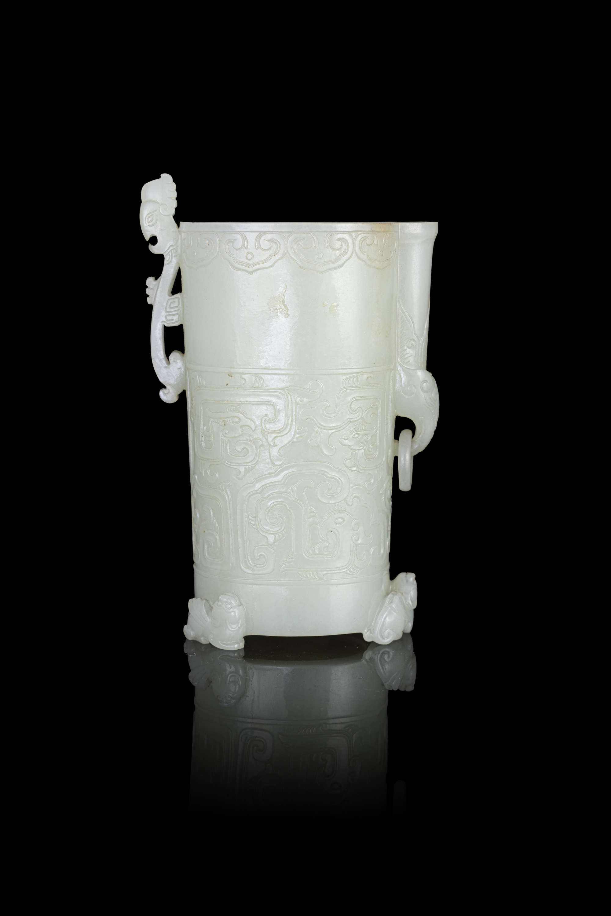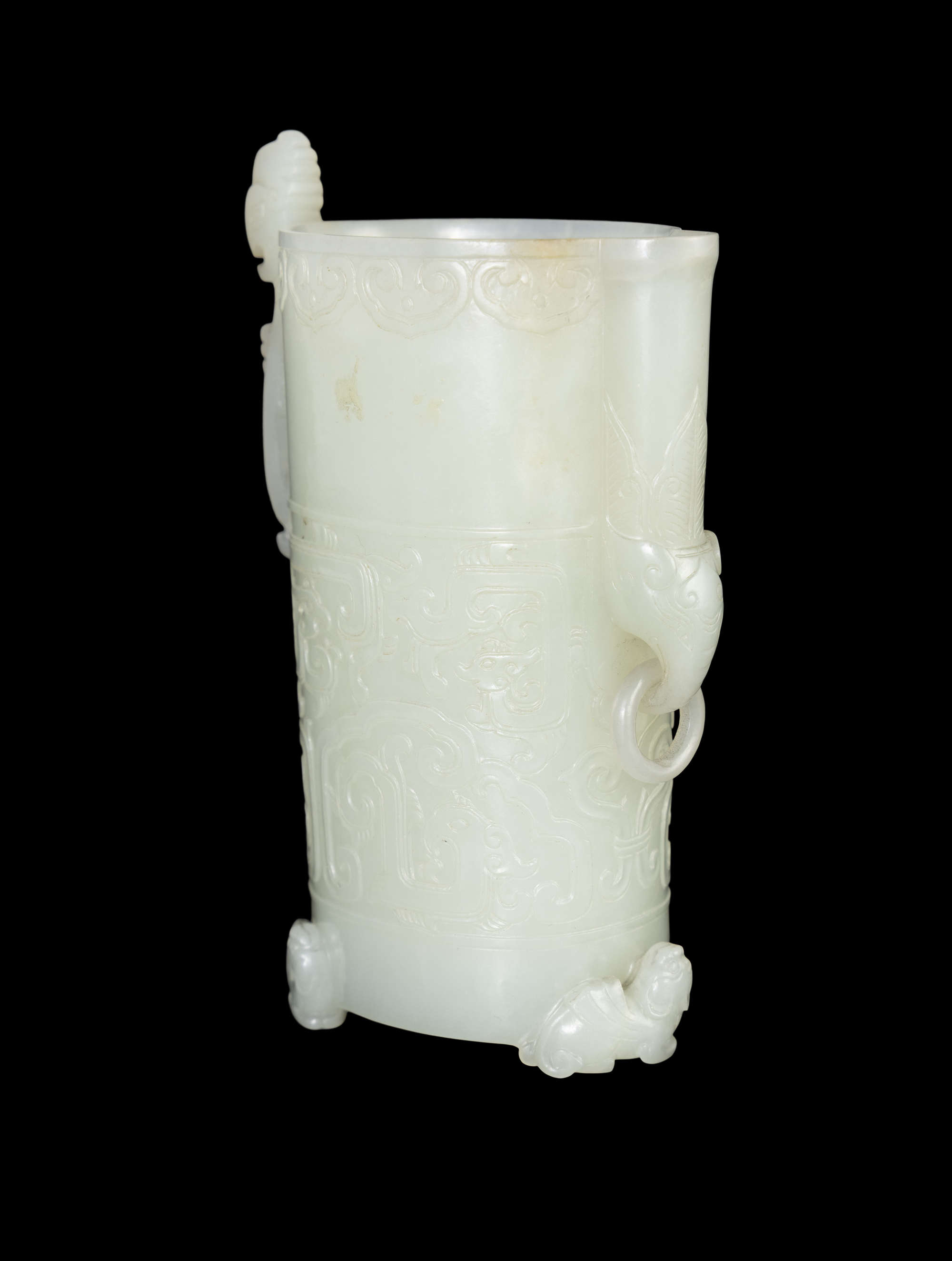 The cylindrical cup is raised on three feet carved in the form of three sitting lions, and is carved around the sides with archaistic confronting phoenixes, one side has a phoenix fibula shaped handle, the other side of the small spout carved an elephant holding a loose ring.