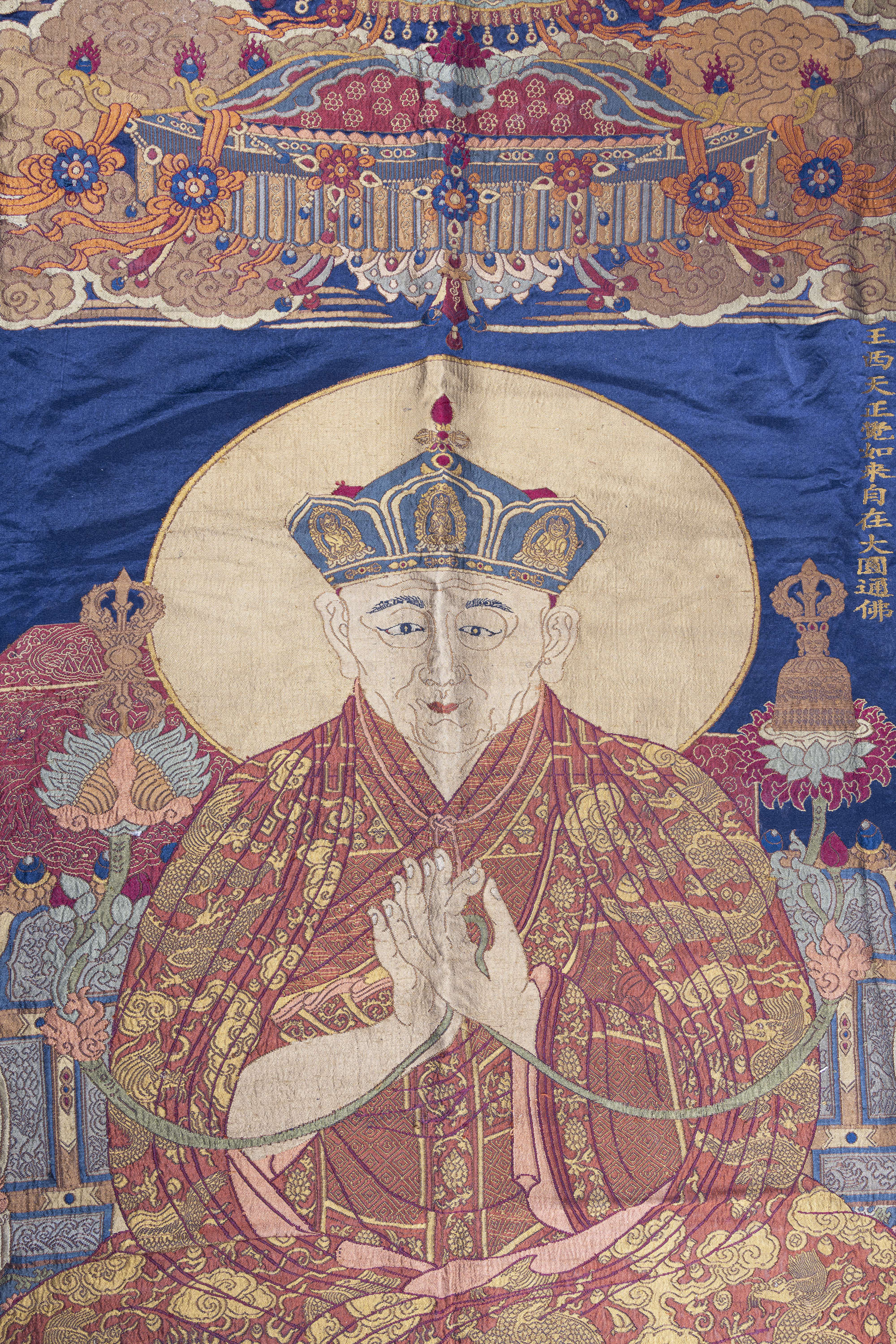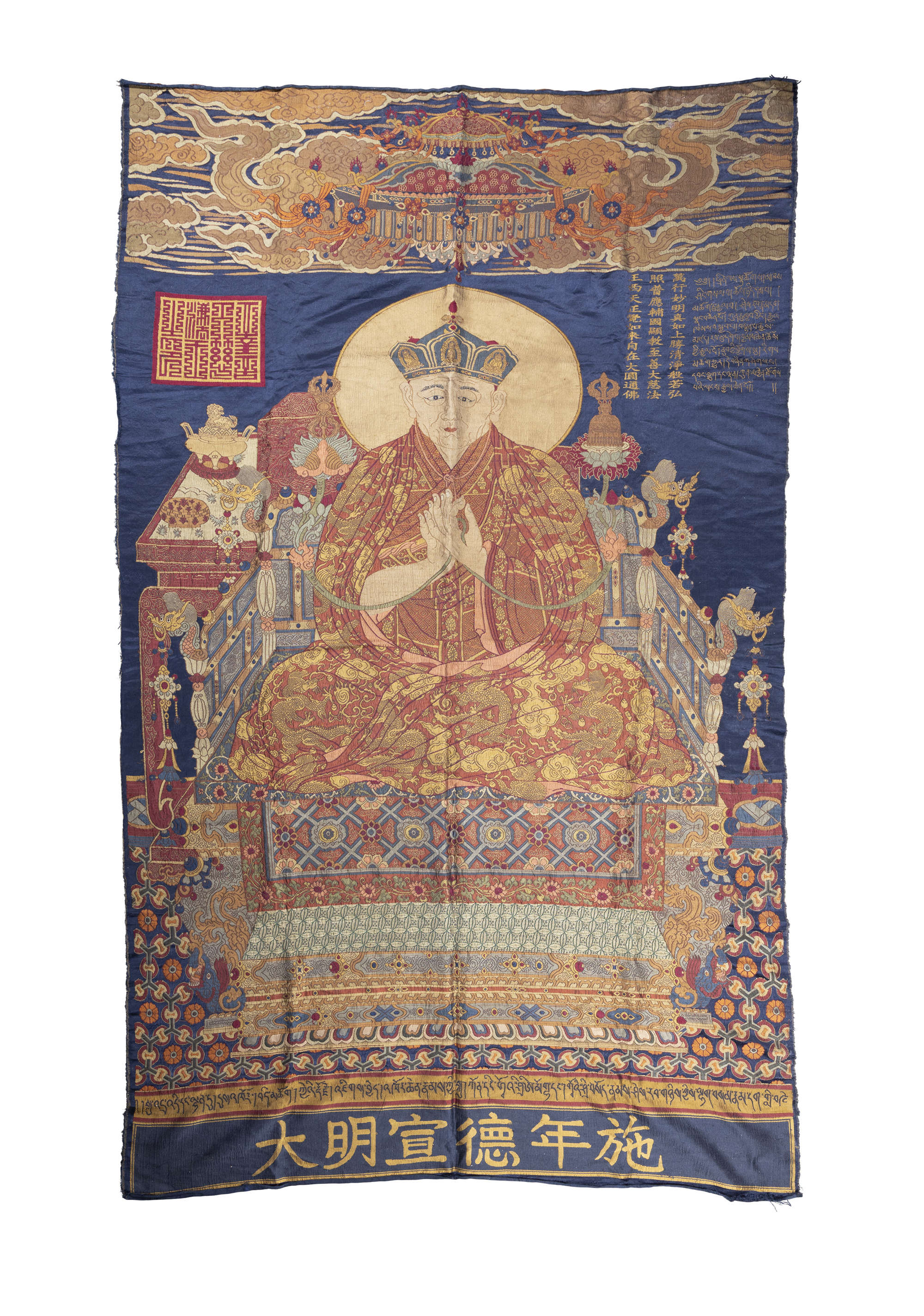 A SILK BROCADE THANGKA OF THE PORTRAIT OF THE MONASTIC PATRONAGE SHAKYA YESHE WITH THREE INSCRIPTIONS IN TIBETAN AND CHINESE, MARKED XUANDE