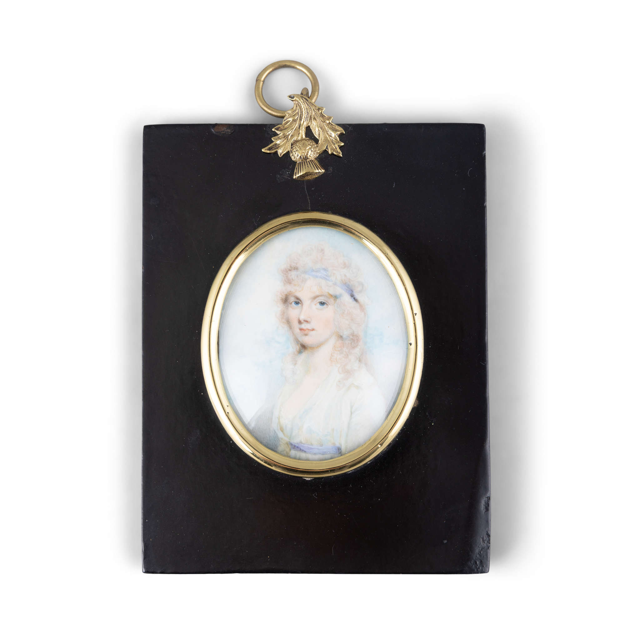 Miniature portrait of Harriett Cockerell (née Rushout) in a pale blue dress with blue ribbon around both waist and hair