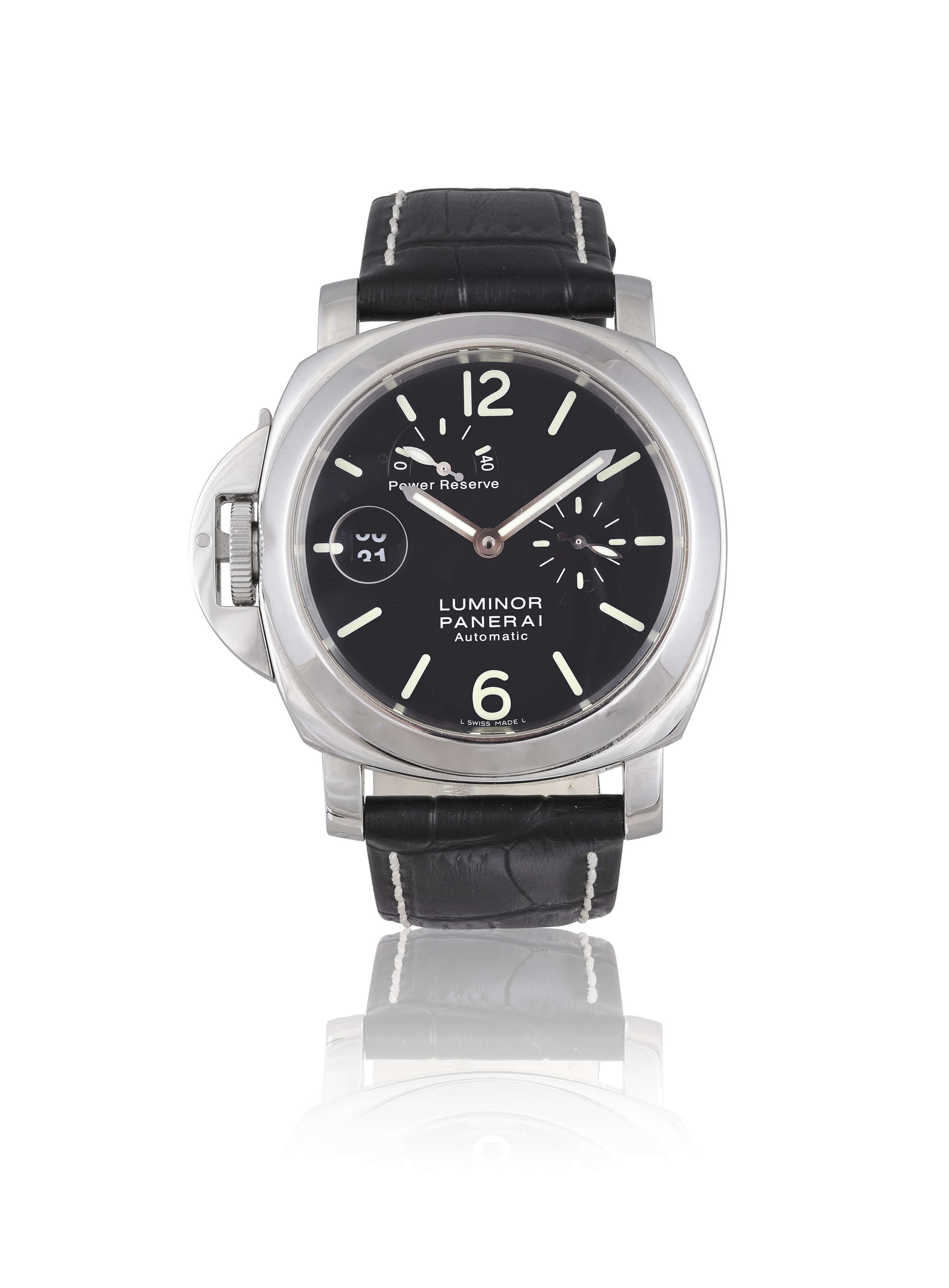 Dial: Black dial with luminous Arabic numerals at 12 and 6, luminous baton hour markers, subsidiary seconds at 6 o’clock, power reserve indication between 10 and 12 o’clock, date aperture at 9 o’clock with cyclops magnifier, signed LUMINOR PANERAI Automatic.
