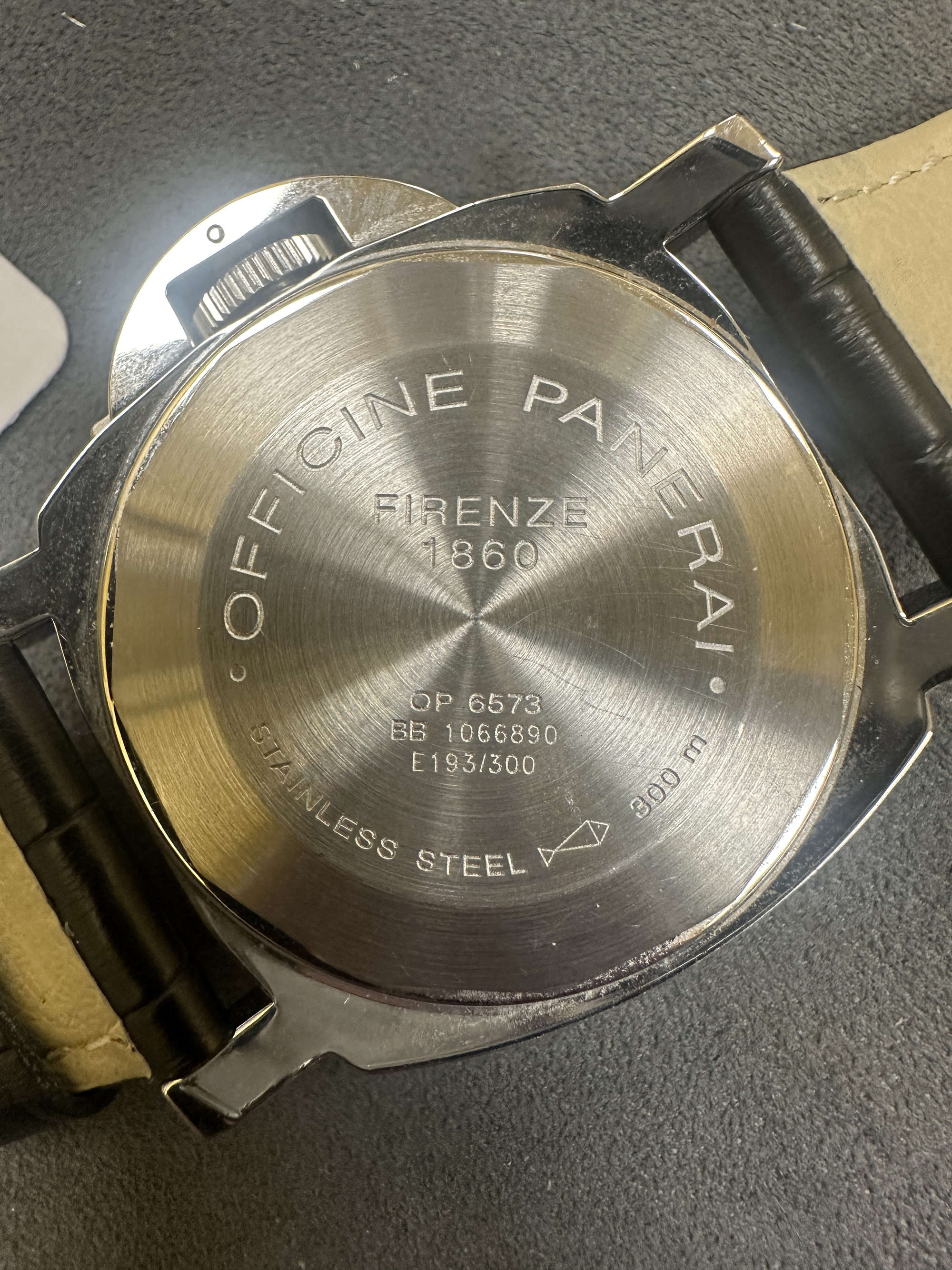 Case: Stainless steel cushion-shaped Luminor case, screw-down back engraved OFFICINE PANERAI FIRENZE 1860, OP 6573, BB 1066890, E193/300, water-resistant 300 m; crown-locking bridge device, signed.