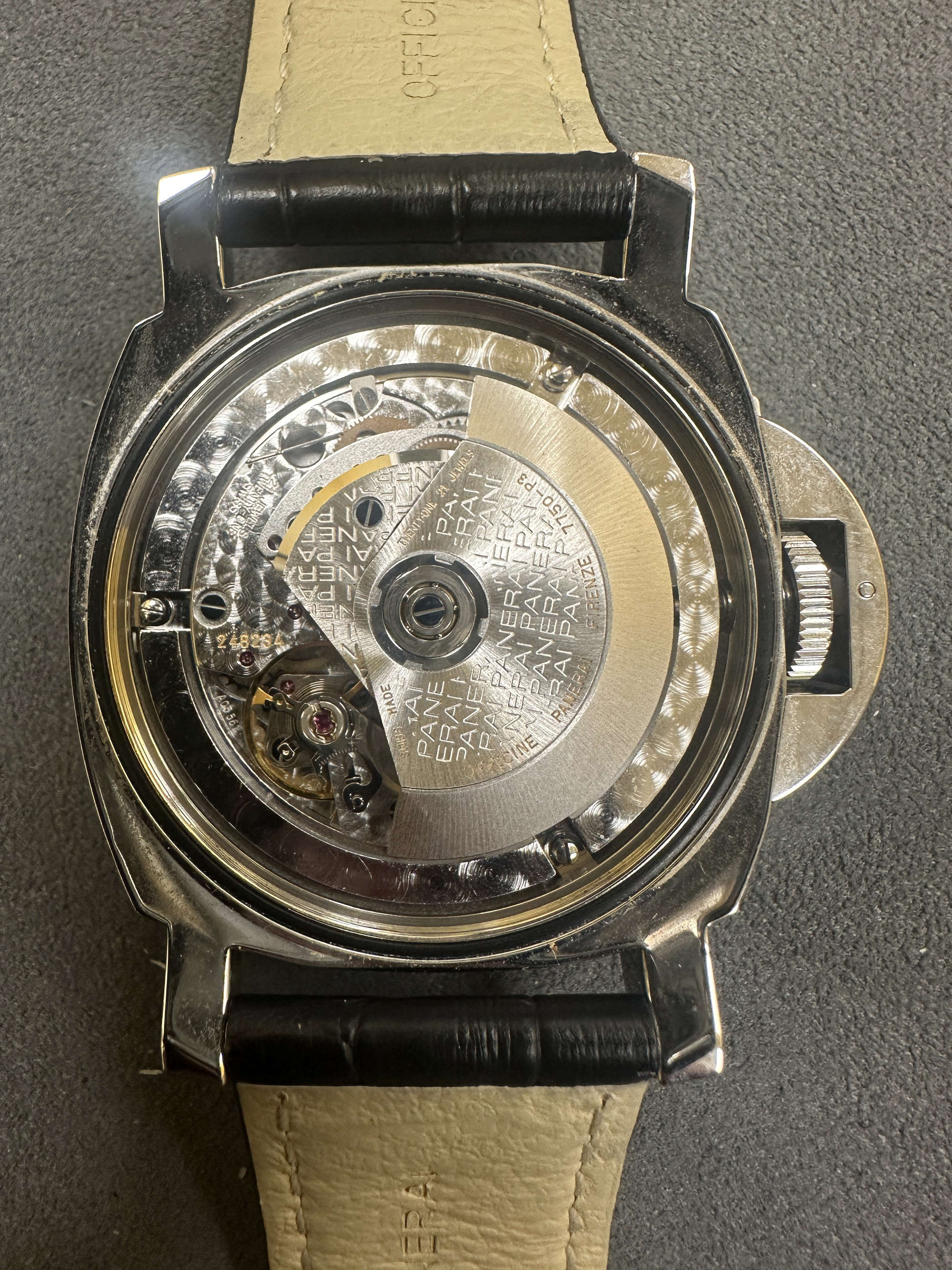 Bracelet/Strap: Black Panerai leather strap with stainless steel Panerai pin buckle.