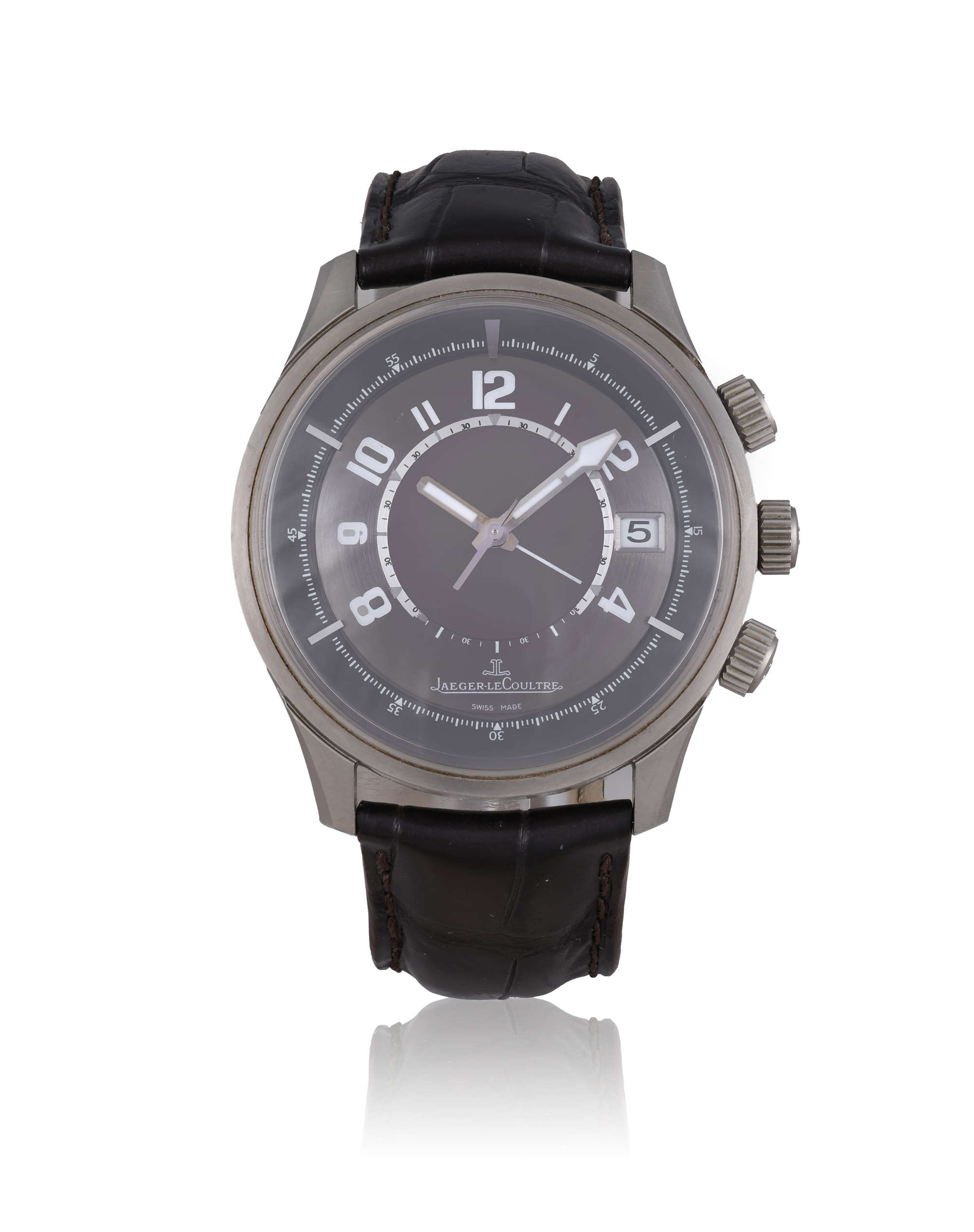 Dial: Grey sunburst dial with applied luminous Arabic numerals and indexes, two-tone inner rotating disc for alarm setting, outer minute track, luminous baton hands, date aperture at 3 o’clock, signed JAEGER-LECOULTRE.