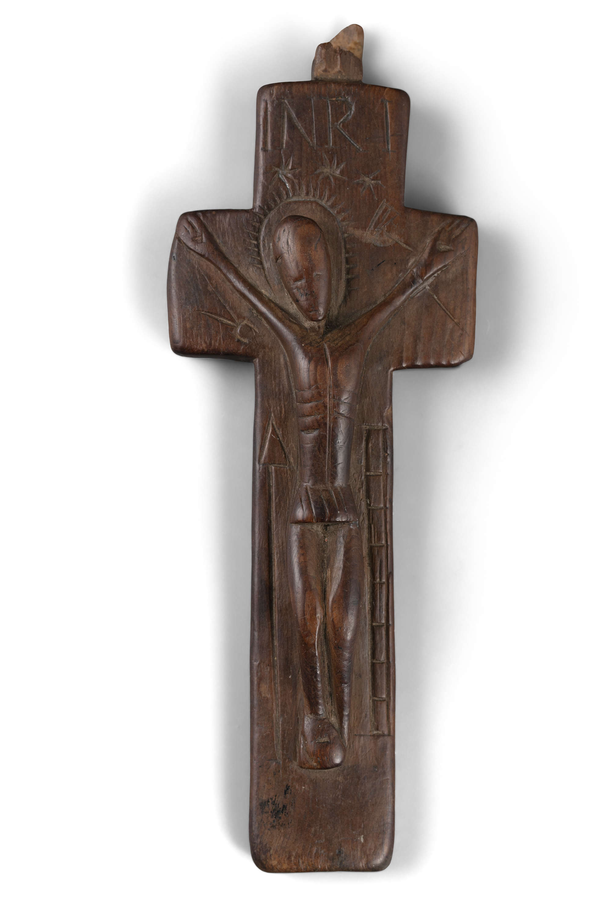During a period of economic, social, and religious oppression of catholics in Ireland, known as the Penal Laws, Catholics found solace in portable, tangible relics of worship. Among these devotional artifacts were the Penal Crosses, simple wooden crosses with a figure of Christ carved in high relief at the center, and symbols representing the Passion of Christ around the central figure.