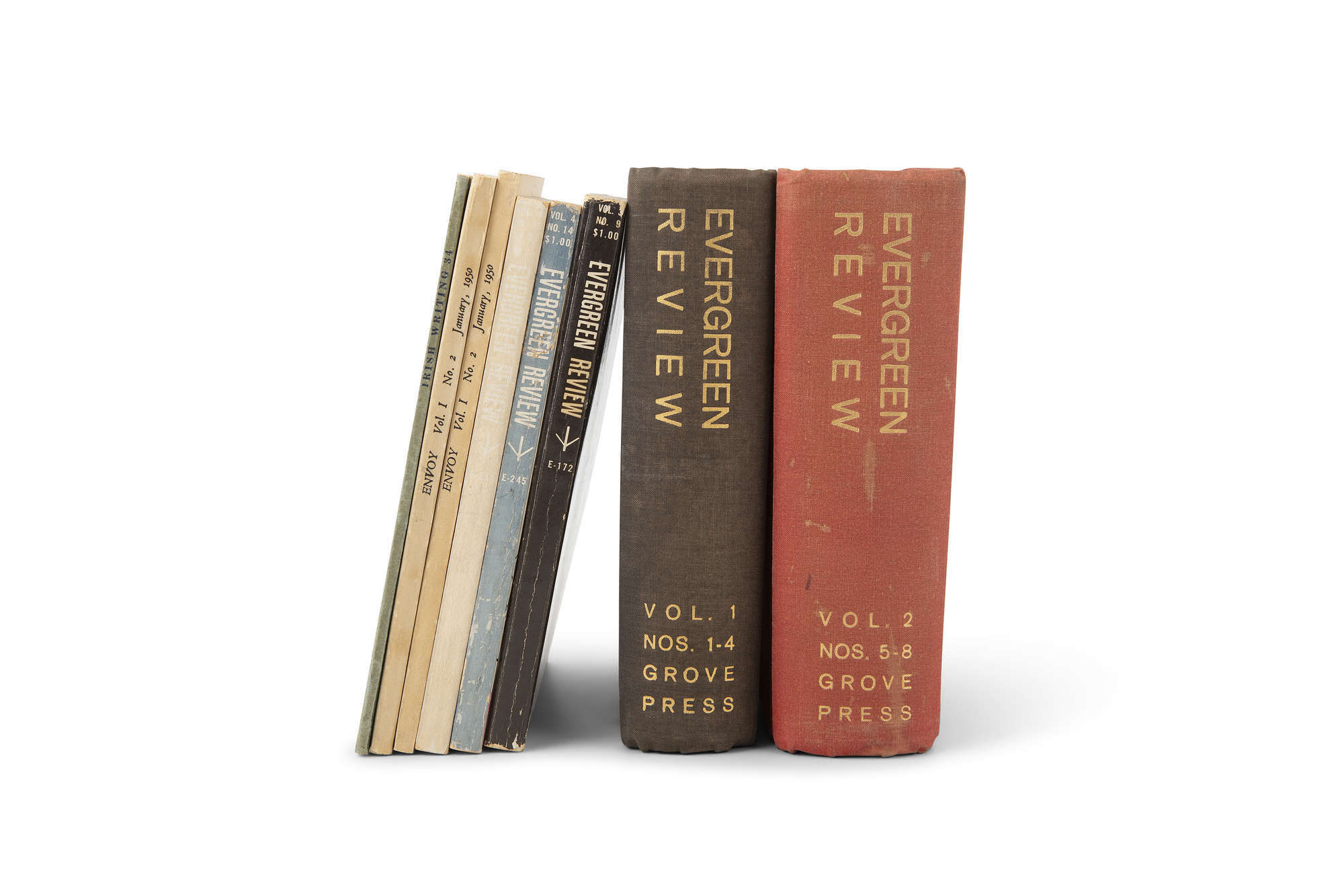 EVERGREEN REVIEW. Grove Press, New York 1957-59. Vol. 1-2, nos. 1-4, 5-8 bound in two volumes in publishers cloth. Contains Becketts Dante and the Lobster and other items, also work by Sartre, Michaux, Ionesco etc. With loose numbers 9, 14, 15, wrappers, and issues of Envoy (2 copies) and Irish Writing with Beckett items. (8)