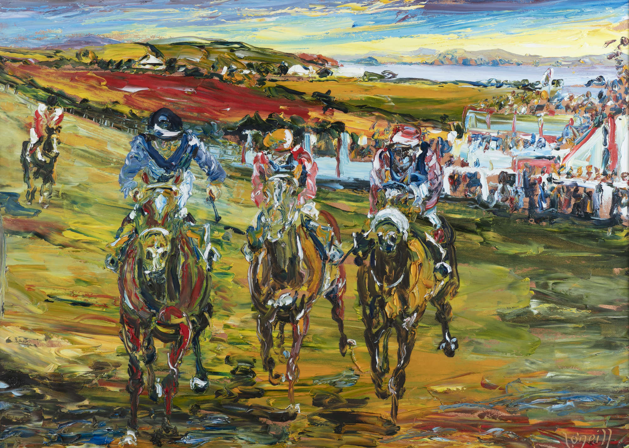 Having left at the age of 17 to pursue a career in Dublin, he returned to Kerry in 2002 and continued to develop his passion for painting his native place. His work reflects many aspects of life in West Kerry, especially the ones that are fast-fading from living memory; the old ways of farming from herding sheep and cows, to saving hay and cutting turf. Horses and horse fairs dominate his paintings, from memories of his days as a youth visiting Dingle Fair with his father.