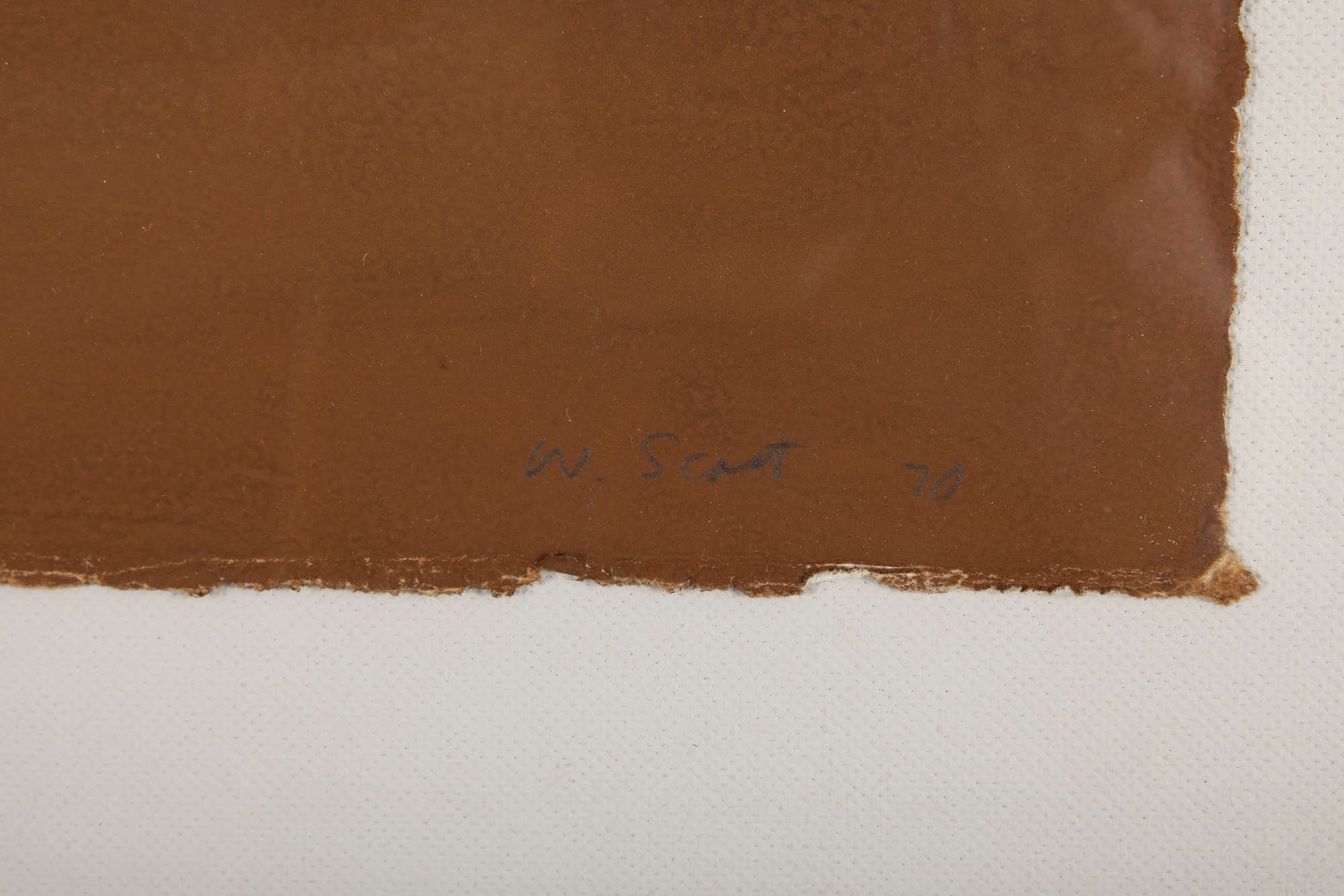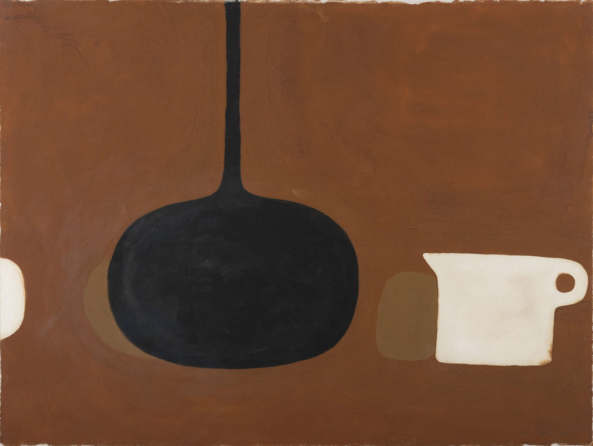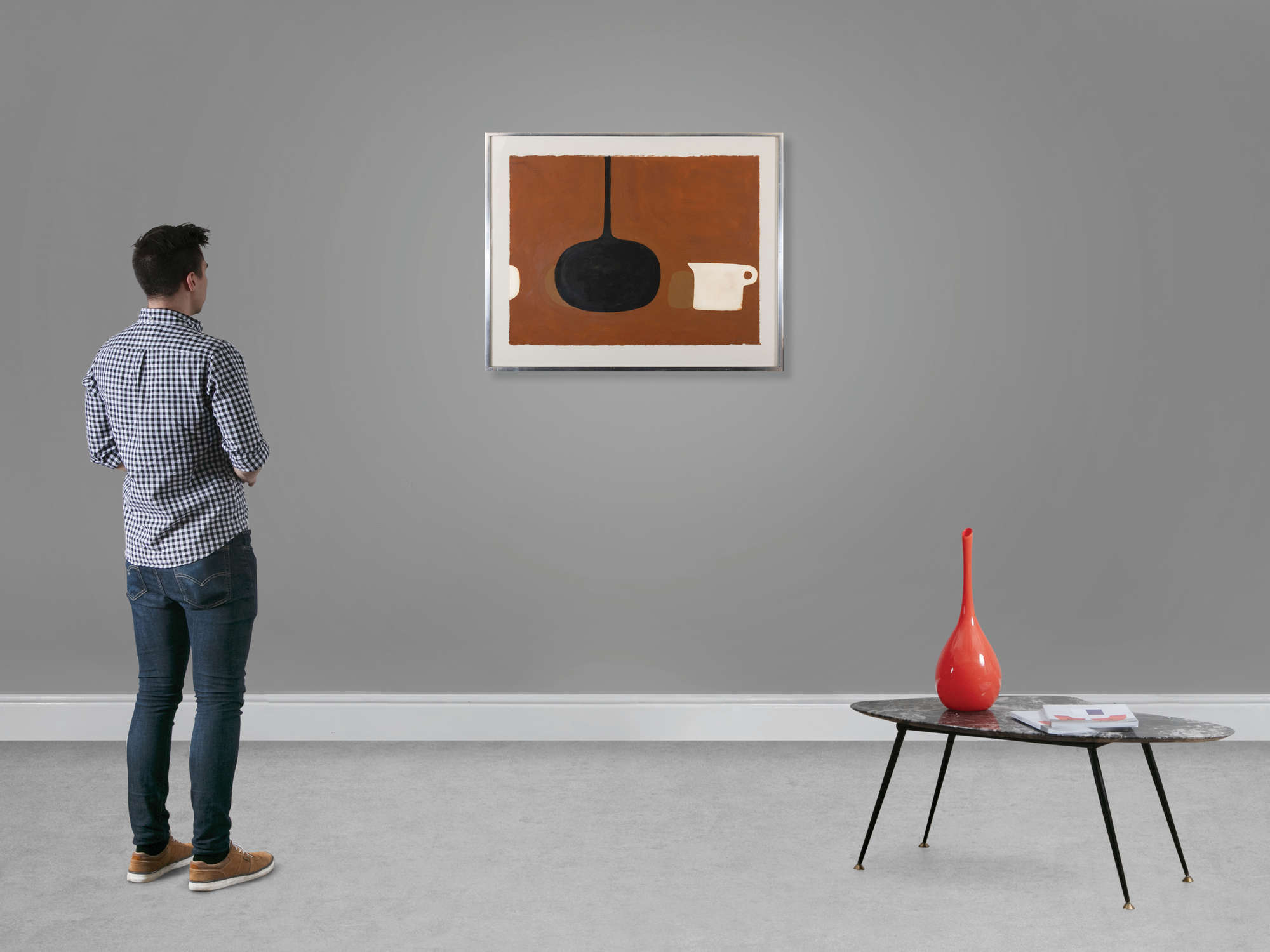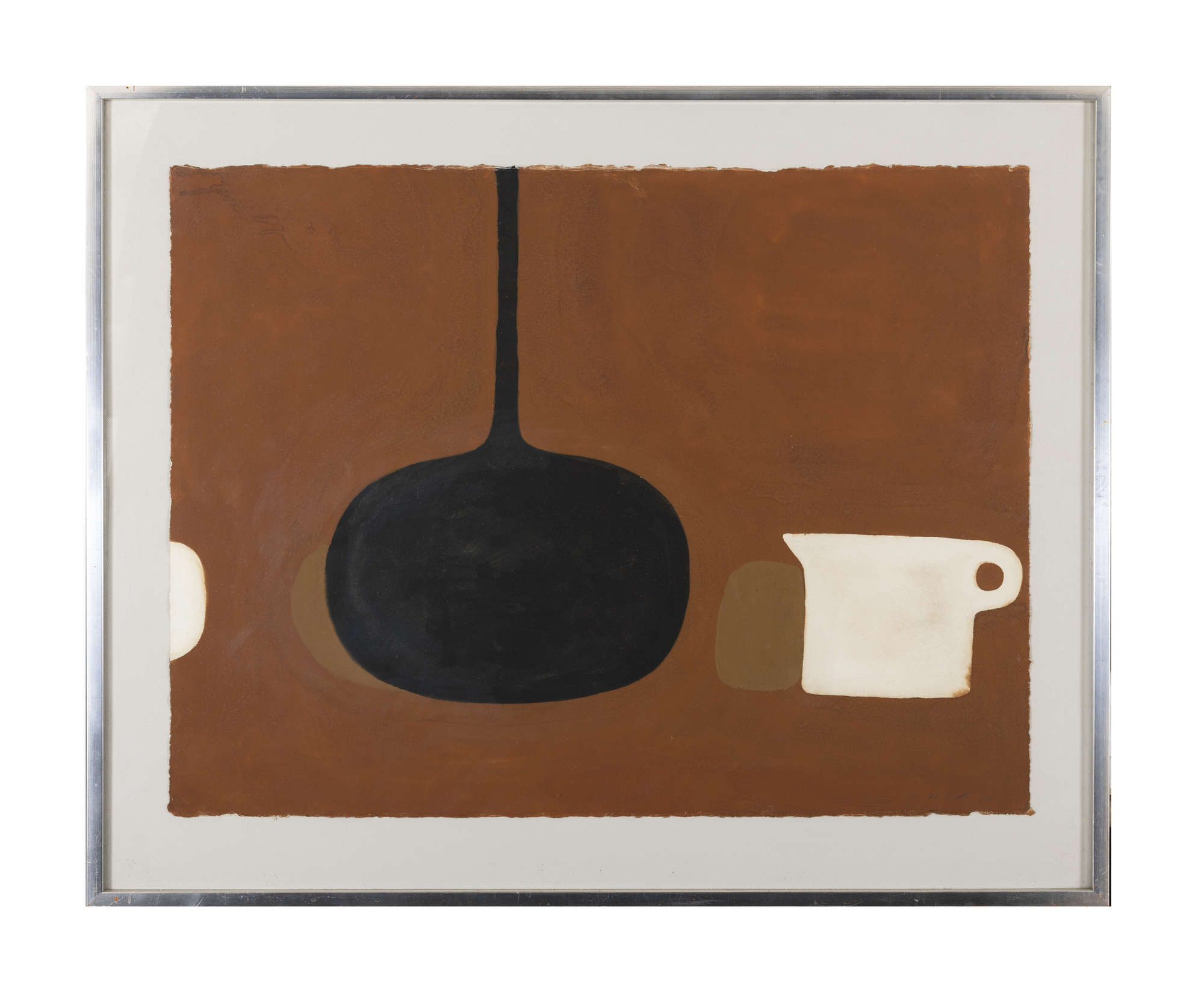 Still Life No.2 (1970) demonstrates characteristics that can be observed in iconic works by William Scott, such as Still Life Brown with Black Note (1969)(1). Still Life No.2 comprises colours and forms typified by the artist at the time: a flat black profile appears suspended, suggestive of the profile of a skillet, familiar in Scott's work. A white circular object to the left is cut off by the edge of the painting, while on the right a white jug, another form that appears in Scott's work, is presented like a stencil against the red-brown ground. The background shows the marks of the brush, and there is a suggestion of shadows thrown by some of the objects. The slight 'bleeding' of paint at the edges of objects, softens their otherwise austere profiles, and indicates the hand-crafted dimension of the artwork, and introduces a human dimension to the austerity of the arrangement. The composition is spare and spacious, a marked distinction from Scott's still life paintings of the 1950s, which featured crowded, almost chaotic, 'table top' images connecting the artist and viewer more closely with the domestic realities of a busy kitchen environment. The present painting reflects the more abstract and symbolic nature associated with the later works of the painter. Once he divested his repertoire of the food items (fish, eggs, vegetables) evident in his earliest work, Scott's particular selection of items reflects his stated preference for man-made over 'natural' things, perhaps identifying with durability despite repeated use, over organic fragility.