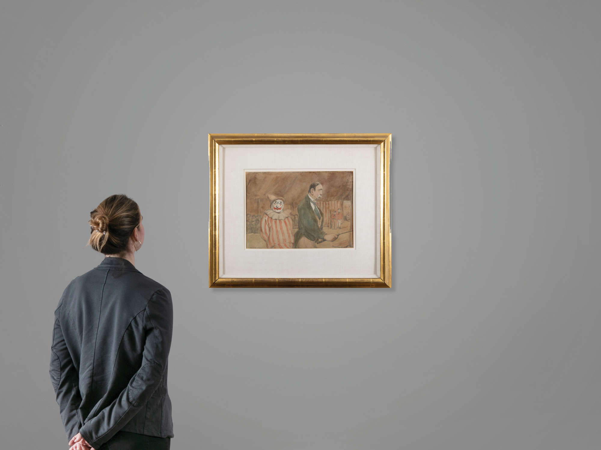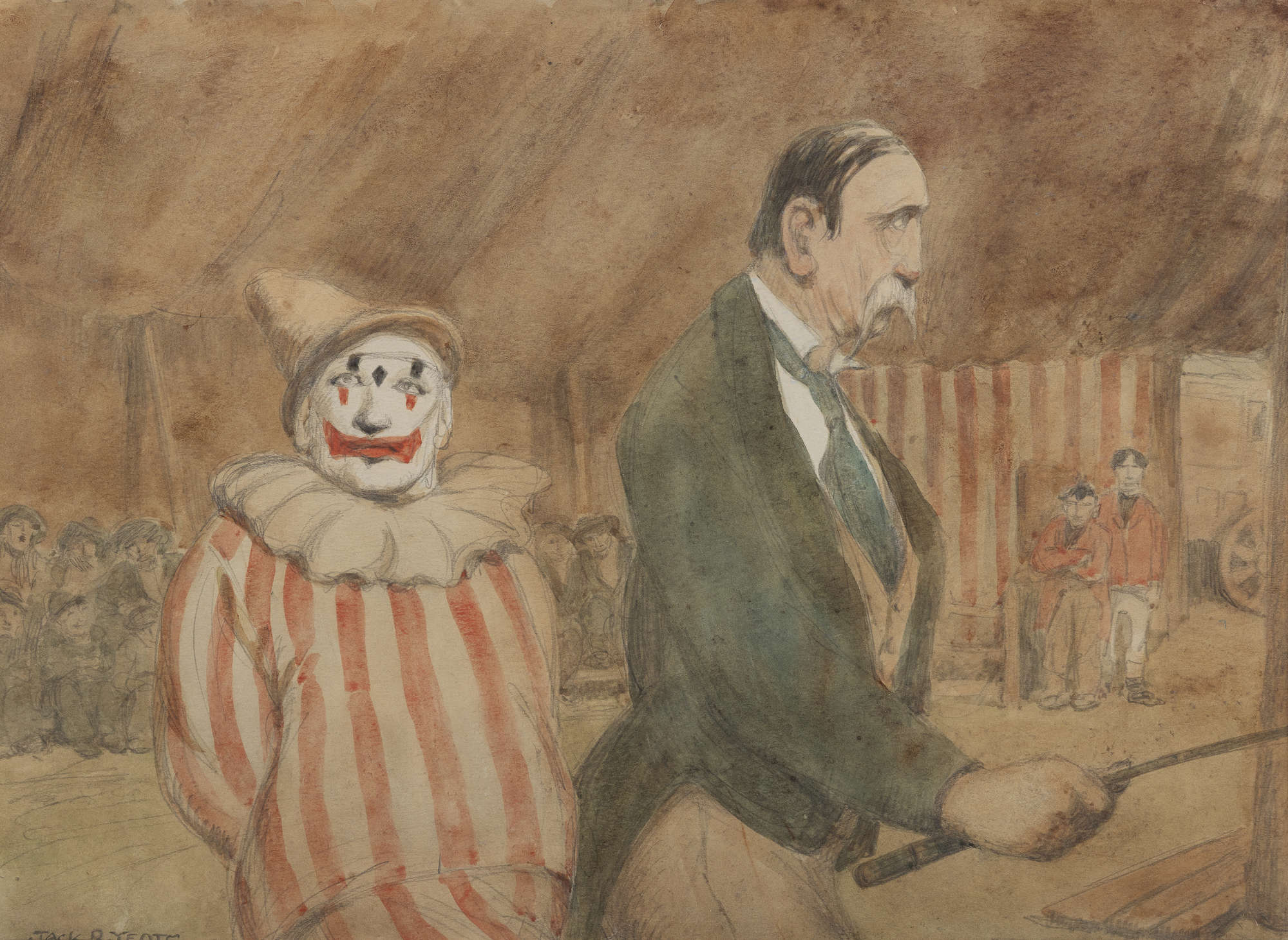 Yeats writing in And to You Also in 1944, described ‘the parasol of the auditorium’ of the circus tent. ‘The sad-faced clown stumbles along on the ring-master’s left, while up above the ring-master on his right, sits the beautiful girl … on the back of a grand old cream horse … ’. The circus life theme stayed with Yeats throughout his career, the images from his childhood life in Sligo indelibly etched on his pictorial memory, notably in The Haute École Act and That Grand Conversation was under the Rose, the oils of 1925 and 1943. In the present work the clown is, as Hilary Pyle describes ‘…. in merry mood, looking coyly at the spectator’.