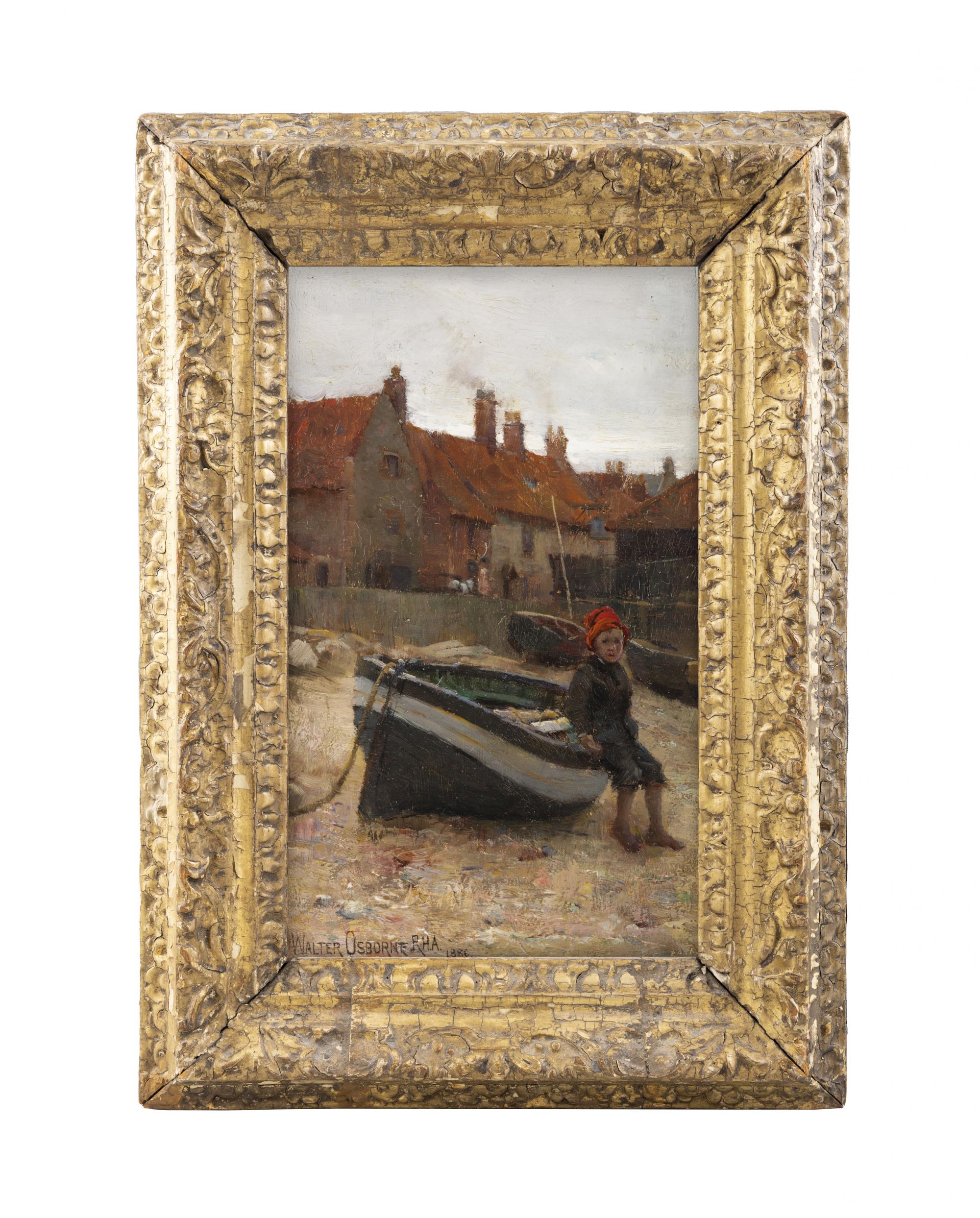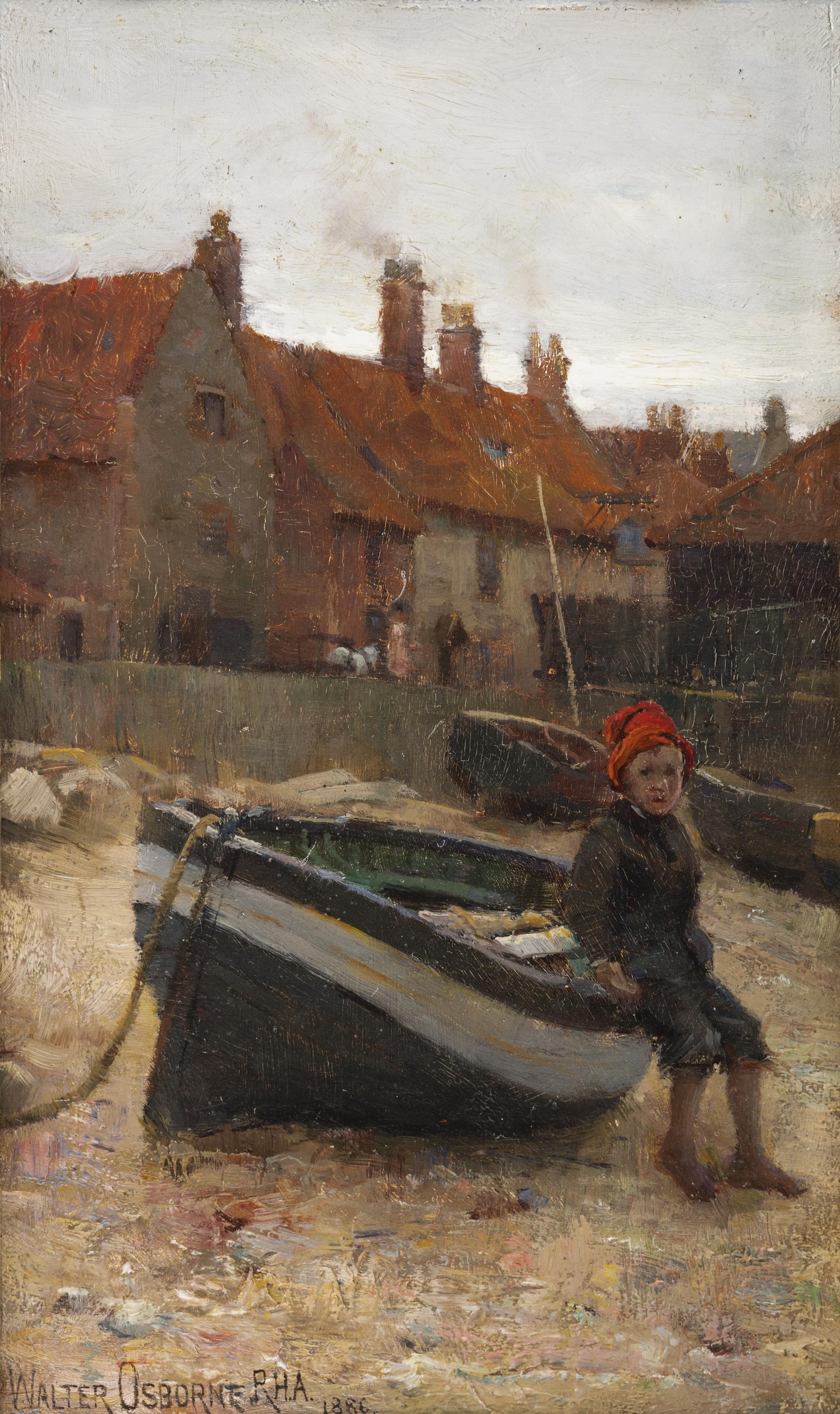 A small barefoot boy sits upon a rowing boat which is drawn up on a sloping beach. Behind is a wall and a cluster of red roofed houses. The scene is in shadow, but the gleaming light in the sky suggests that it may be daylight rather than dusk. The exact location of the picture is not known. From 1884 to the early nineties Walter Osborne painted in a number of English coastal villages including Southwold, Walberswick, Hastings and Rye. The setting here may be a riverside scene in Lincoln, or possibly Wells - Next-the-Sea on the north Norfolk coast, which Osborne visited c.1885-1886.