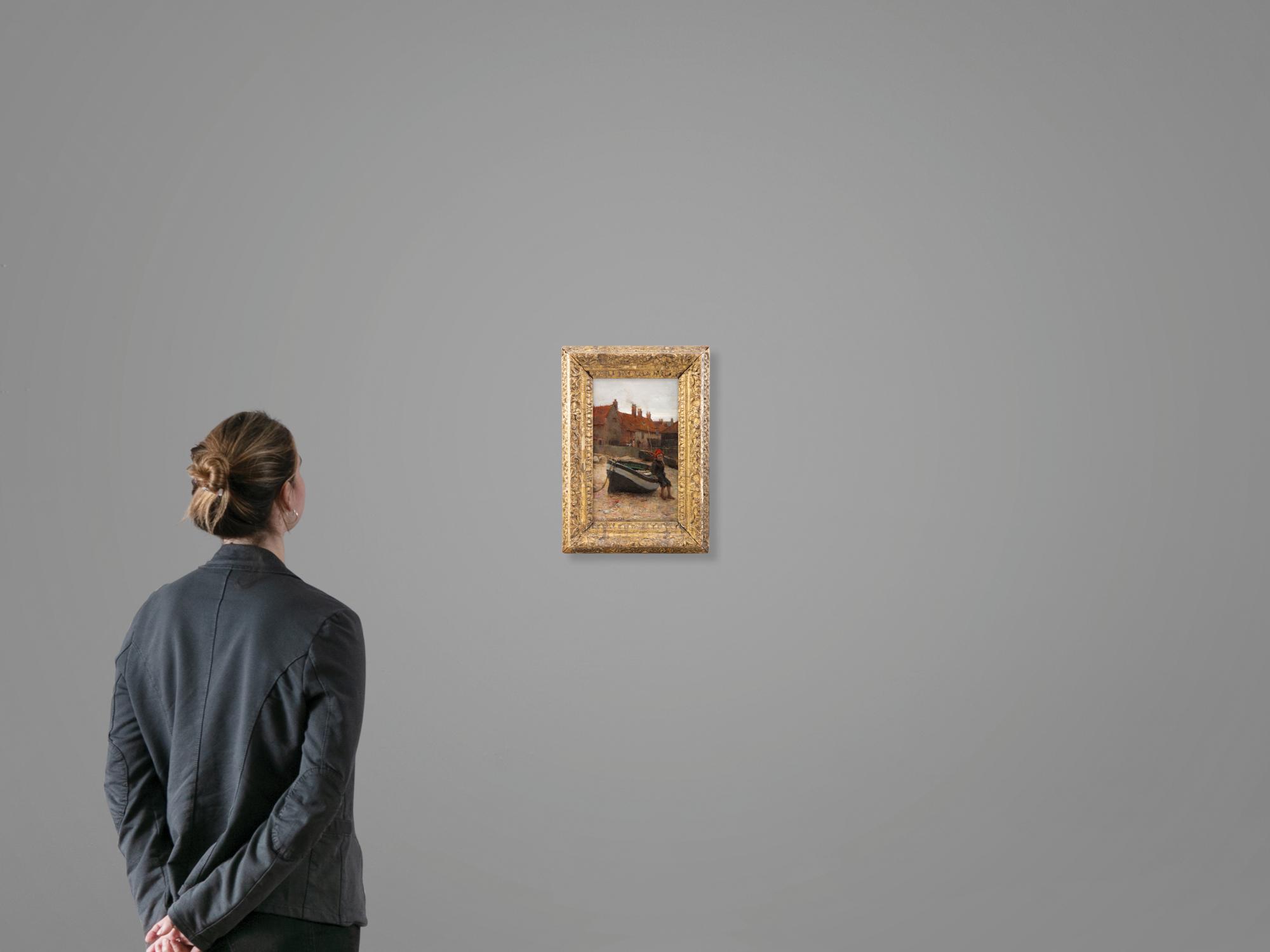 In earlier times this small town had been an important port, conducting a thriving trade with Holland. But the harbour had sifted up and Wells was now situated a mile inland, while still retaining its long quayside. Rowing boats are drawn up upon the beach, and a small ragged boy leans against the boat in the foreground. In his seaside pictures Osborne loved observing the children who hung around the harbour, assisted the fisherman, played games and told stories. The boy looks at the viewer with curiosity. Osborne notes details such as his red headwear, a rope, a mast or stick, a small group of people in front of the house and the tall brick chimneys with smoke rising.