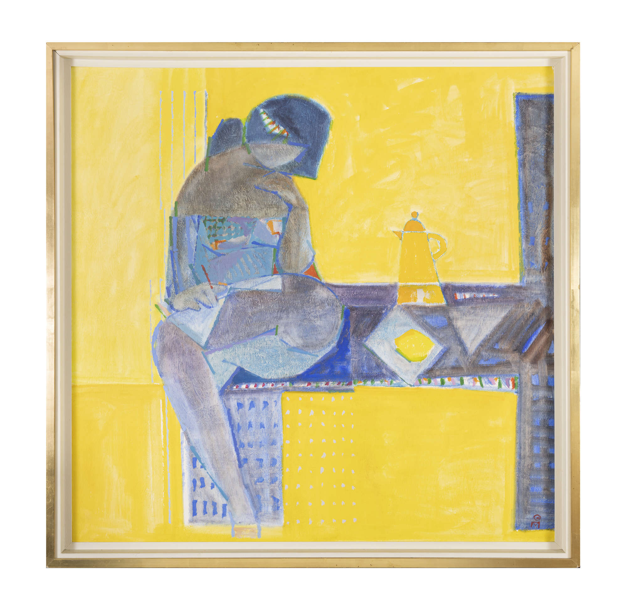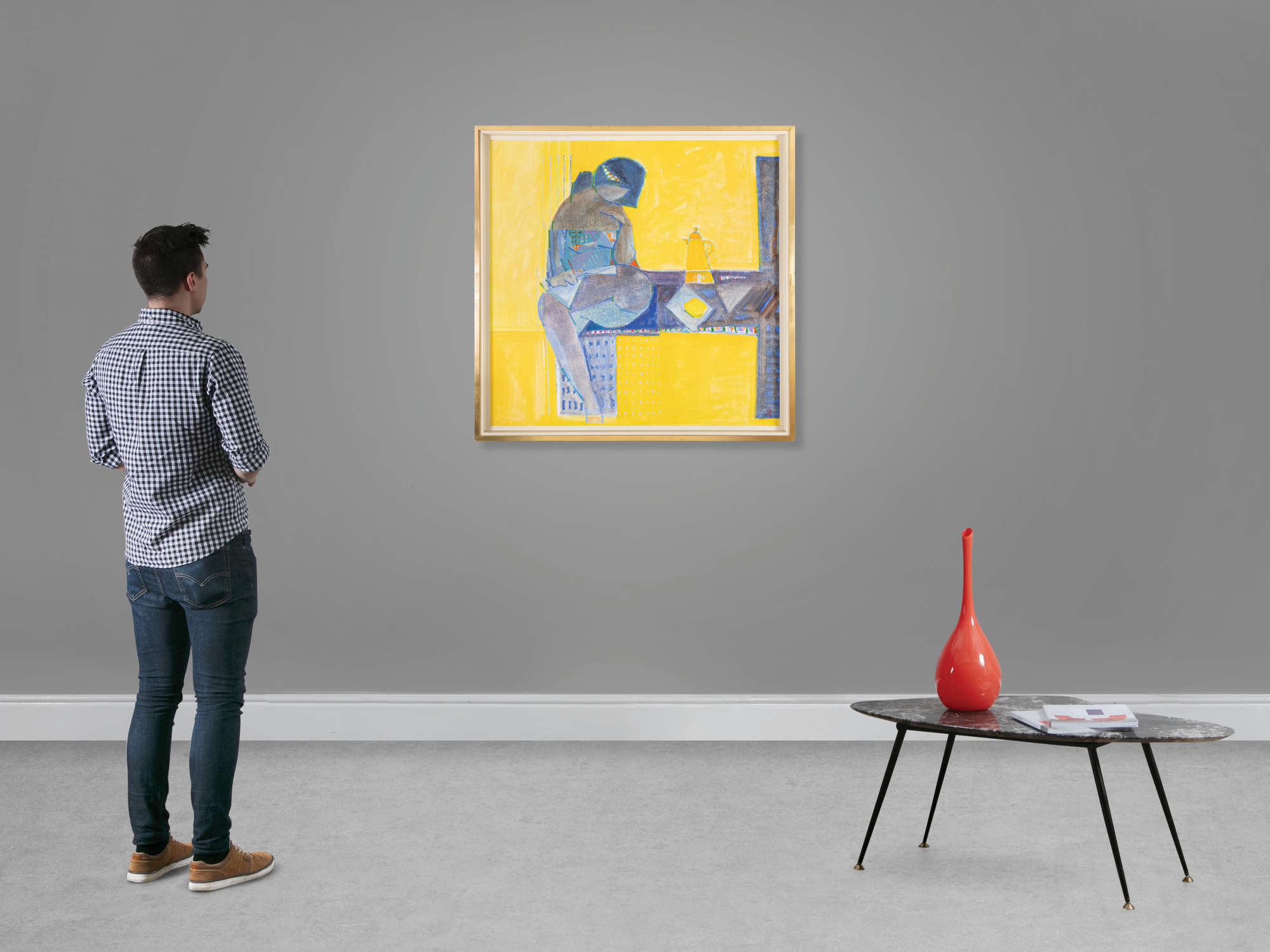This is particularly notable in the yellow that dominates the painting and recalls a group of paintings inspired by a visit to Bruges in 1965, while also prefiguring the dramatic use of high-pitched colour in Middletons later work, which was primarily influenced by the light of Spain and Australia. There is a classical division of the picture space, and shapes that form the female figure are repeated in the coffee pot, creating movement across the composition.