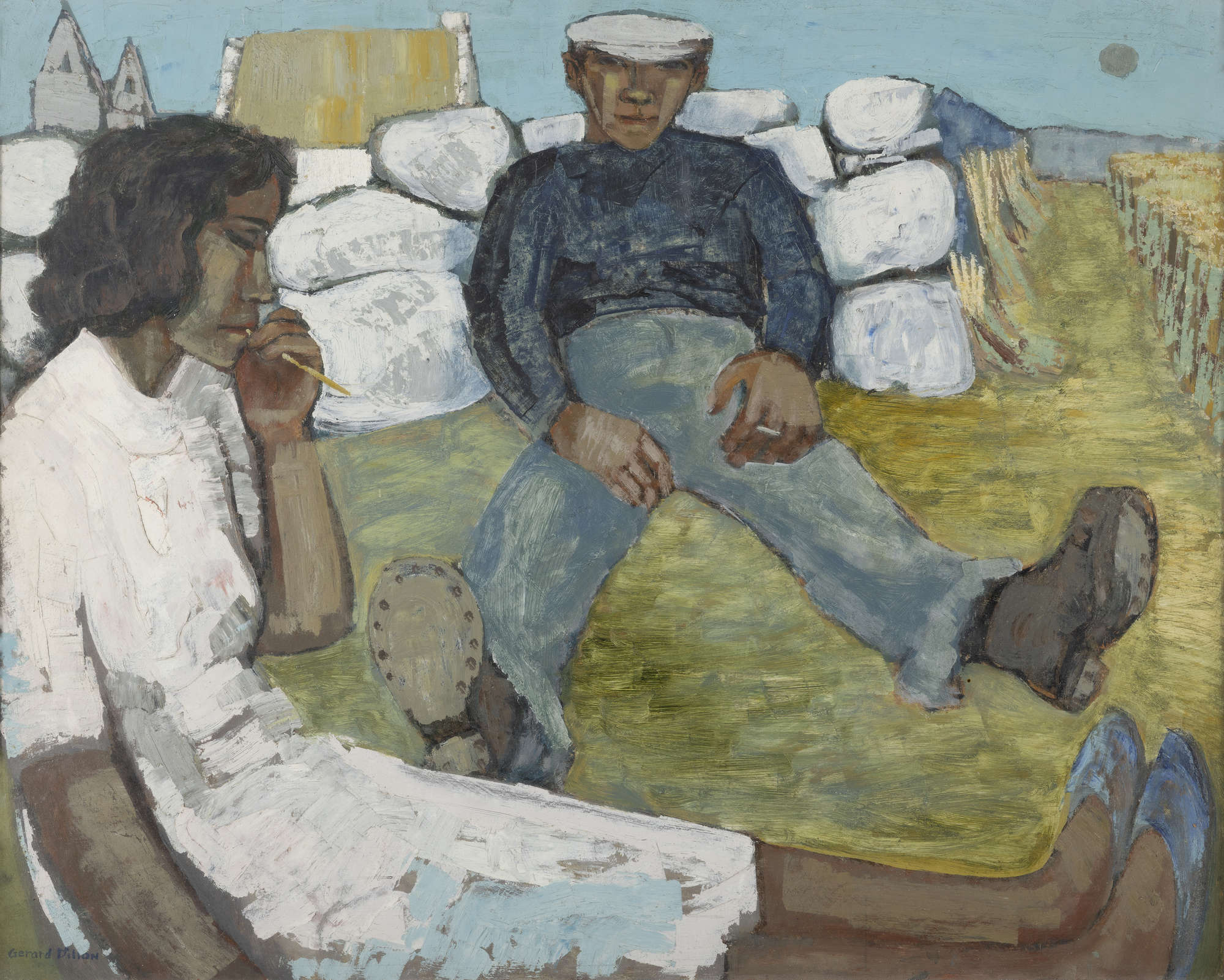 Dillon’s application of paint is quite striking, which makes the painting all the more intriguing. Johnny Conneely’s clothes and the grass which the figures sit upon have been painted with thinned layers of oil paint, giving them a translucent appearance and quality. This is in striking contrast to Nora Conneely’s dress, which has been painted with a deliberate thickness and heaviness, not dissimilar to the texture of the stone wall. Similarly, the sky itself is painted in a similar manner, in a flat cool blue colour. Dillon’s application of the paint is interesting, it is almost as if he is carving out, with paint, the contours of the cottages and the dry stone wall. There is a deliberateness to the marks Dillon makes, doing so in such a quick and confident manner. The bundles of wheat stems to the right of Johnny give an insight into the realities of the west of Ireland, as agriculture played a massive role in the way of life in this region, in particular the Aran Islands, where Dillon was known to travel and spend time there. Dillon often depicted similar scenes of daily life in this part of the world, a seen in such scenes as Potato Pickers (1944) or Island People (c. 1950).