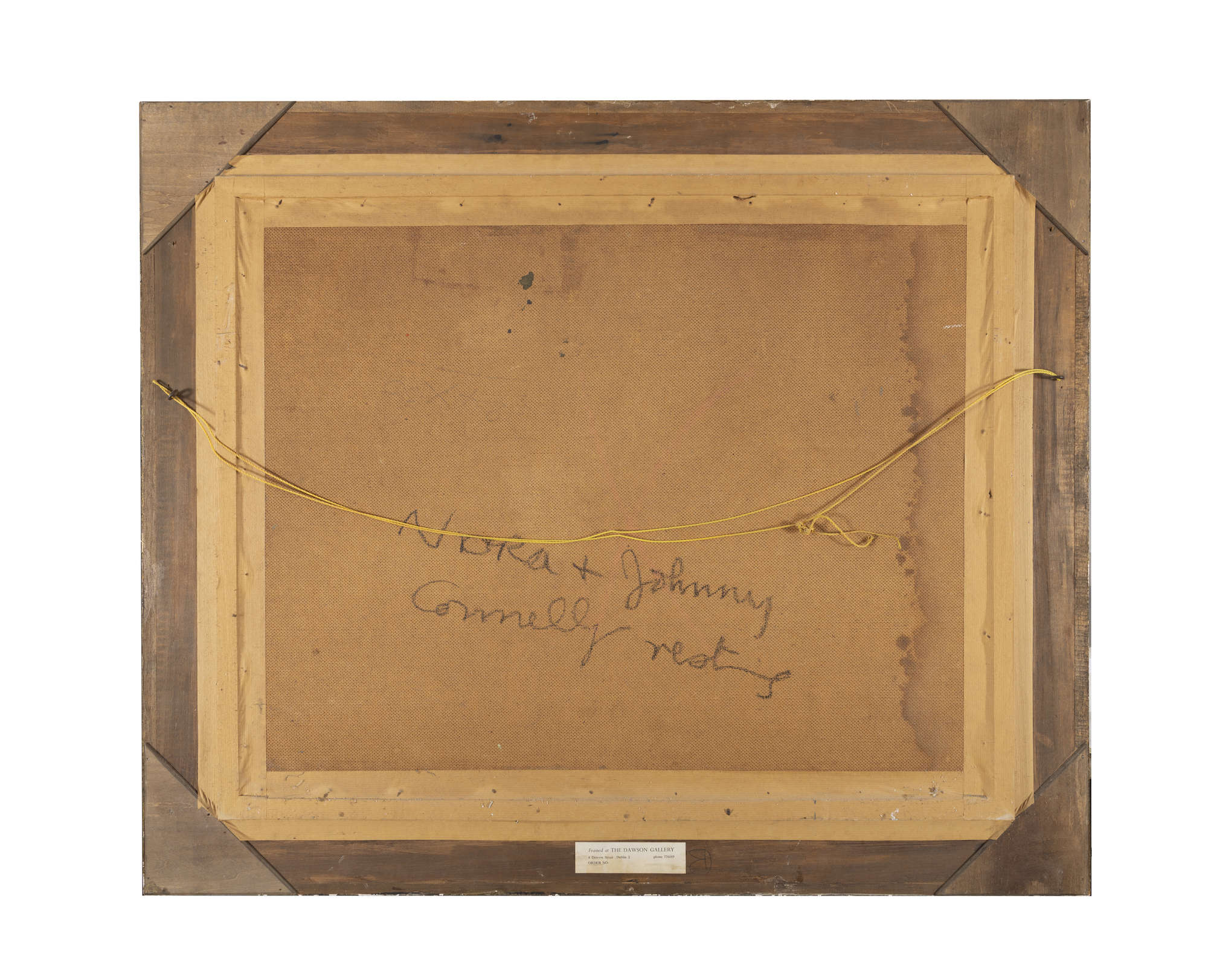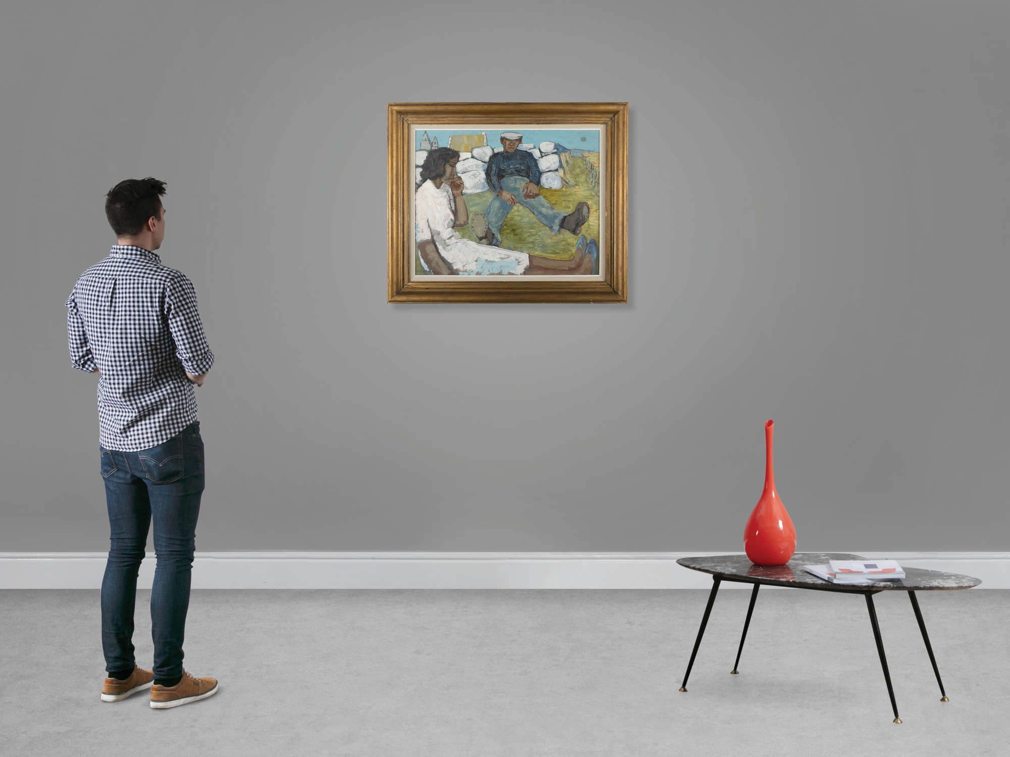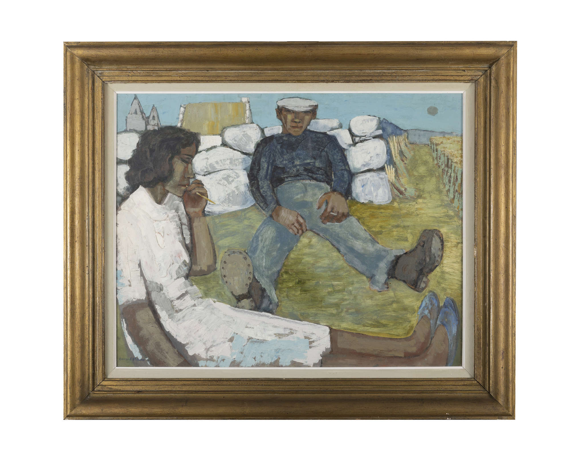 Nora and Johnny Conneely Resting is a stunning oil painting on board by Dillon, featuring an idyllic, intimate snapshot into life in the west of Ireland. Both figures sit with their legs stretched out on the field after what appears to be a long day working. Johnny Connelly sits smoking a cigarette with his back against a dry stone wall, which is synonymous with rural Ireland, along with the cottages that appear in the background of the painting. The figure of Nora Conneely fills the front of the composition, framing her partner and the wheat field to the right of the painting. She chews upon the stem of a wheat stalk taken from the field they are working in, her forlorn expression in contrast to that of Johnny’s, who gazes directly at the viewer.
