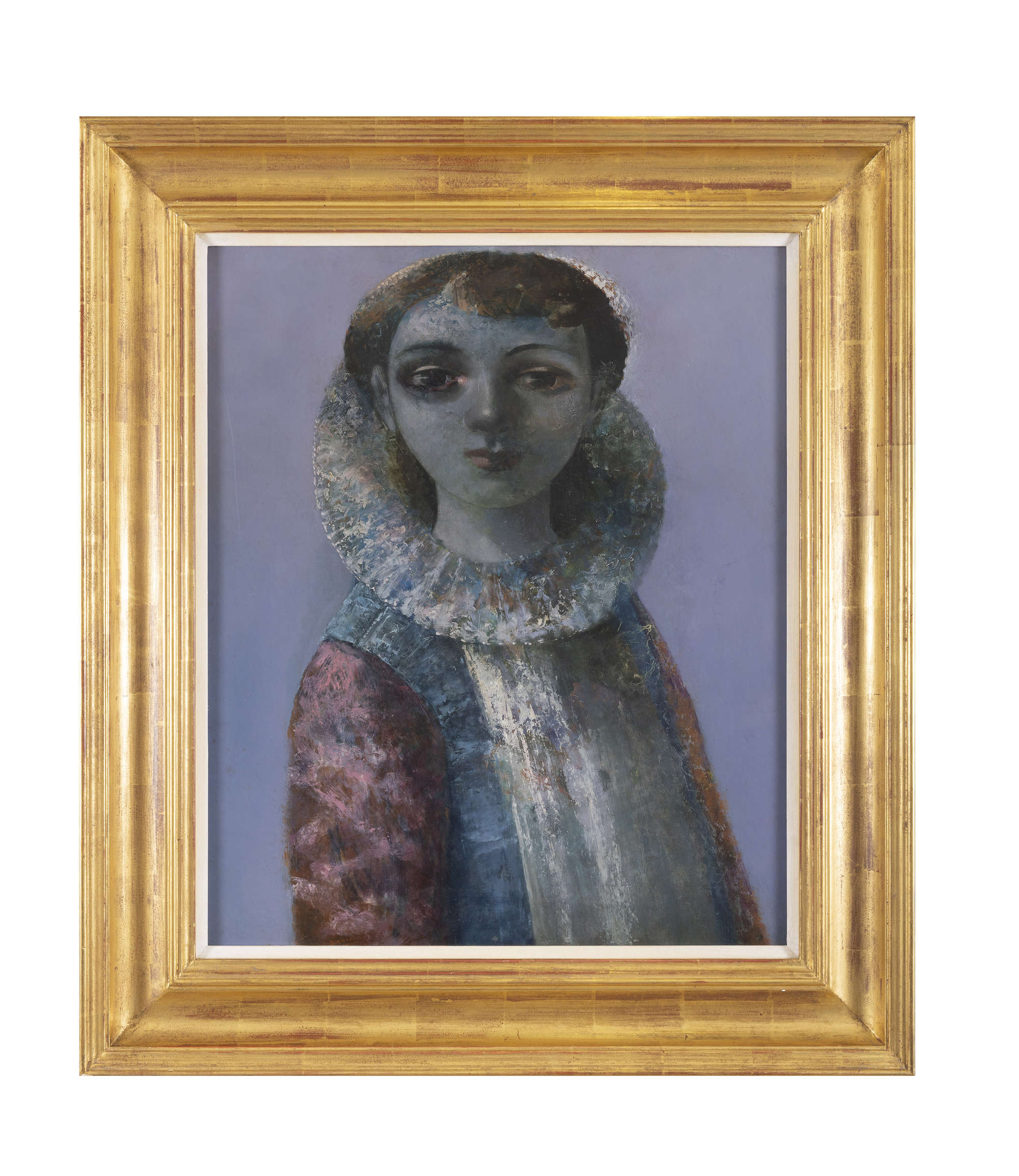 His work is often notable for its wistful, yearning quality, which, together with his great technical skill, has made it particularly popular with a wide audience. Paintings of individual female subjects number among his best works. This timeless painting is one of them. Against a clear, cloudy background, the young woman looks dreamily at the viewer. She seems lost in her own thoughts and memories, a little melancholy, though a smile plays at the edges of her lips. Elaborately, stylishly dressed in several layers and colours, she sports a generous ruff. That, with the rest of her costume, and a certain otherworldly cast to the lighting, tends to place her back in time, through the centuries. O’Neill embellishes fine layers of oil with applications of pure, bright pigment, giving the image a jewel-like shimmer.