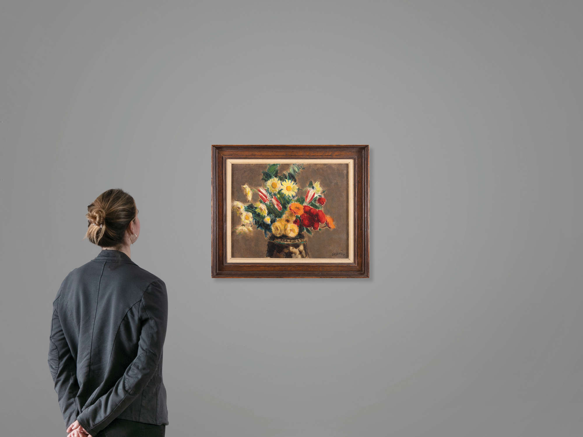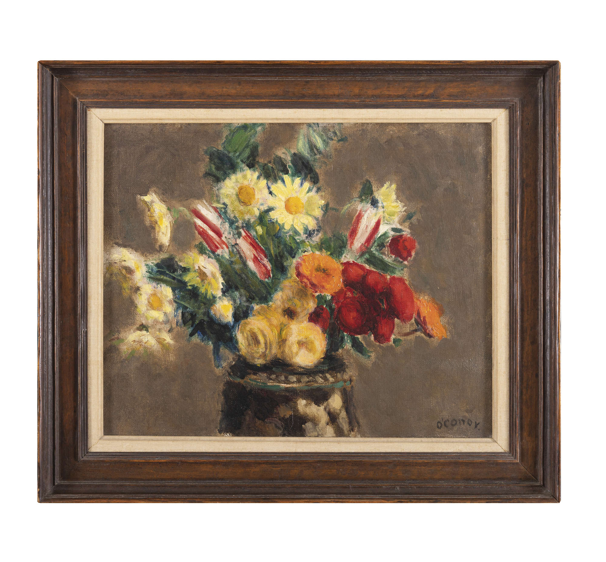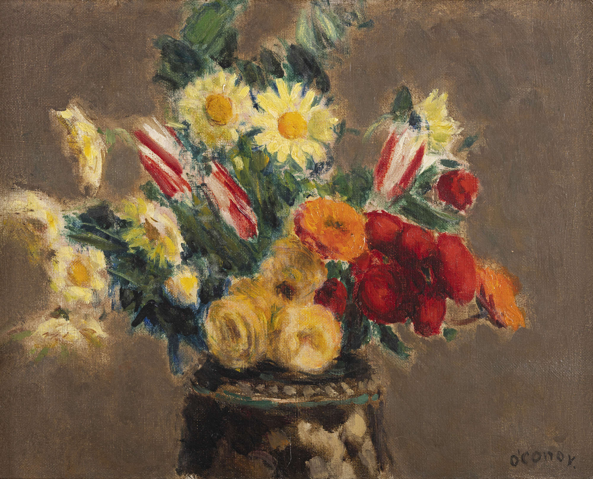 The majority of O’Conor’s flower paintings executed in the 1920s were vigorously and thickly painted with the aid of the palette knife. However, some exceptions to this rule may be noted, one of which is Still Life with Red and Yellow Flowers with its densely packed array of late spring blooms, including poppies, daisies and tulips. Such works are distinguished by the artist’s highly painterly approach, expressed via a rich and varied display of mark-making, from delicately feathered to creamily scumbled blooms, as well as some that are crisply outlined. In this work O’Conor is also careful to pick out the flowers and leaves in bright tints against a contrasting flatly painted background in a neutral tint.