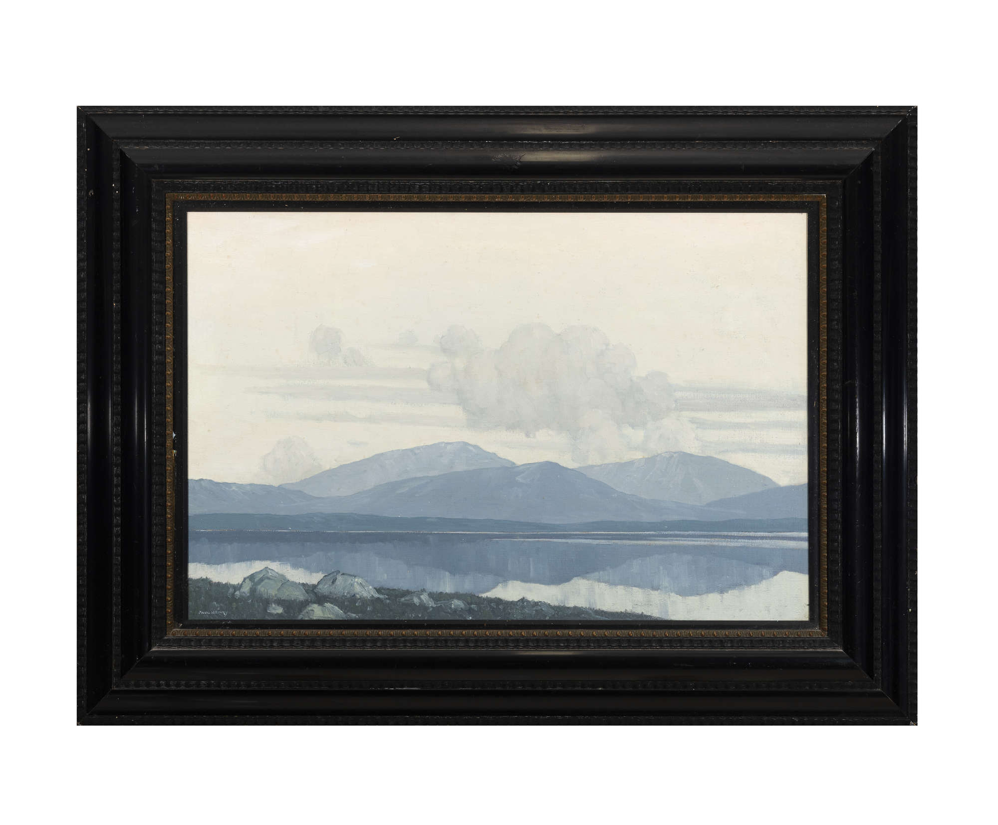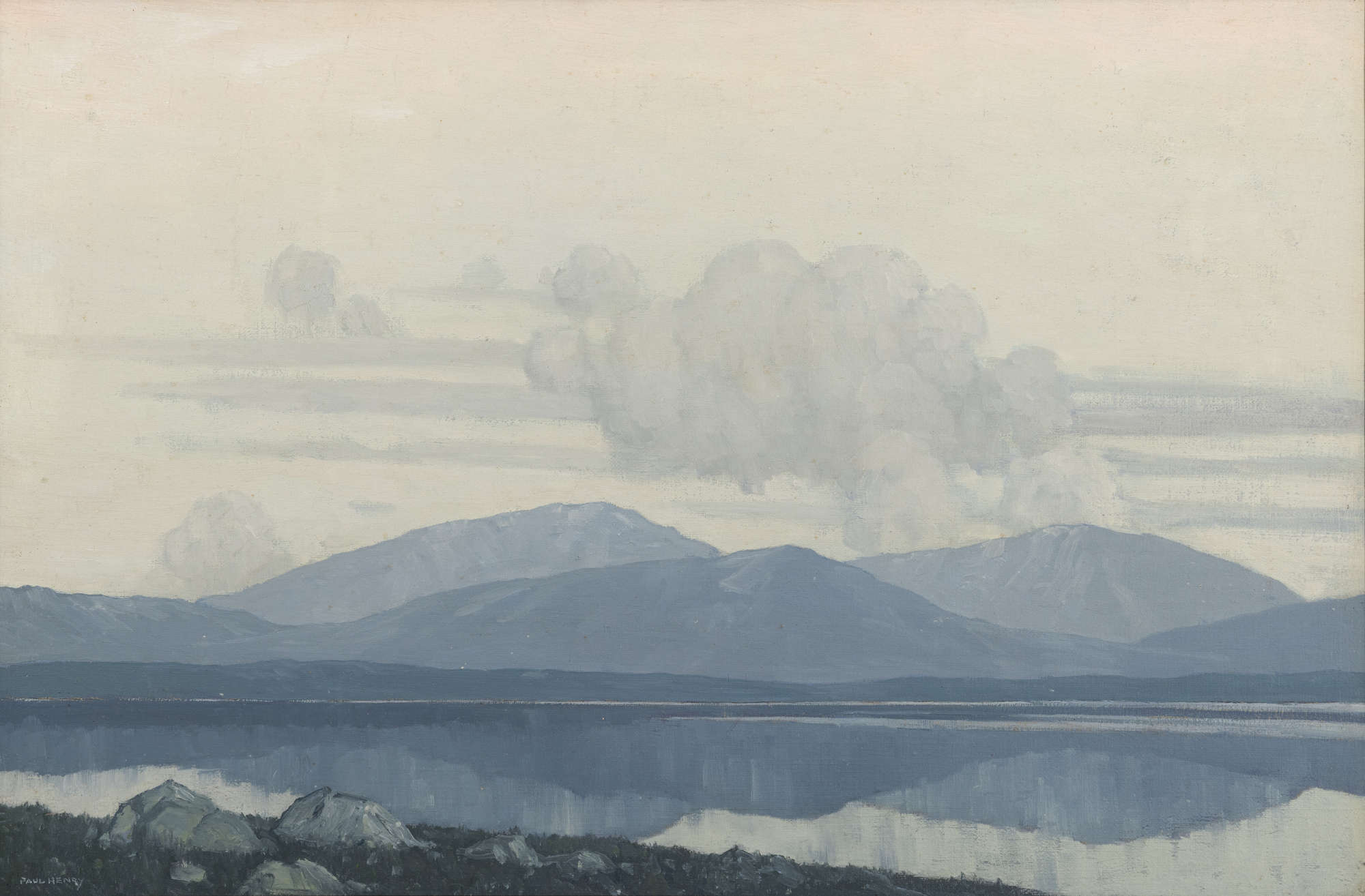 Henry often painted evening scenes, enjoying the changing of the light, as dusk is falling, casting blue and purple shadows across the landscape. A softer light streams through the large billowing cloud passing by the centre, while longer veil-like wisps stretch across the skyline behind. A sense of stillness pervades the scene and he has used a limited palette to distil everything down to the essential elements.