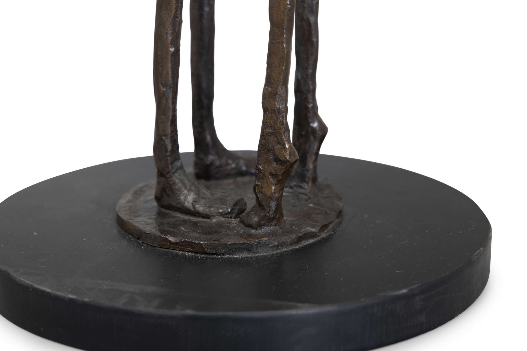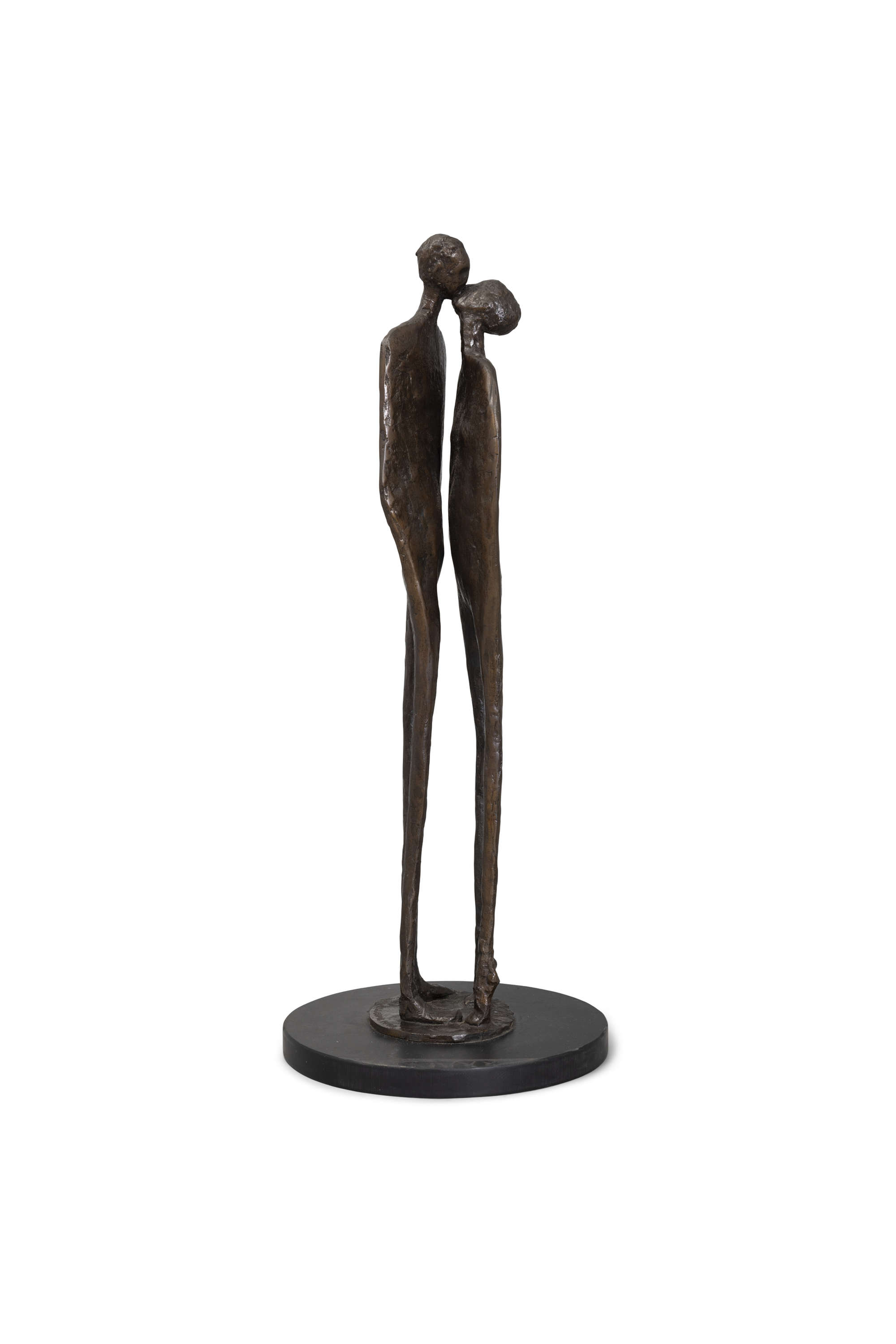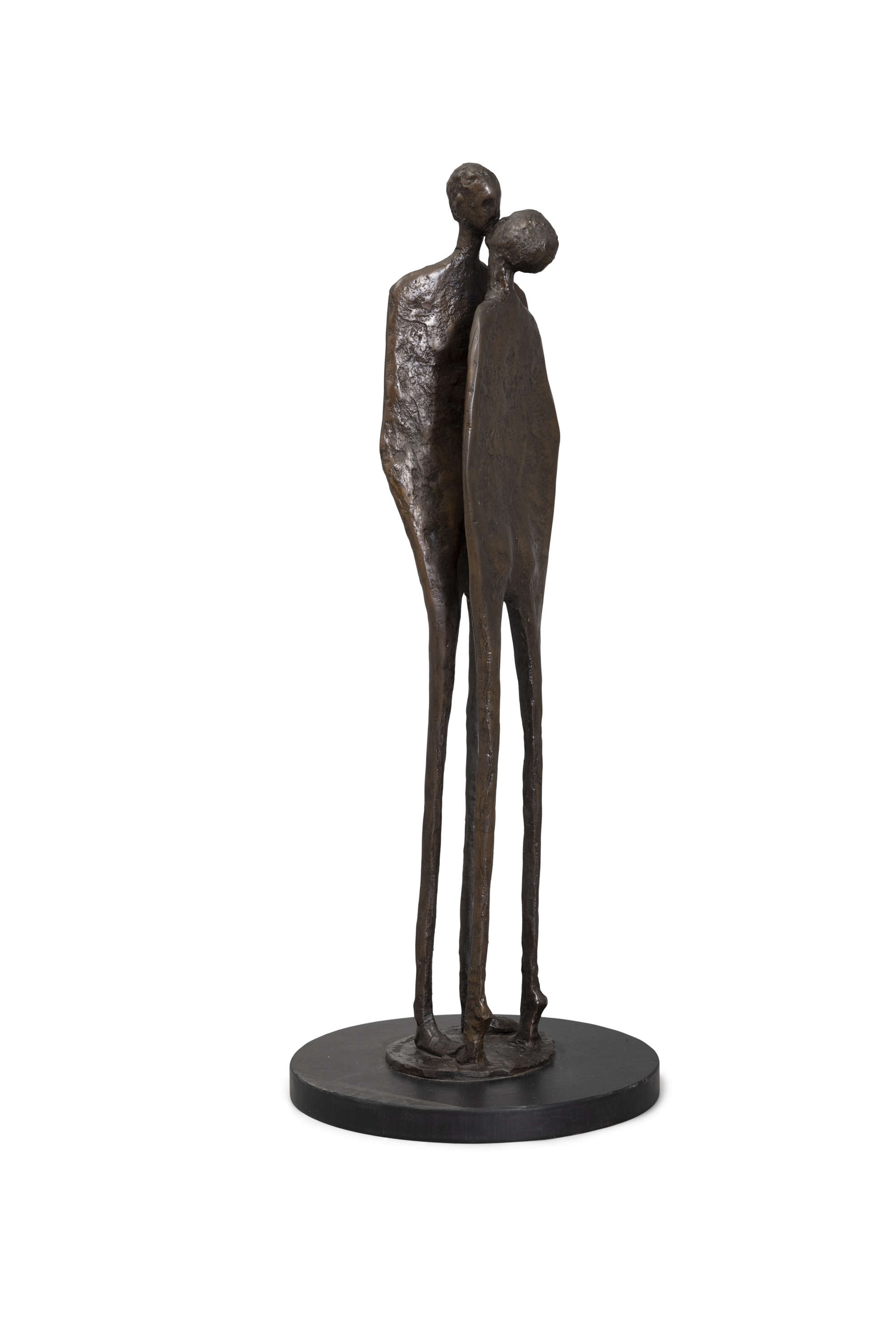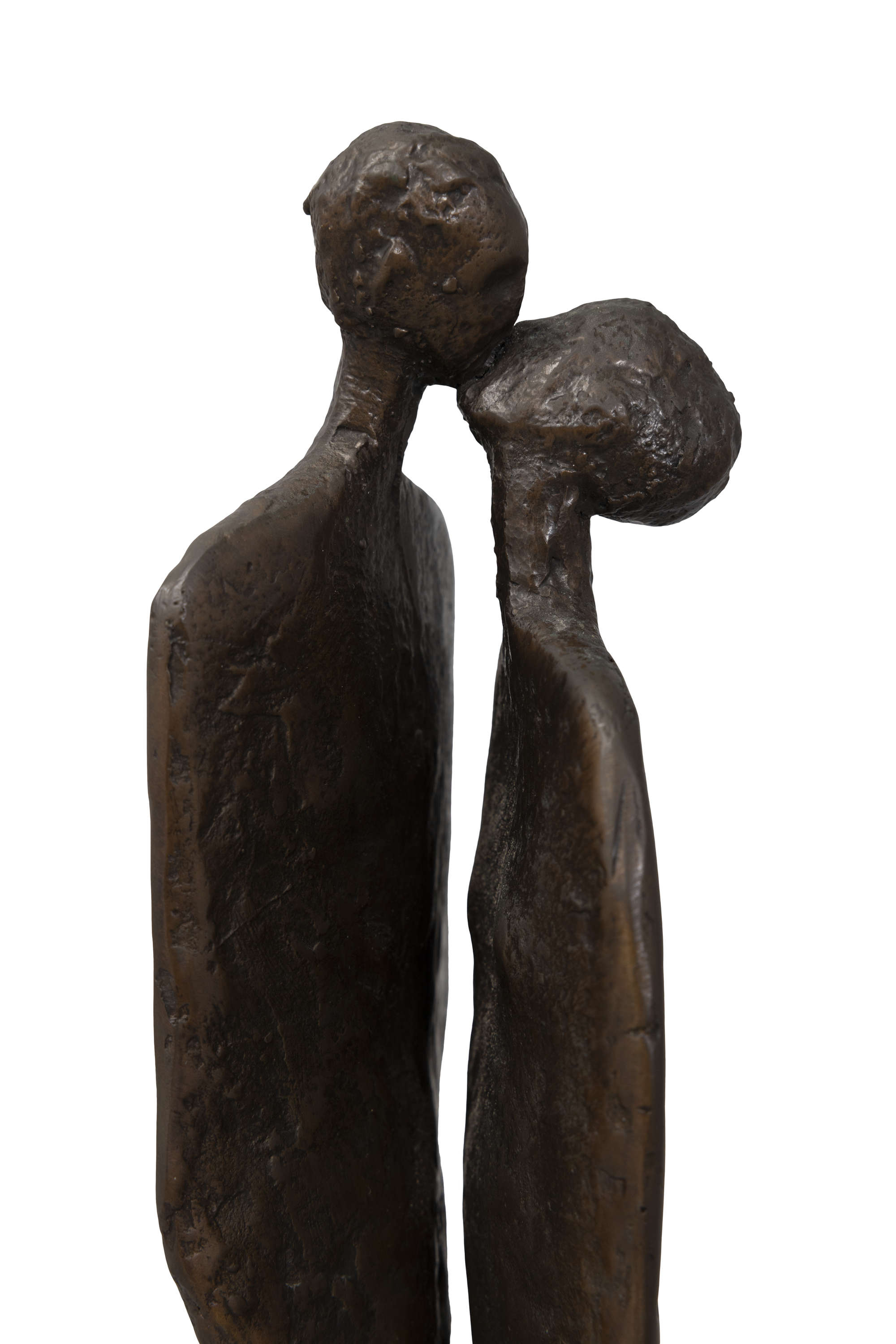 ‘Three sculptors were commissioned by architects Burke-Kennedy Doyle to produce a sculpture each for the new complex opposite the Concert Hall in Dublin. As Rowan was driving past the site one day he saw a young couple kissing. A simple kiss therefore provided the inspiration for what has since become an immensely popular public sculpture. The pedestal is only slightly raised above the ground, so that the figures may more readily be identified by their fellow man. The lips do not quite touch, creating the deeply personal space of a shared breath. Khalil Gibran’s book ‘The Prophet’ was foremost in Rowan’s mind as he portrayed two people growing together gently like the trees in a forest, in stark contrast to ‘The Lovers’, Edvard Munch’s aggressively violent kiss in which the vampire-like girl virtually consumes her beau in a frenzy of passion.’
