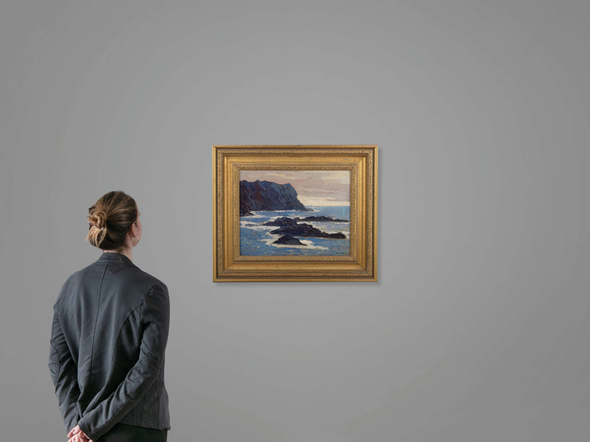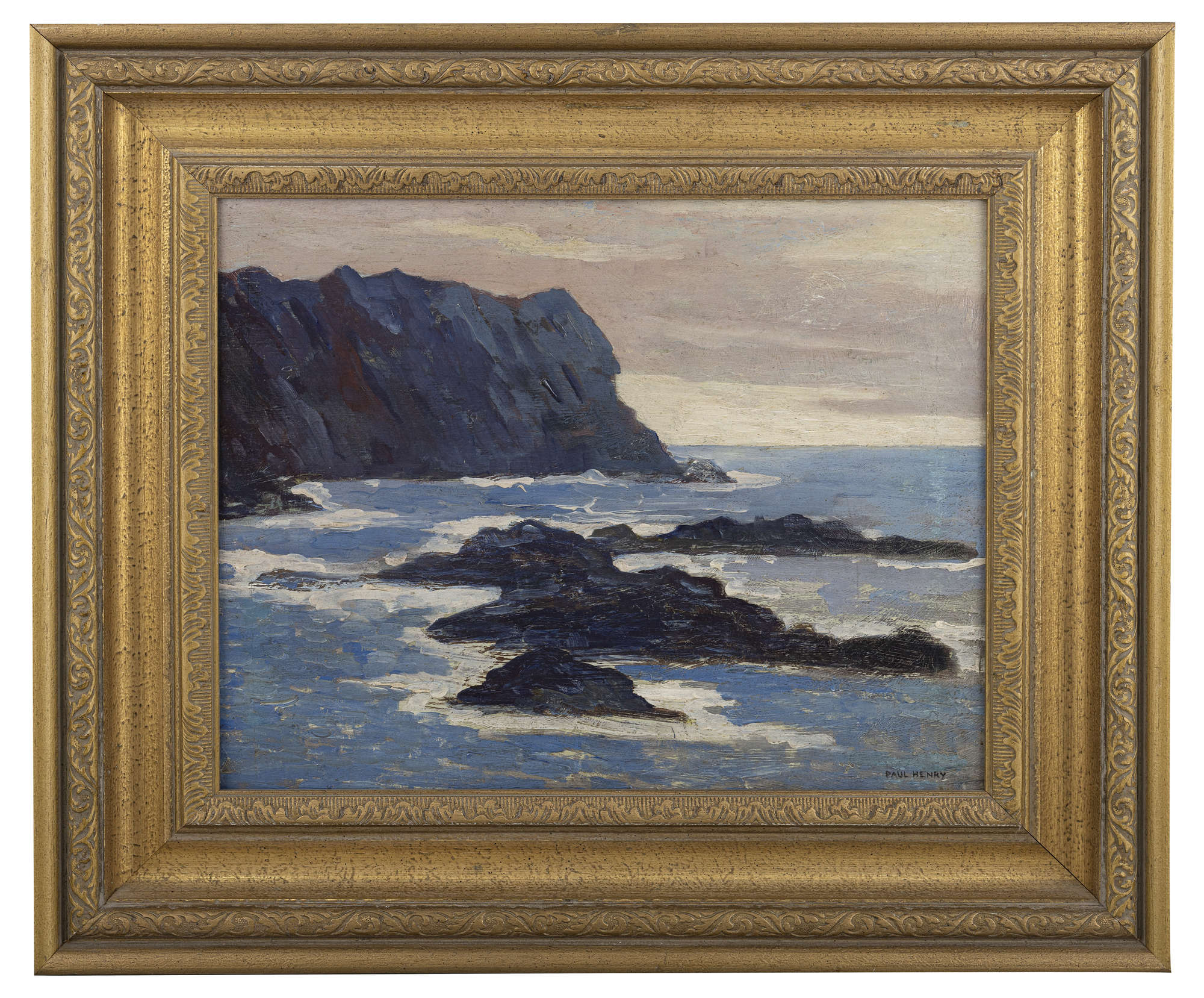 The painting on the reverse is a view of the Menawn Cliffs and Dooega Head from near Keel, on Achill Island. A similar view, Cliffs and Sea, (SBK, #323) was identified as Menawn Cliffs by the late S.B.Kennedy and sold in these rooms in 1980 and is dated to 1912 – 15. Not as monochromatic as some of his work of this period, the present work is imbued with rich colours, the pink and white sky, the hulking mass of the cliffs painted in hues of dark blue and umbers, and the white surf modelled with Henry’s signature translucent glazes.