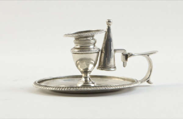 A GEORGE III MINIATURE CHAMBER CANDLESTICK OF BALUSTER FORM, Paul Storr, London, 1801, 4.5ozs, the detachable drip pan with gadroon rim, urn shaped sconce, circular base with c-scroll handle, matched snuffer.