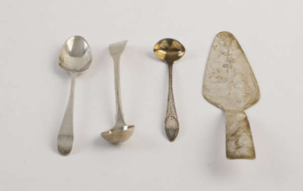 A MISCELLANEOUS COLLECTION OF SILVER, comprising a provincial Carden and Williams of Cork bright-cut engraved salt spoon with gilt bowl; a modern trumpet shaped vase, Birmingham, 1978, weighted, 21.5cm high; and various other spoons, etc.