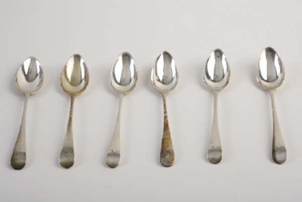 A SET OF SIX GEORGE III OLD ENGLISH PATTERN TEASPOONS, makers mark rubbed, London, 1812, 3.5ozs, the plain tapering handles with engraved initials.