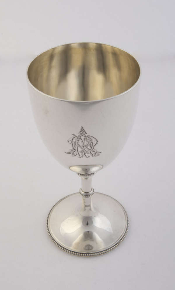 A LARGE VICTORIAN PLAIN CIRCULAR GOBLET, London, 1865, 10ozs, with beaded rim to spreading pedestal foot. 22cm high.