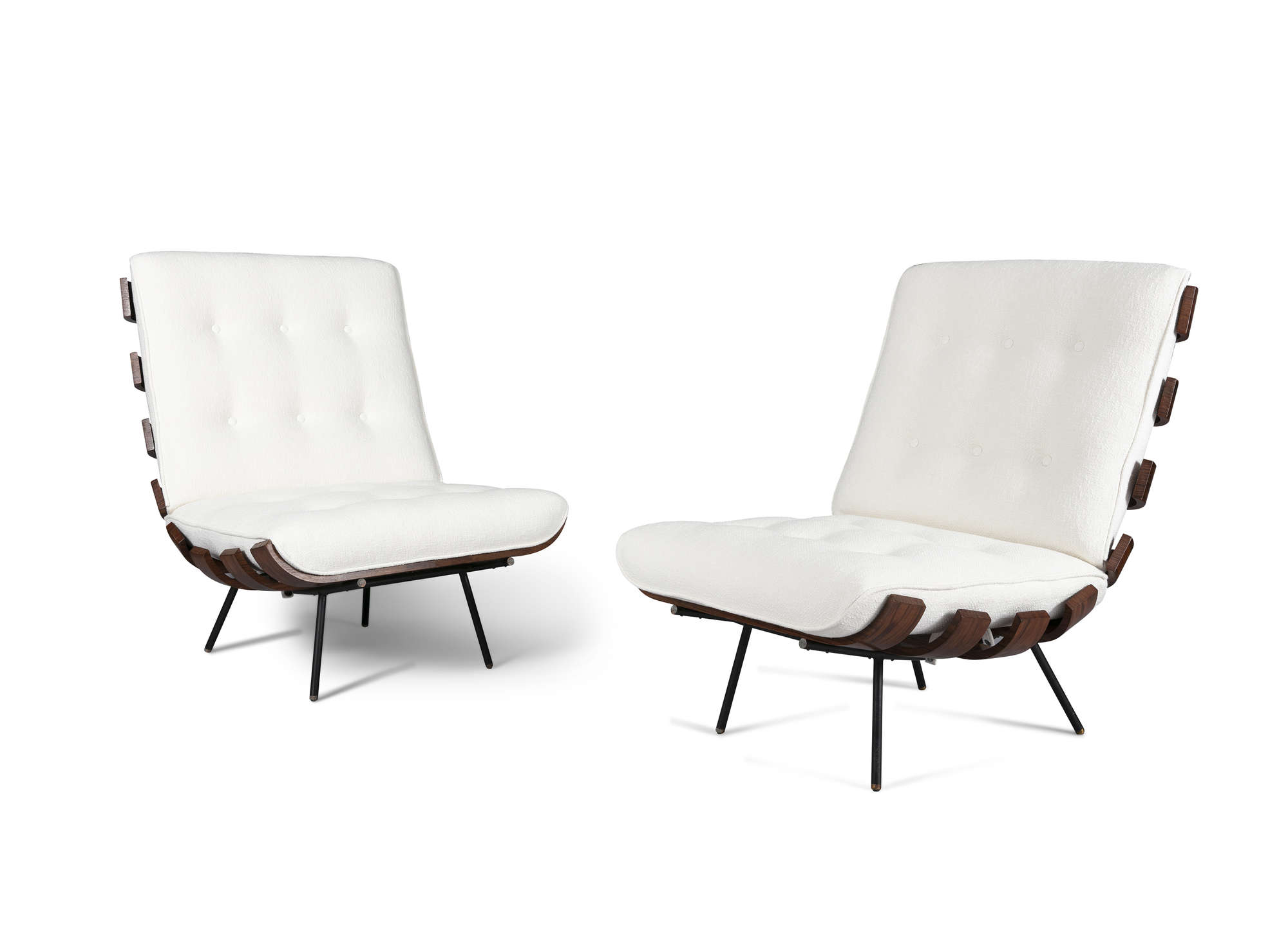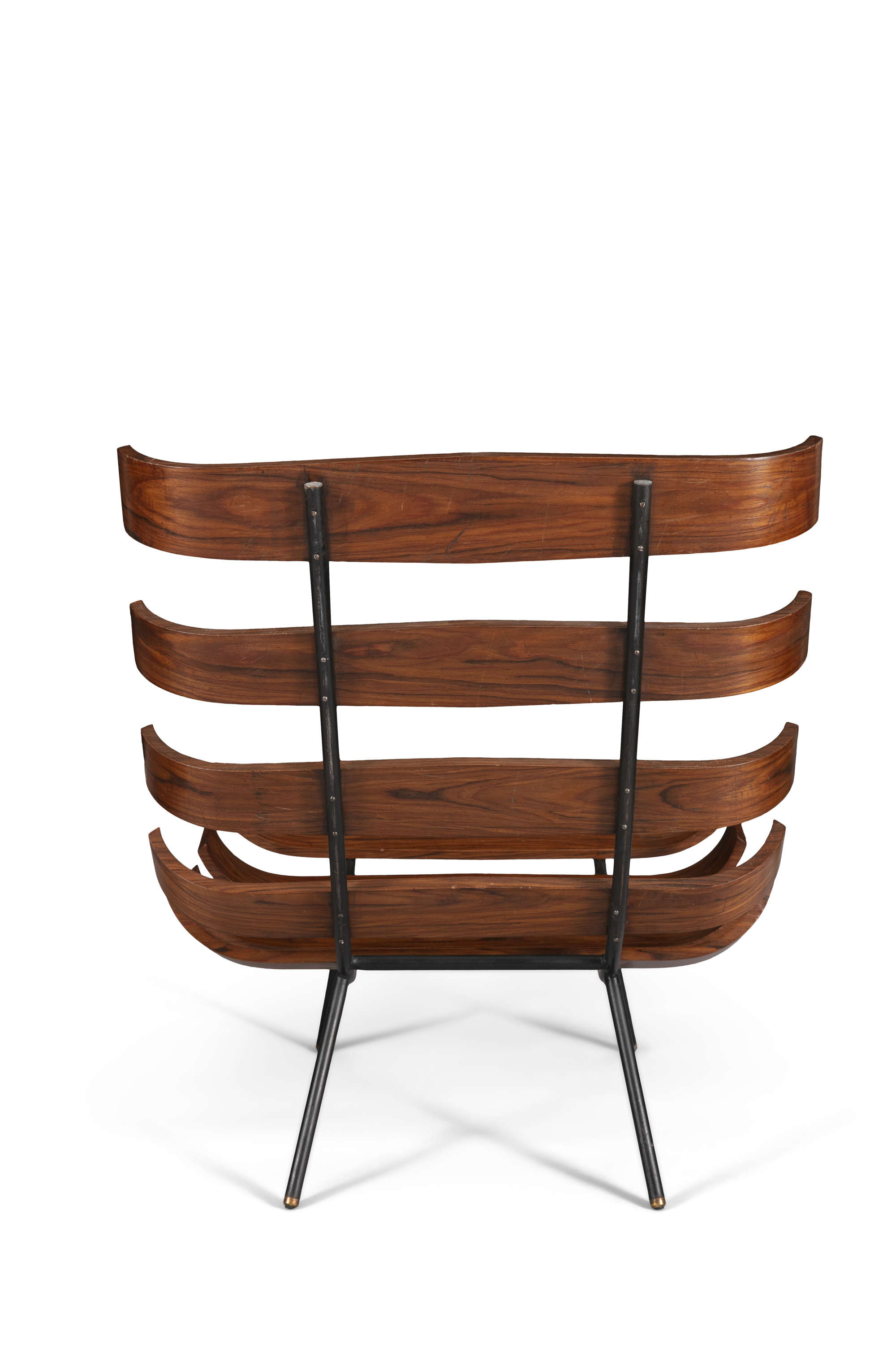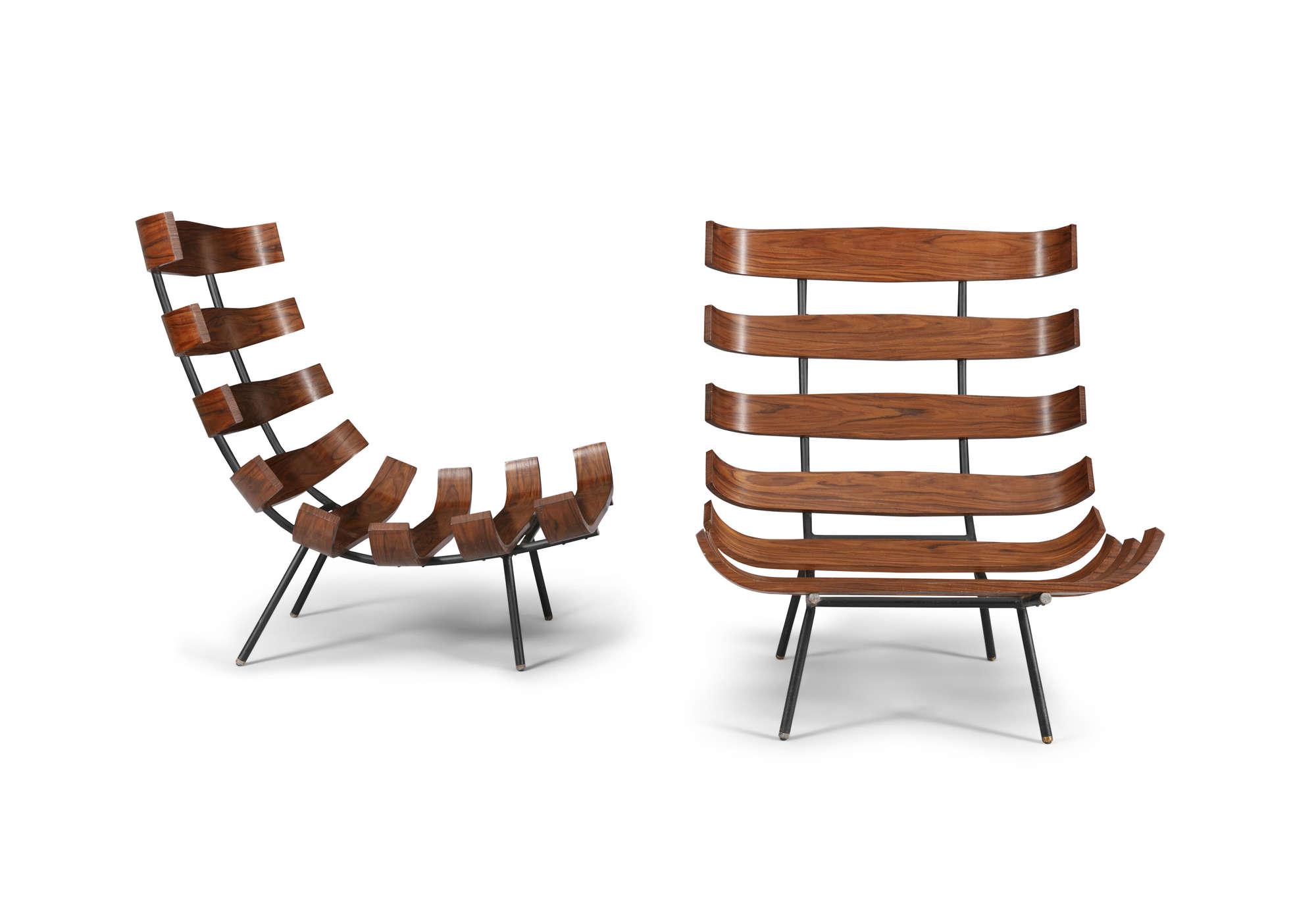 A pair of Costela 'Rib' chairs by Martin Eisler and Carlo Hauner, in Brazilian Imbuia wood and metal, c.1960, 73.5 x 71 x 73.5cm