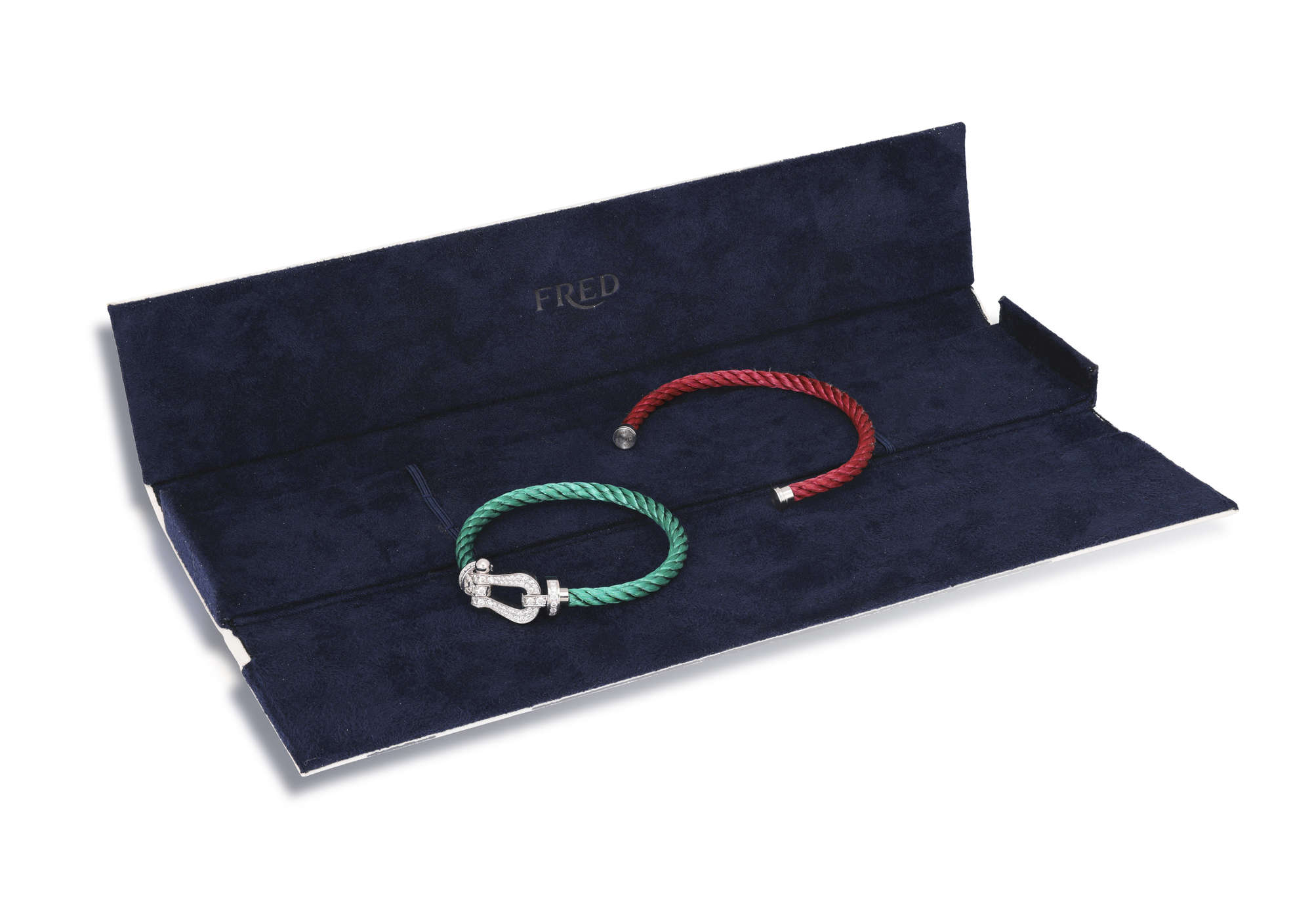 The 18K gold buckle pavé-set with brilliant-cut diamonds, with interchangeable green or red woven steel sailing cable, signed Fred, numbered, with maker's mark for 'FP' for Fred Paris, with maker's case, length 17cm