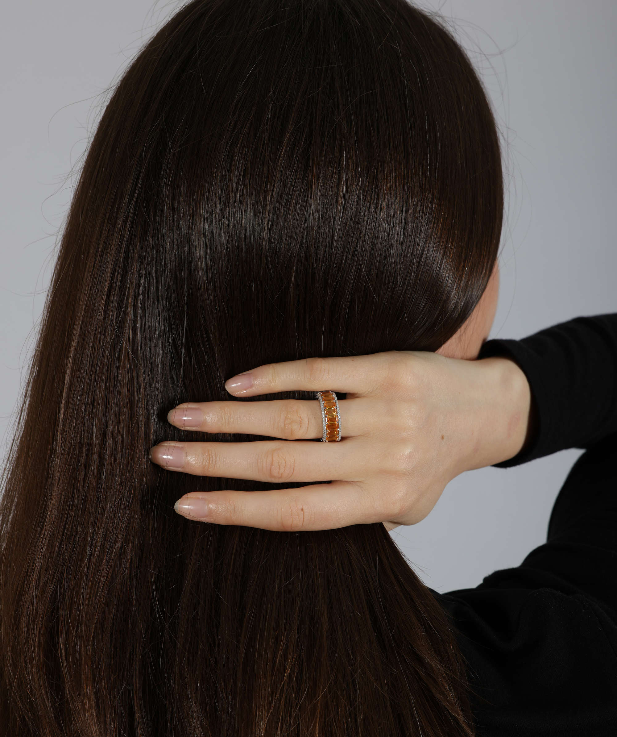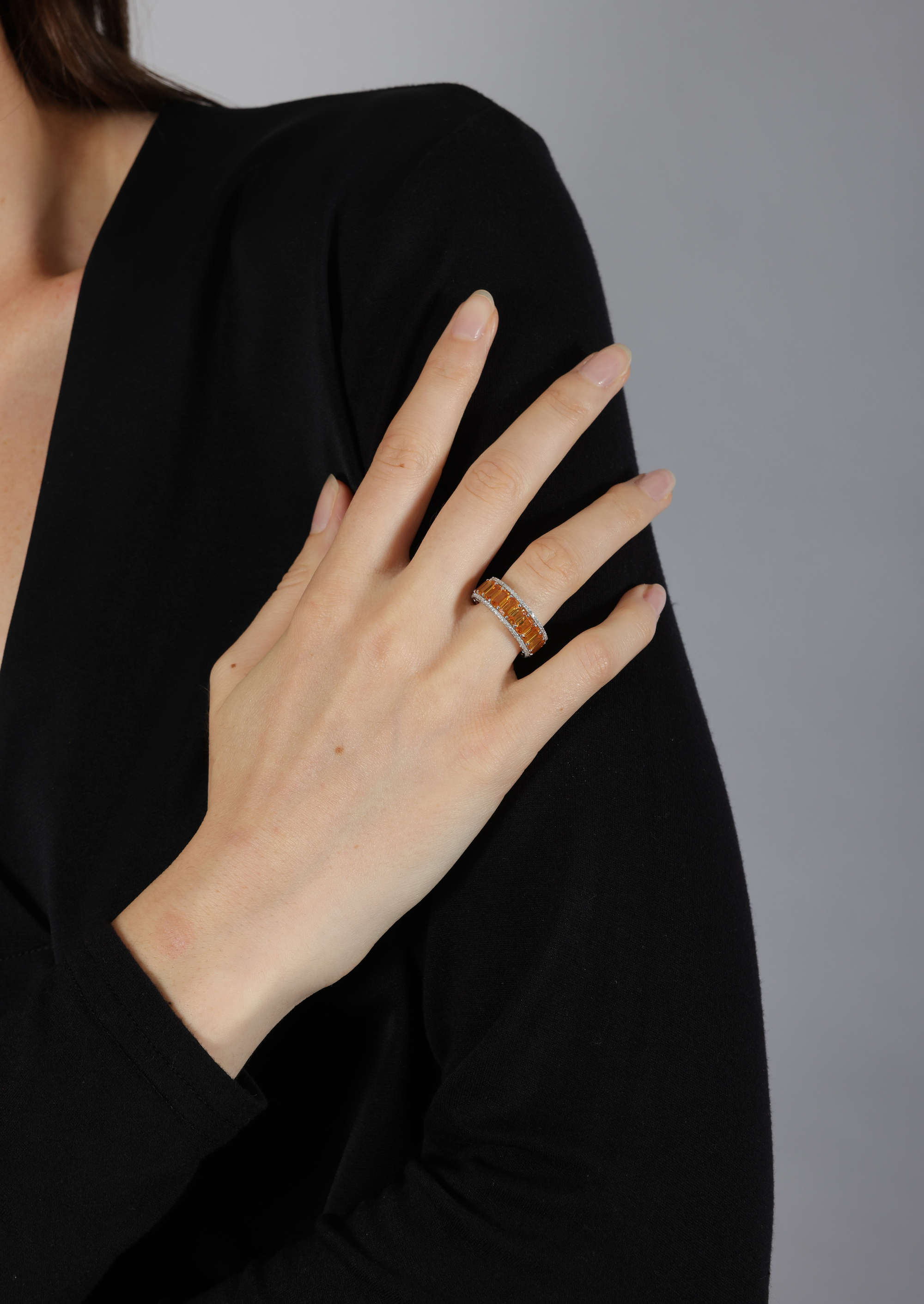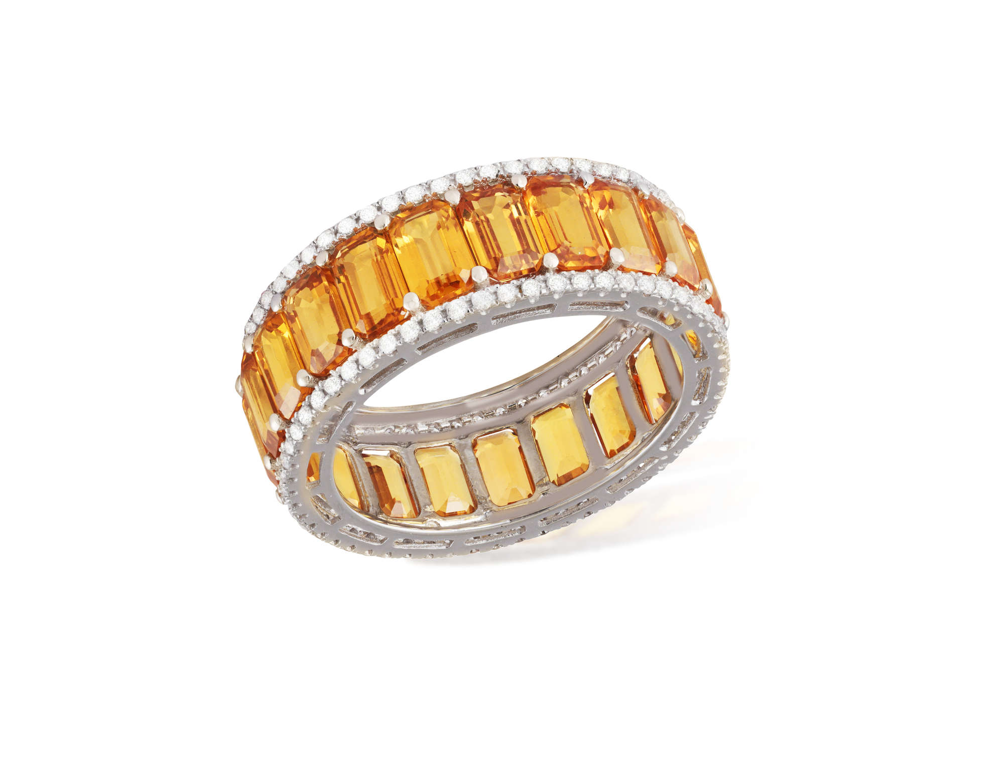 Composed of a continuous row of cut-cornered rectangular orange sapphires, between brilliant-cut diamond borders, mounted in 18K gold, sapphires approximately 7.00cts total, ring size K¾