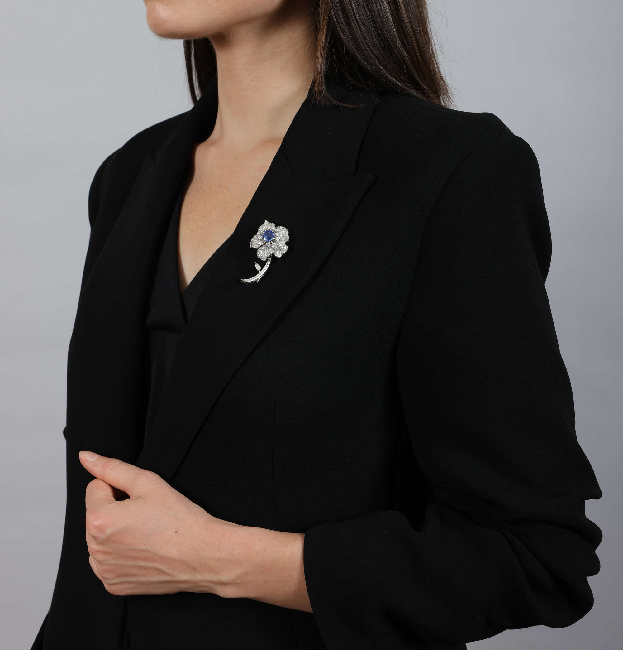Modelled as a stylised flower, centring a cushion-shaped sapphire weighing approximately 3.00cts, within a surround of brilliant-cut diamond pistils, the petals pavé-set with similarly-cut diamonds, to a marquise-shaped diamond leaf and tapered baguette-cut diamond stem, mounted in platinum and 18K gold, diamonds approximately 6.00cts total, indistinct partial maker's mark, French assay marks, length 4.8cm