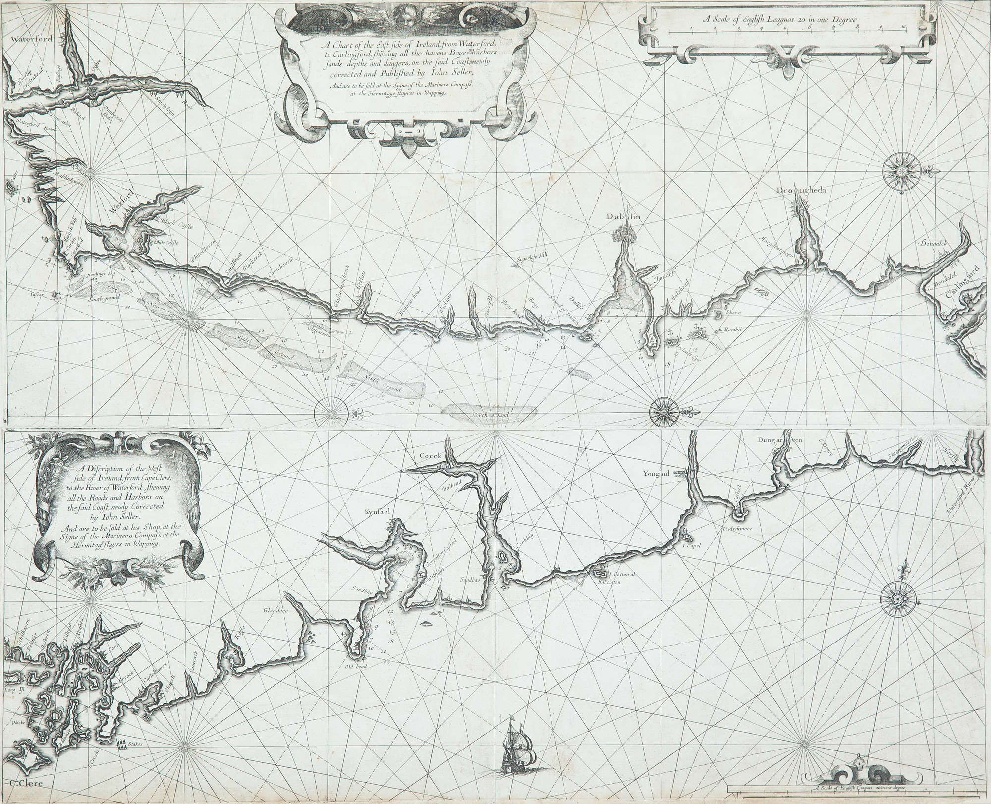 (ii) This covers the south coast of Ireland from Cape Clear to Waterford. It is entitled in a cartouche of strap-work and fruit, in the top left corner "A Discription of the West side of Ireland from Cape Clere to the River of Waterford, shewing all the Roads and Harbors on the said Coast, newly Corrected by Iohn Seller. And are to be sold at his Shop, at the Signe of the Mariners Compass at the Hermitage stayrs in Wapping." Note that the title mentions the west coast for what is really the south coast. There is one compass rose showing north to the top, and one ship, but no scale of latitude or longitude. The scale in the lower right corner reads "A Scale of English Leagues 20 in one degree [10 = 132 mm.]." 545 x 215 mm.
